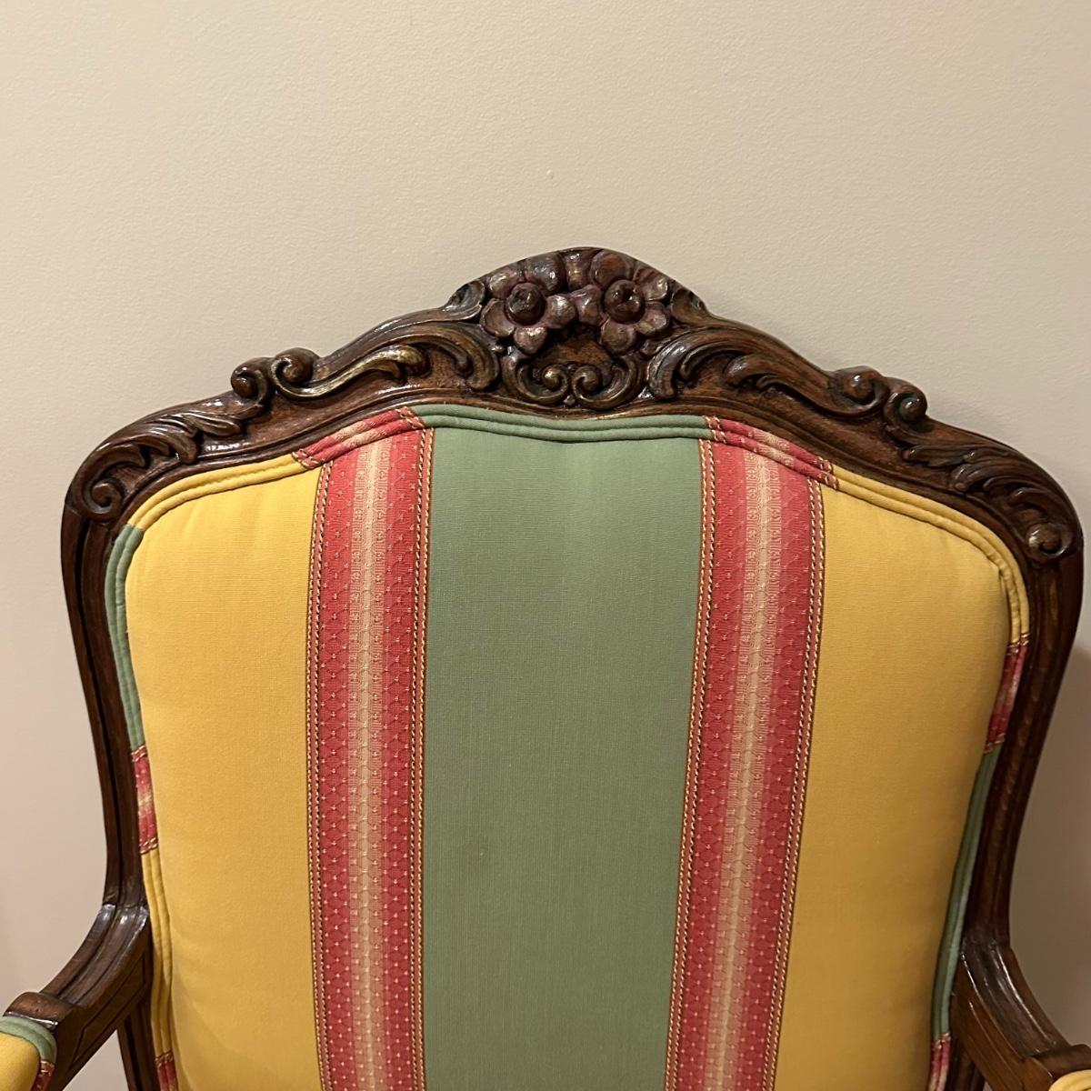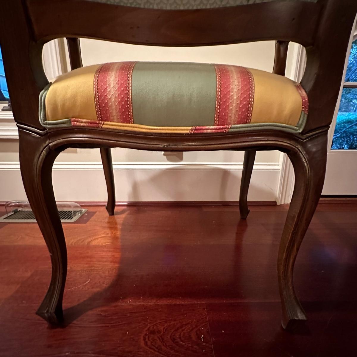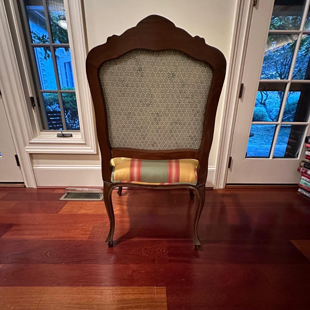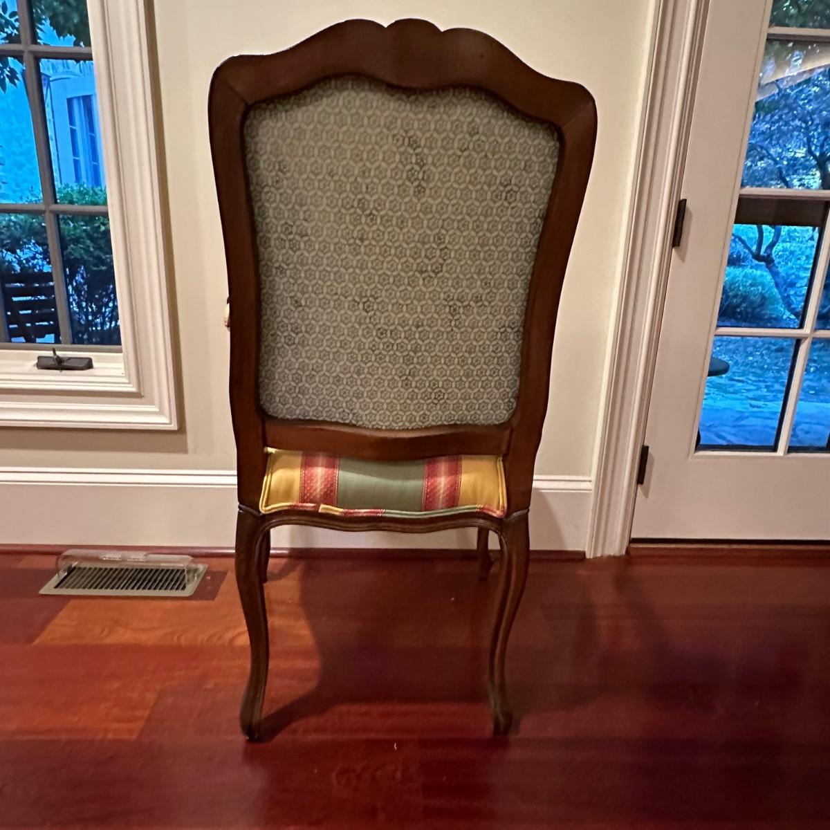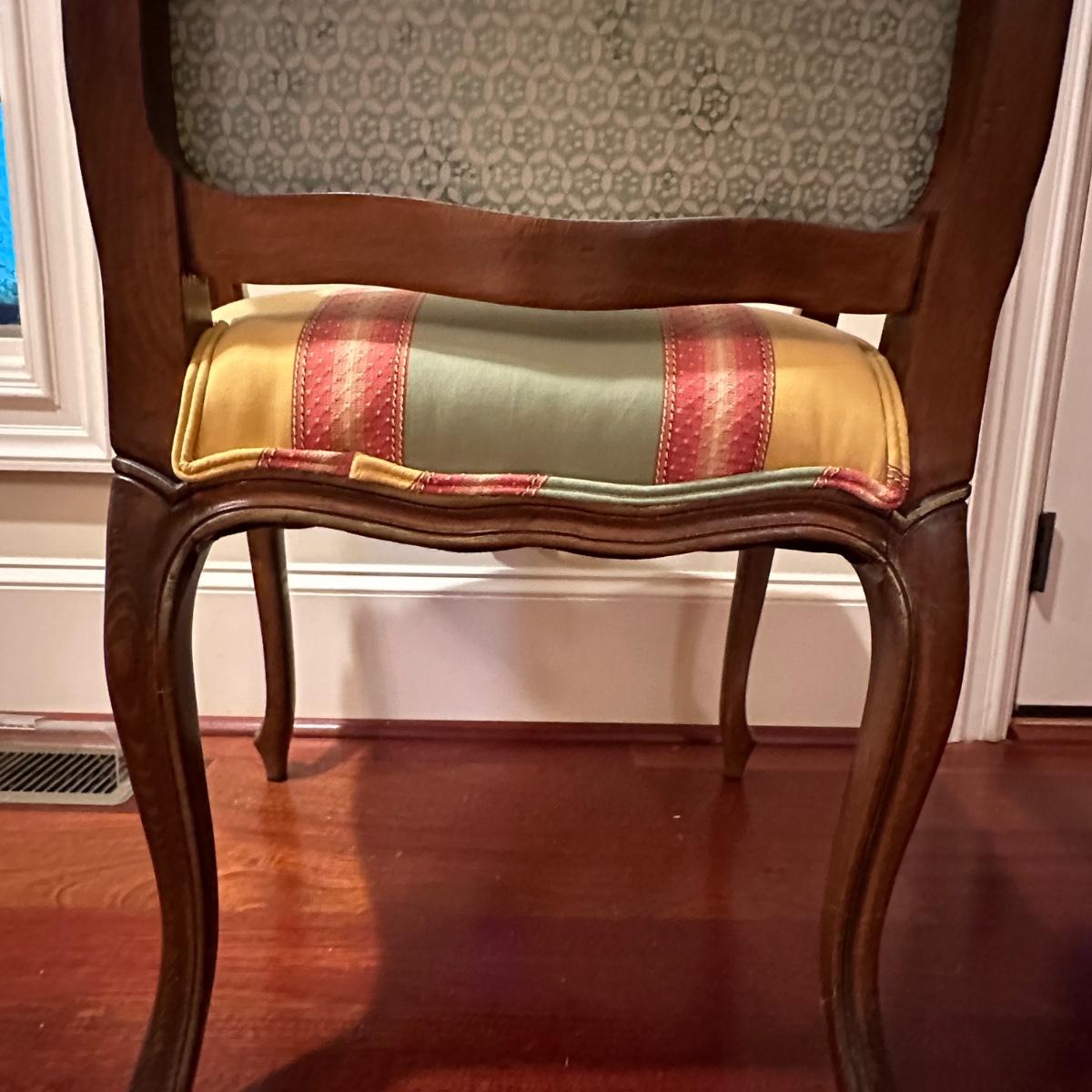 Pair of carved, upholstered side chairs. The carving on each chair is slightly different. They both measure 22.5” x 20.5” x 40”H. Seat height is 19.5”. Local pickup only.