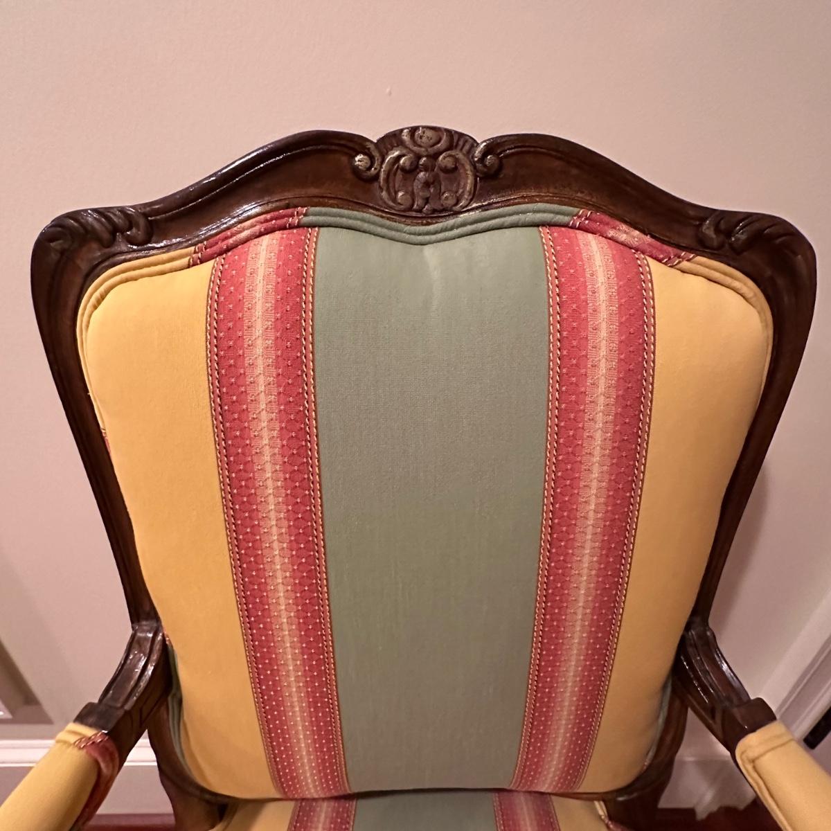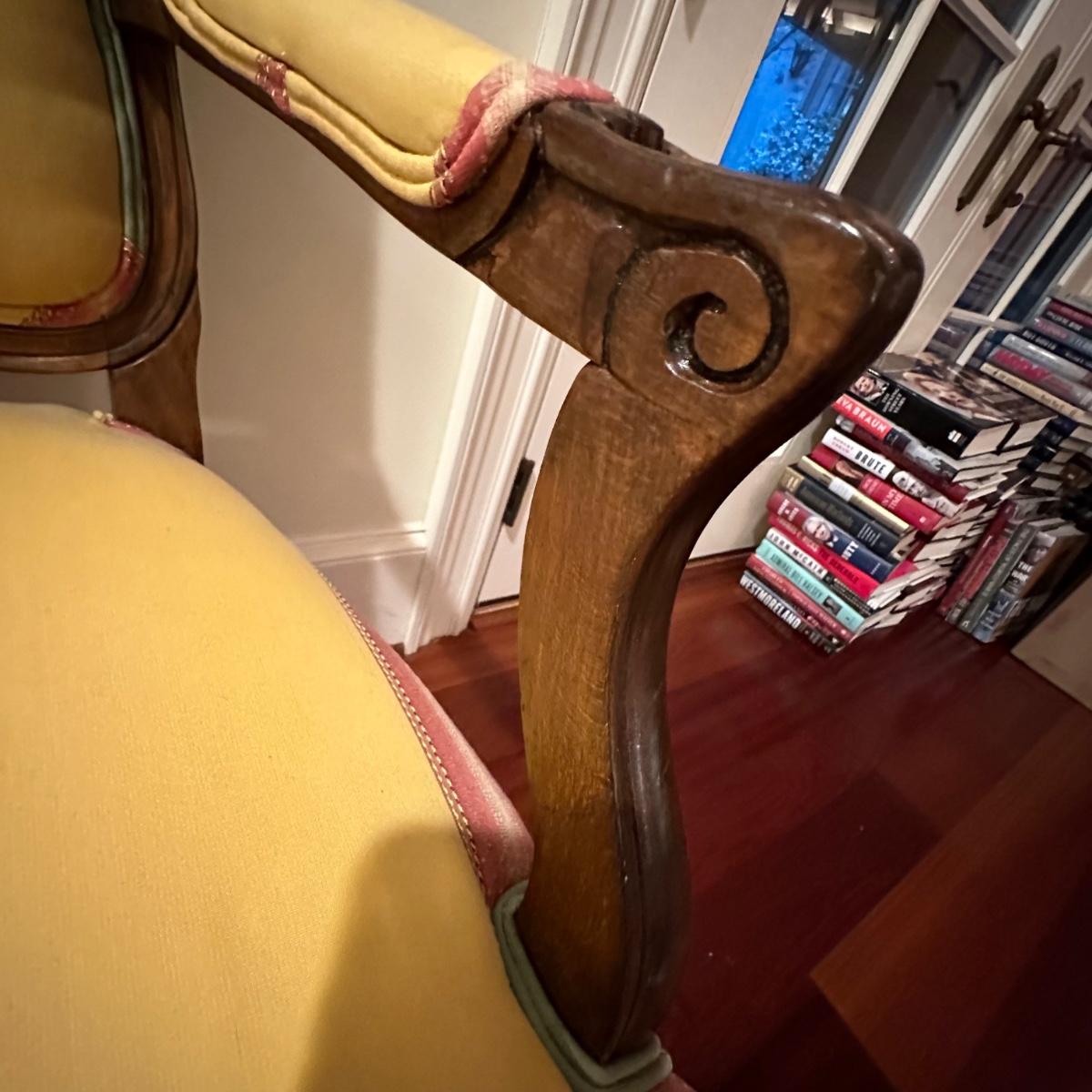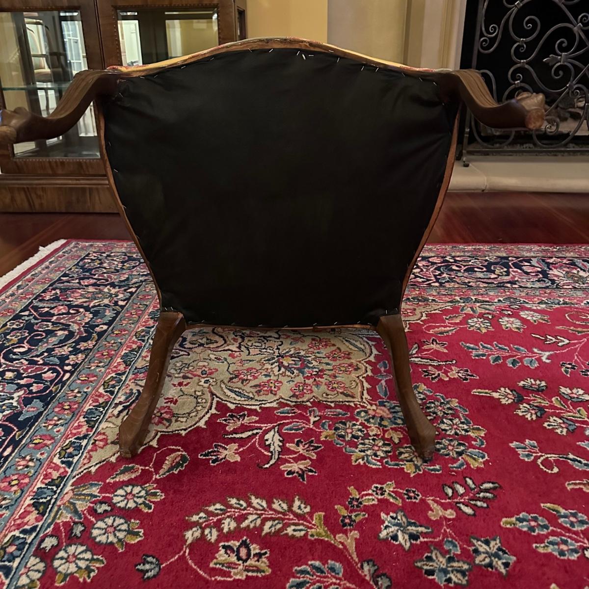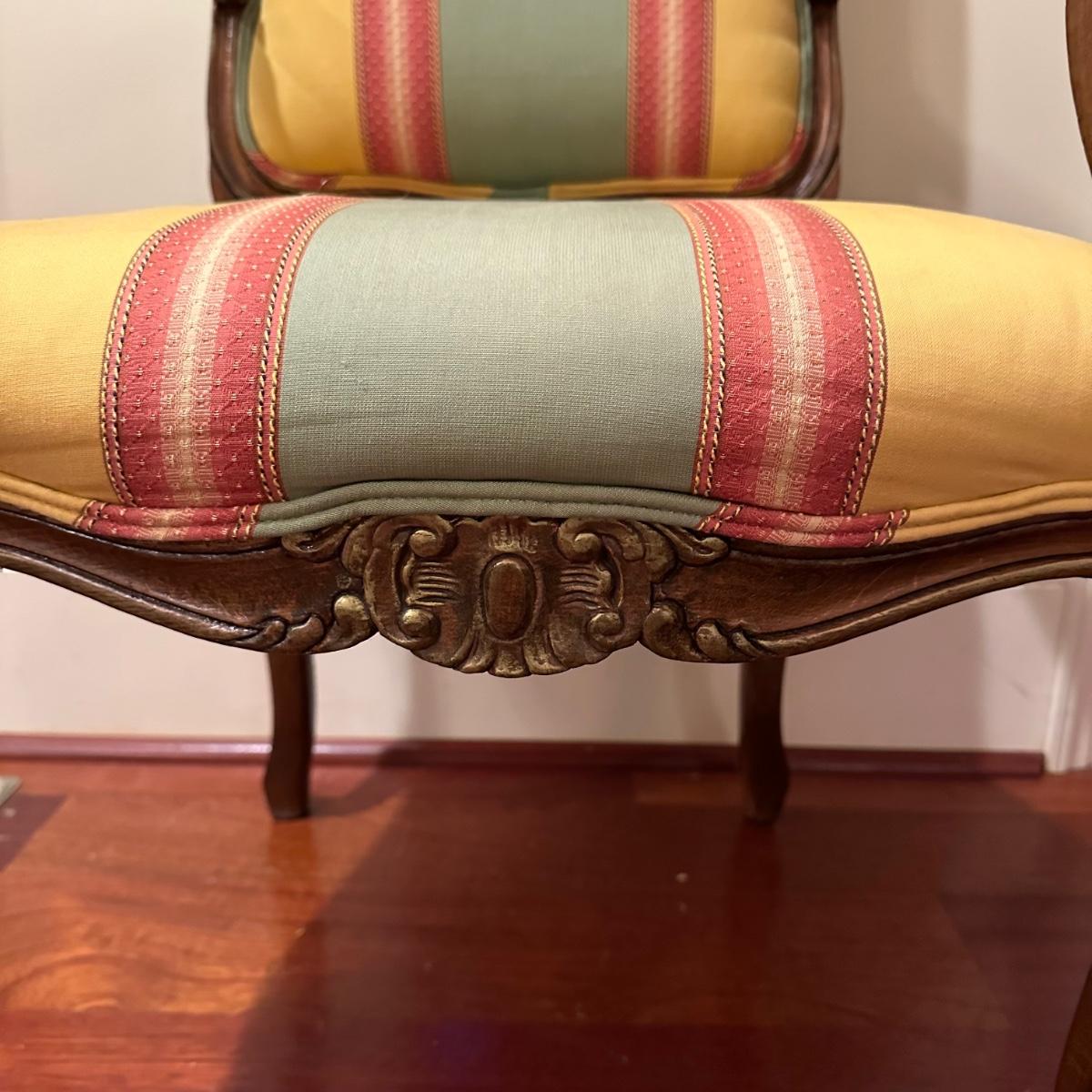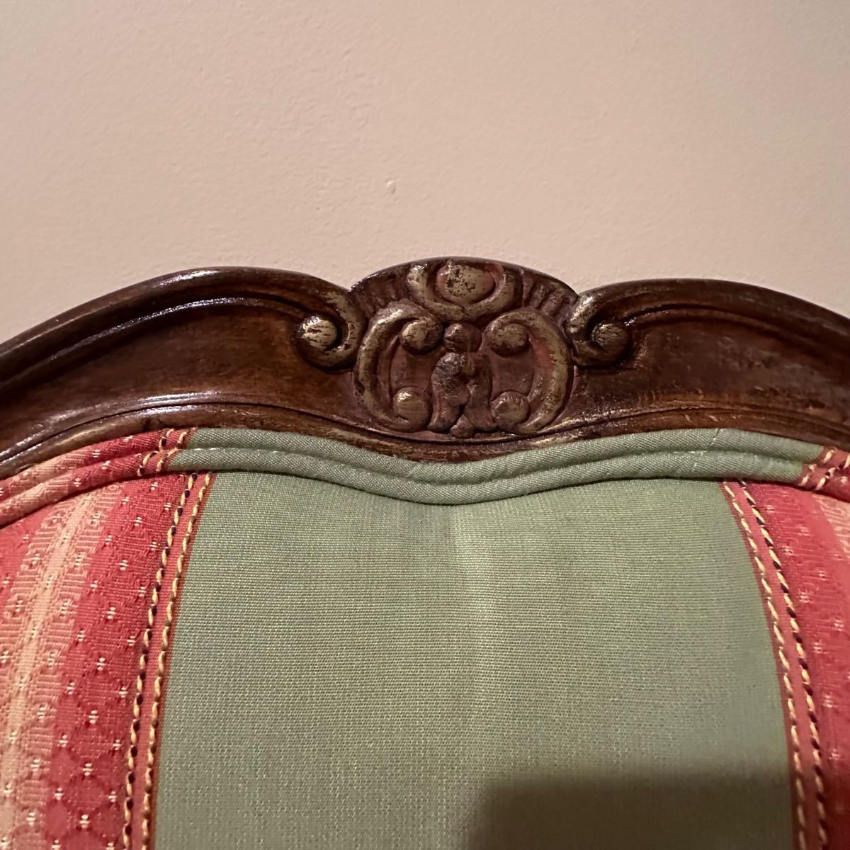 Pair of carved, upholstered side chairs. The carving on each chair is slightly different. They both measure 22.5” x 20.5” x 40”H. Seat height is 19.5”. Local pickup only.