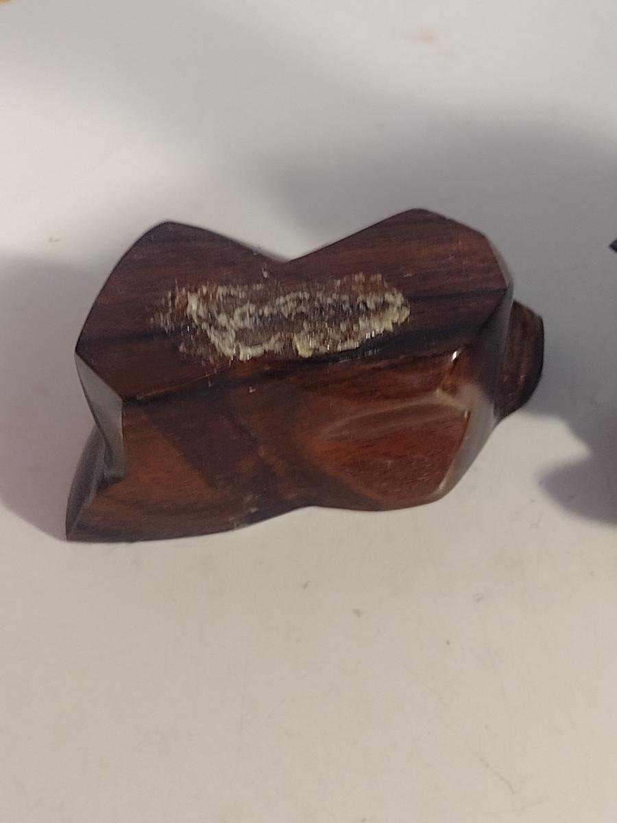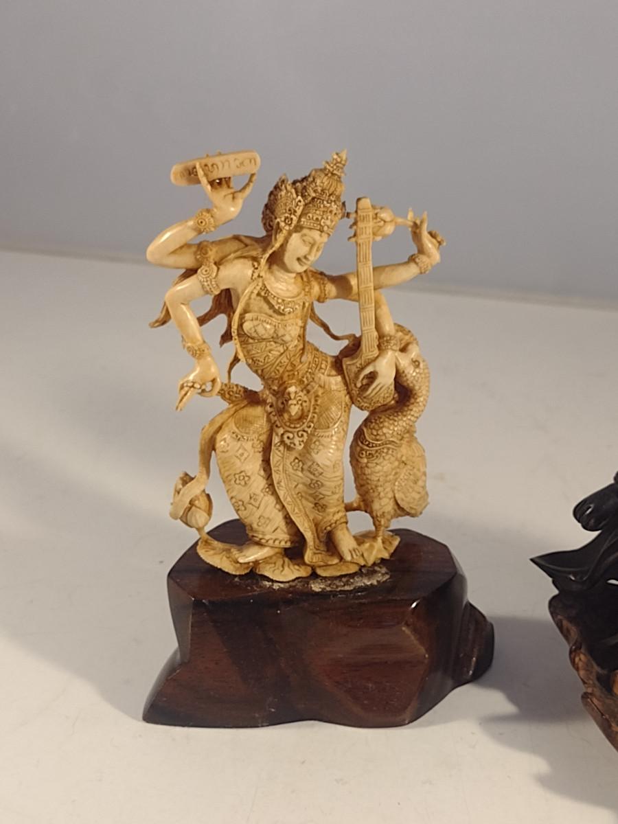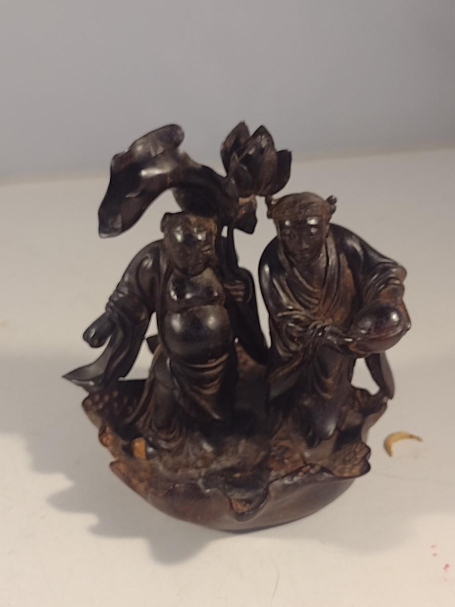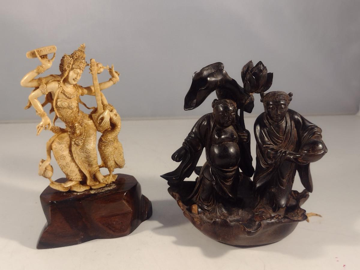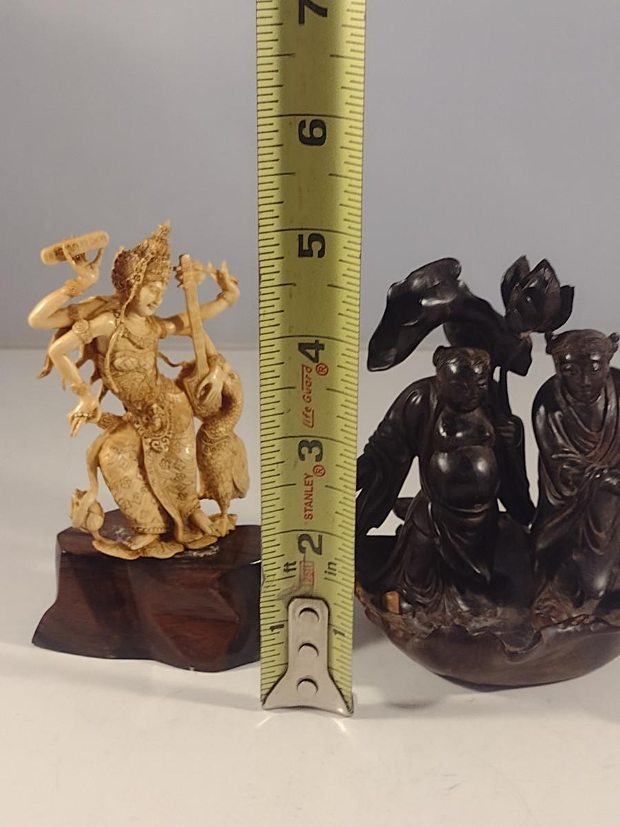 Pair of Carved Wood Asian Figurines. Cream colored one needs to be glued to base.