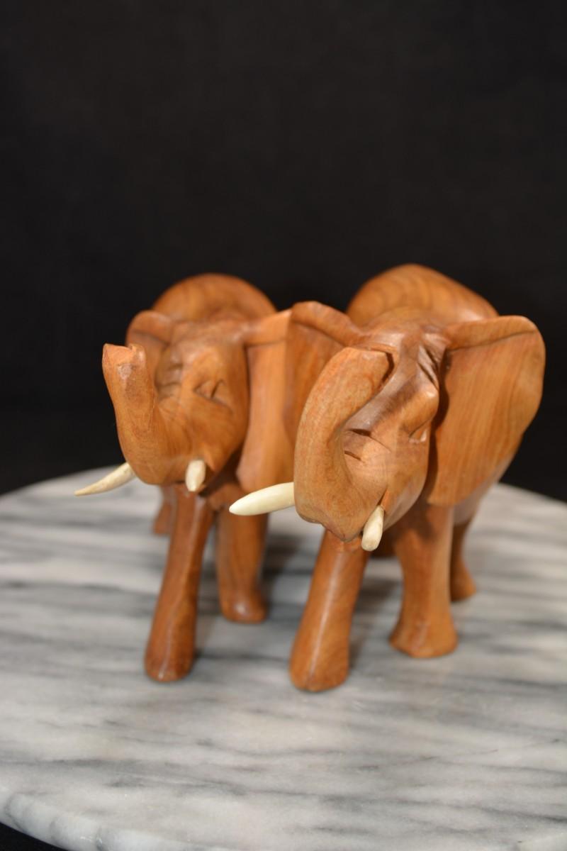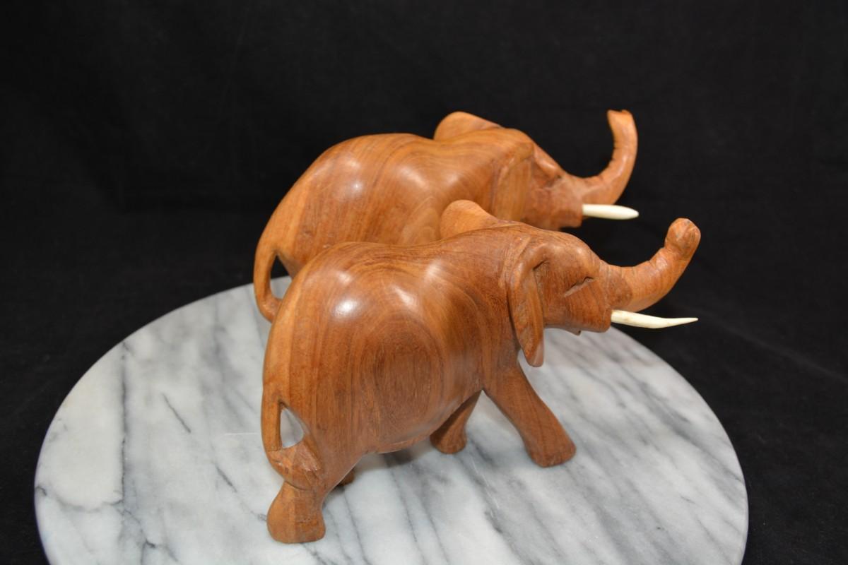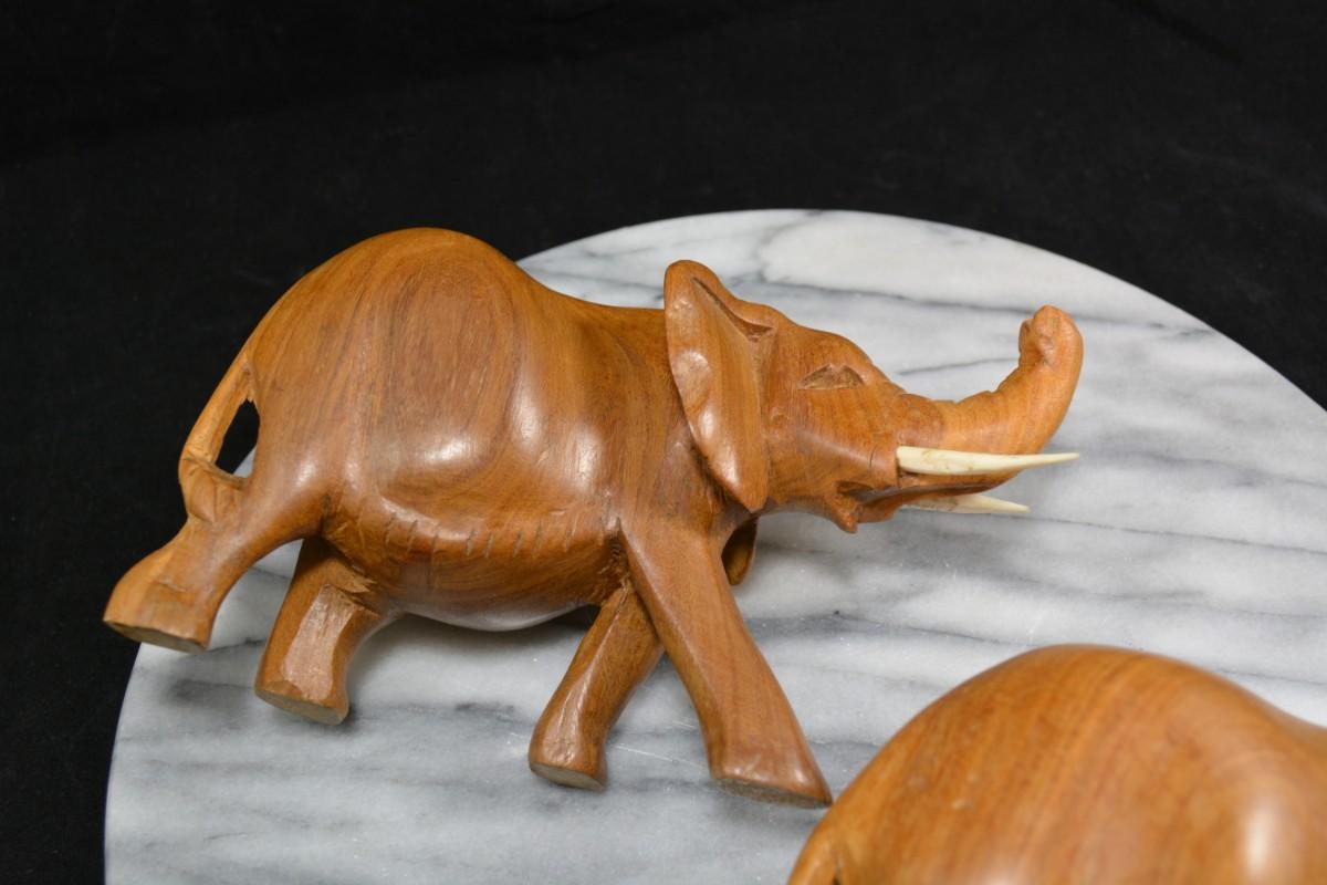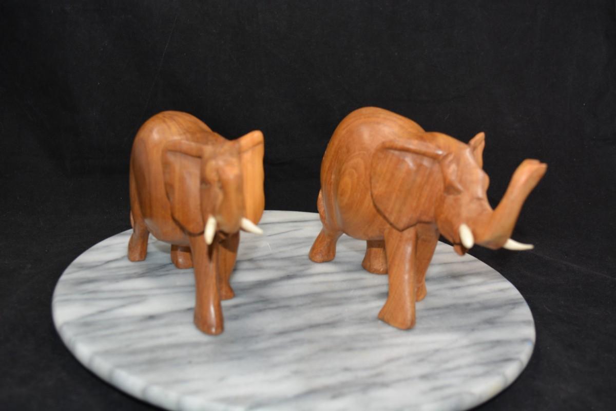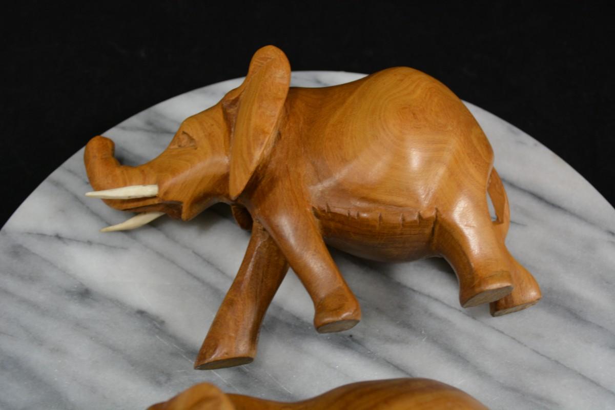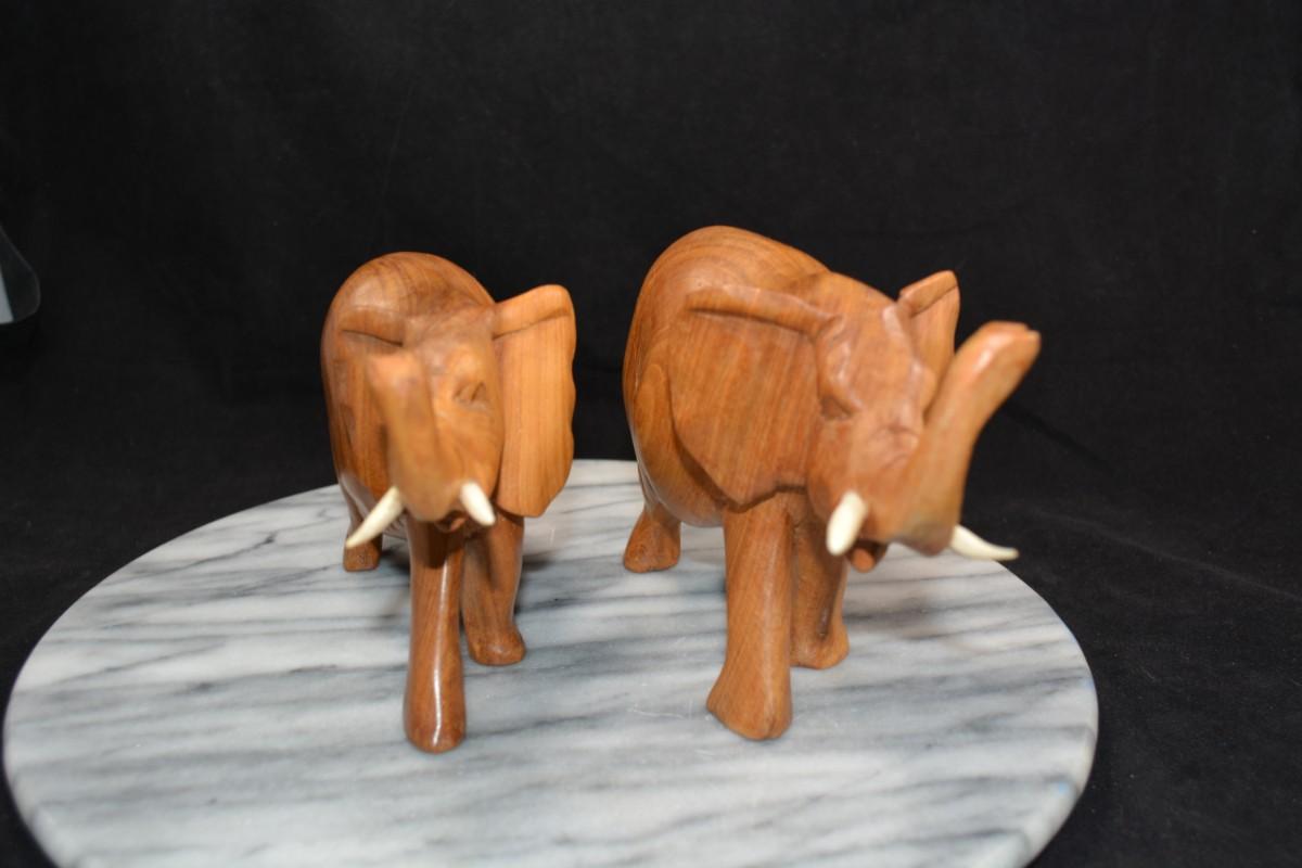 Pair of Carved Wooden Elephants w/ Bone Tusks, Africa 8”/7”