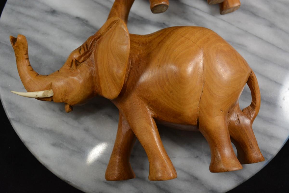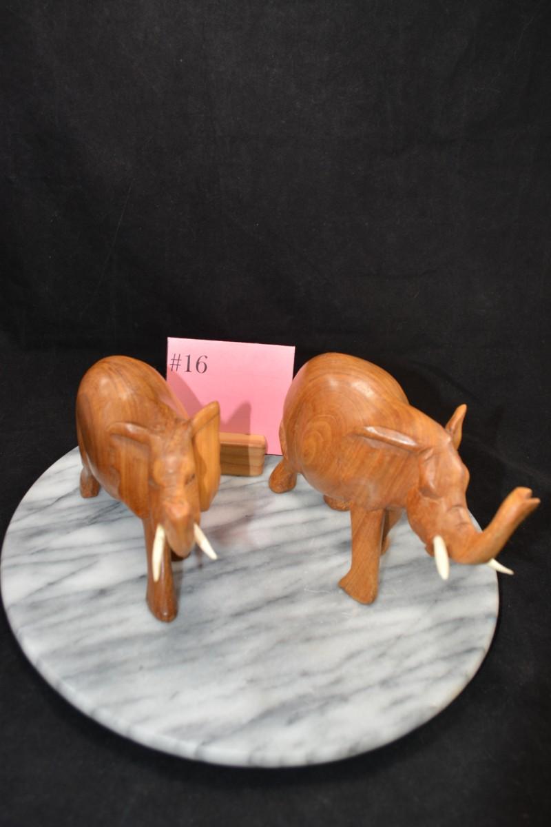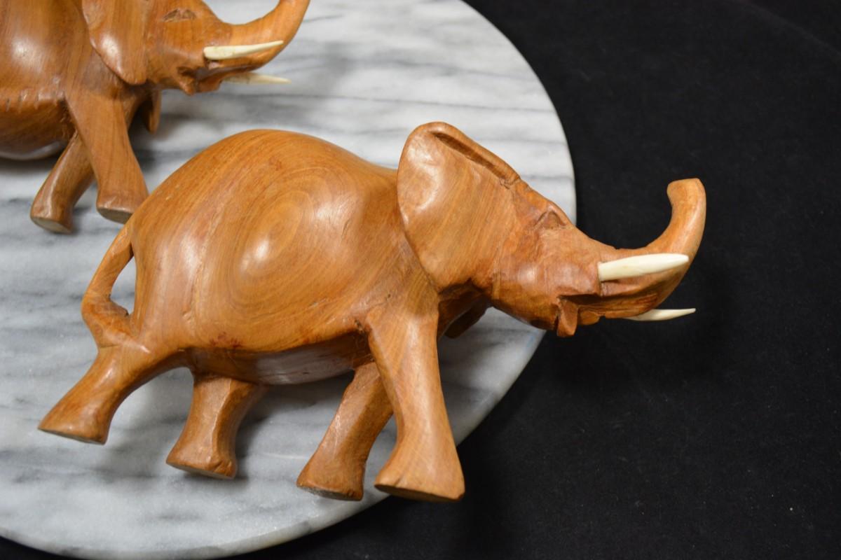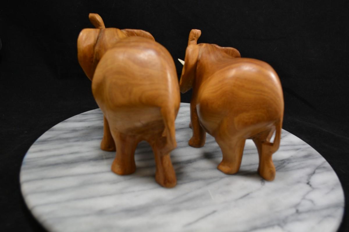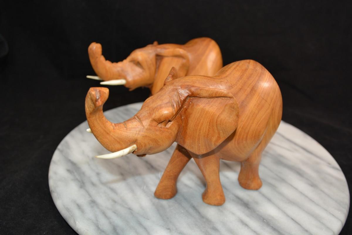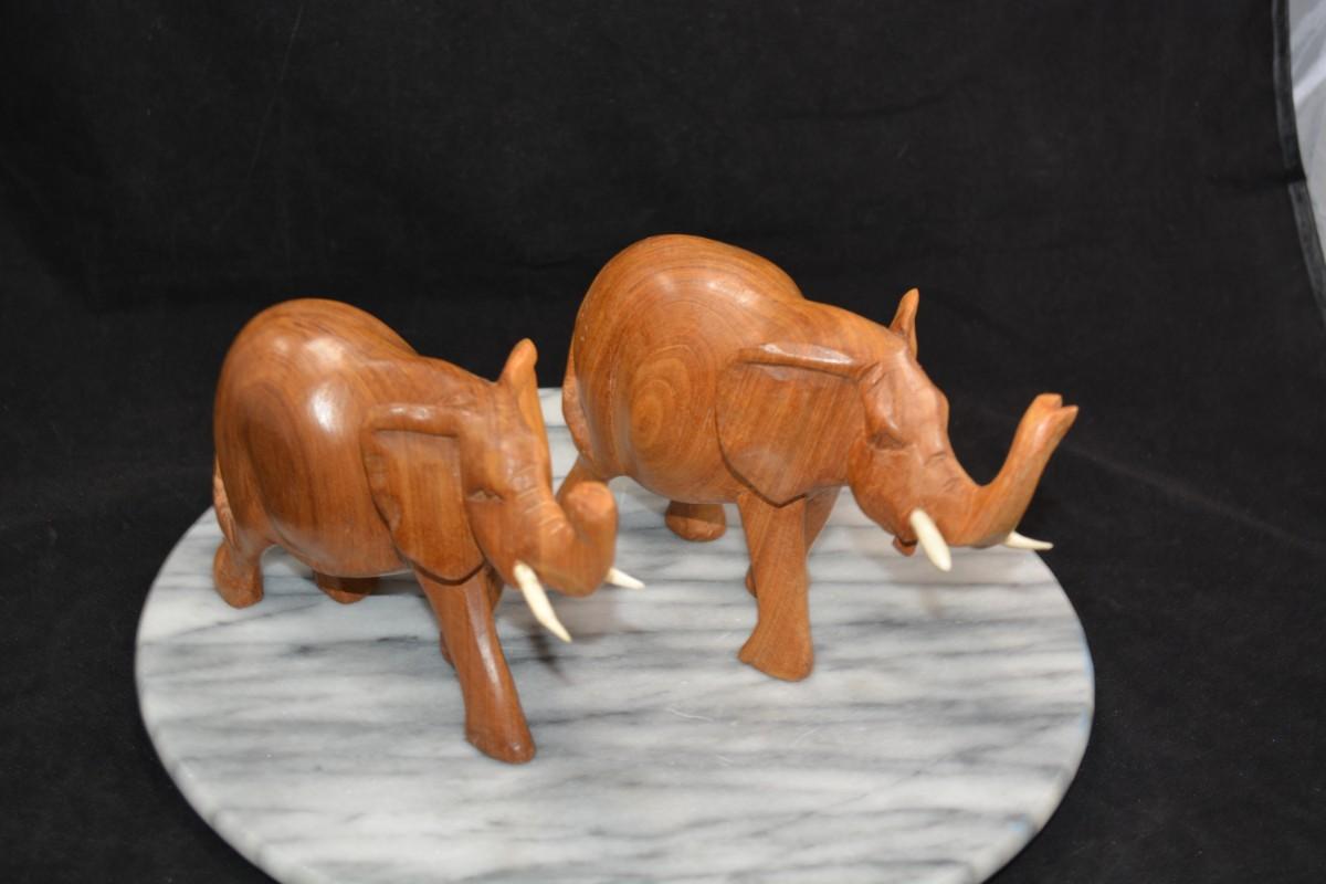 Pair of Carved Wooden Elephants w/ Bone Tusks, Africa 8”/7”