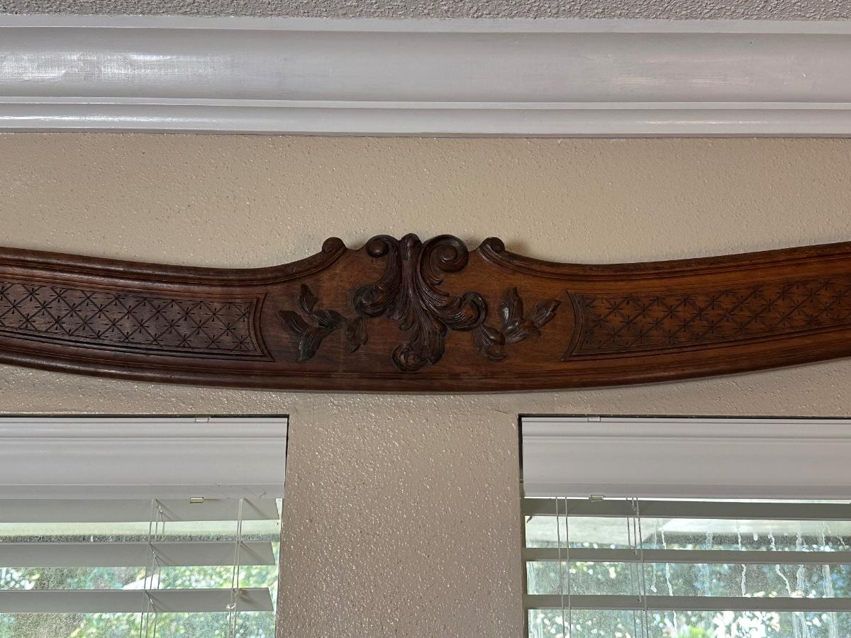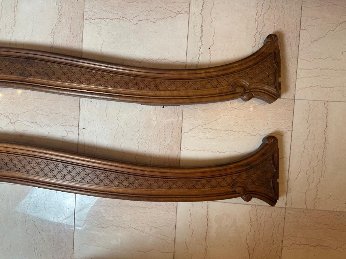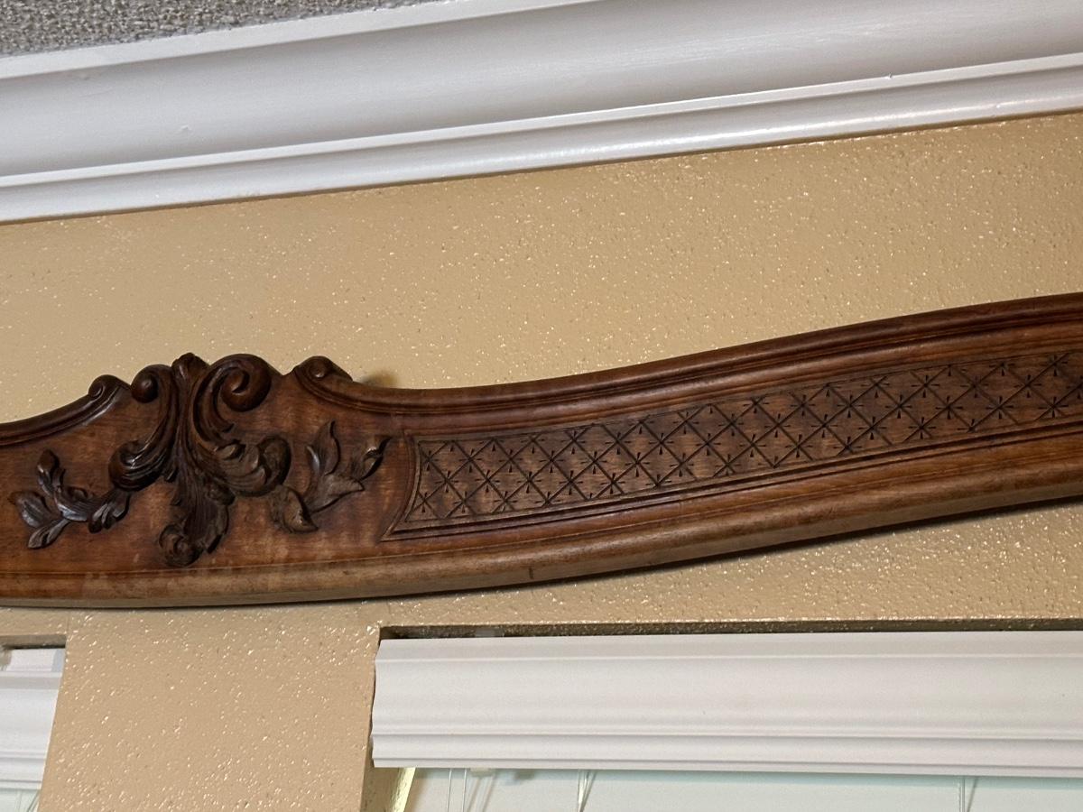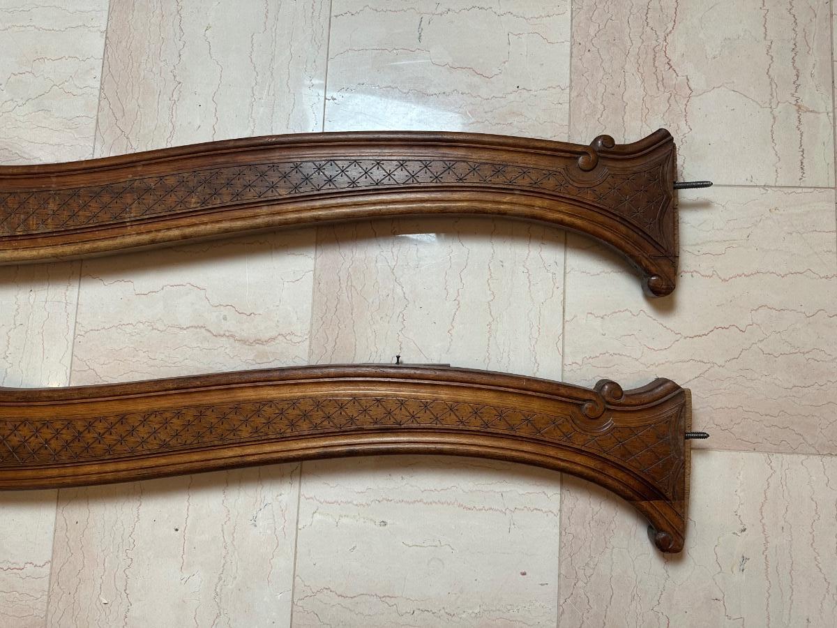 Matching pair of decorative carved wooden wall panels, designed for wall display. Each features a gently curved profile with floral carving at center and incised geometric detailing along the length. Previously used as wall décor. Solid wood construction with mounting hardware at ends.