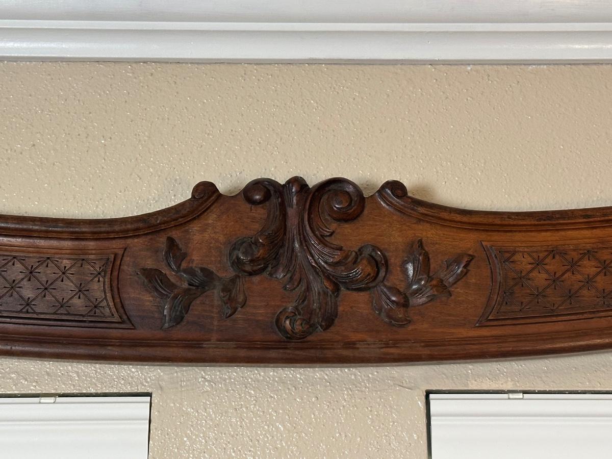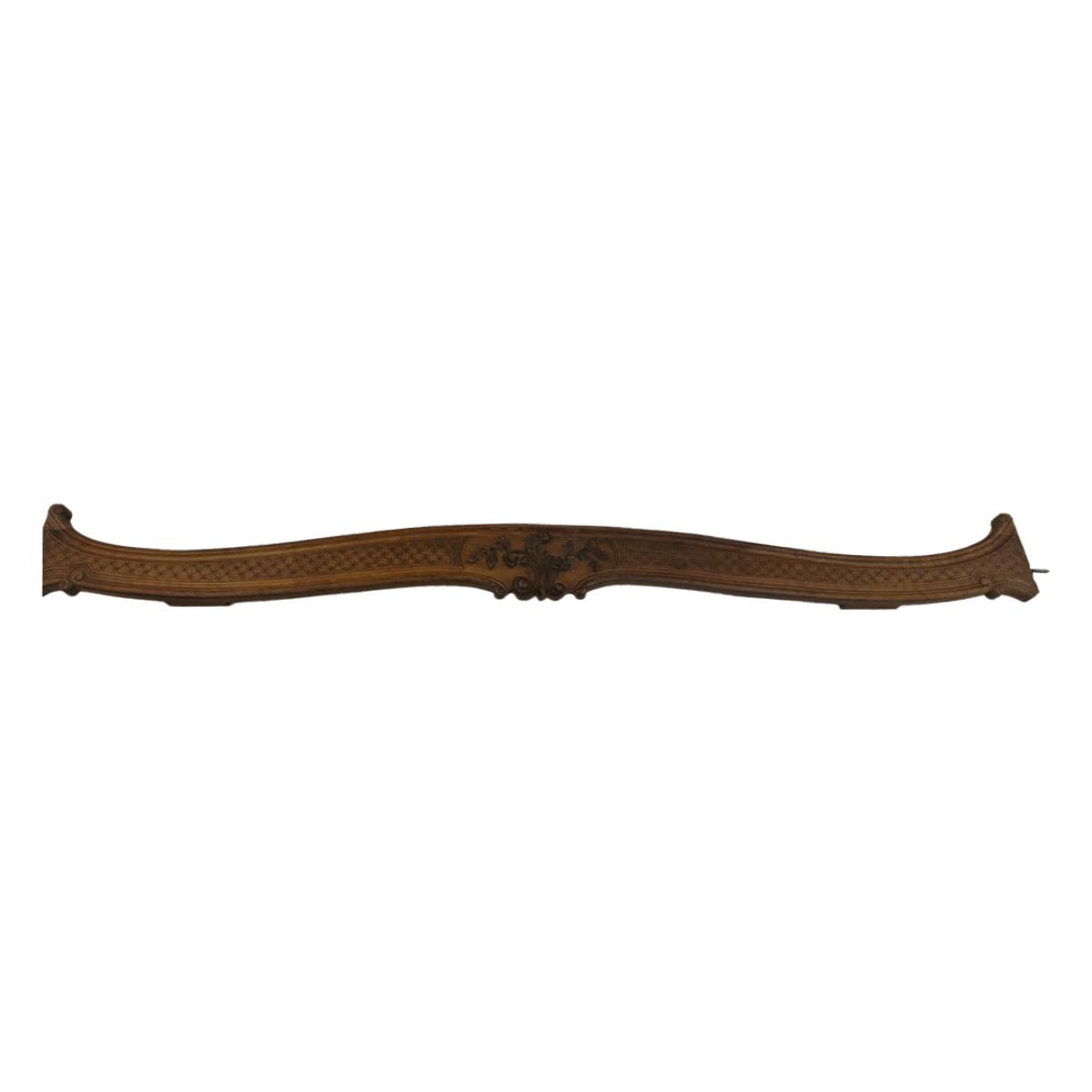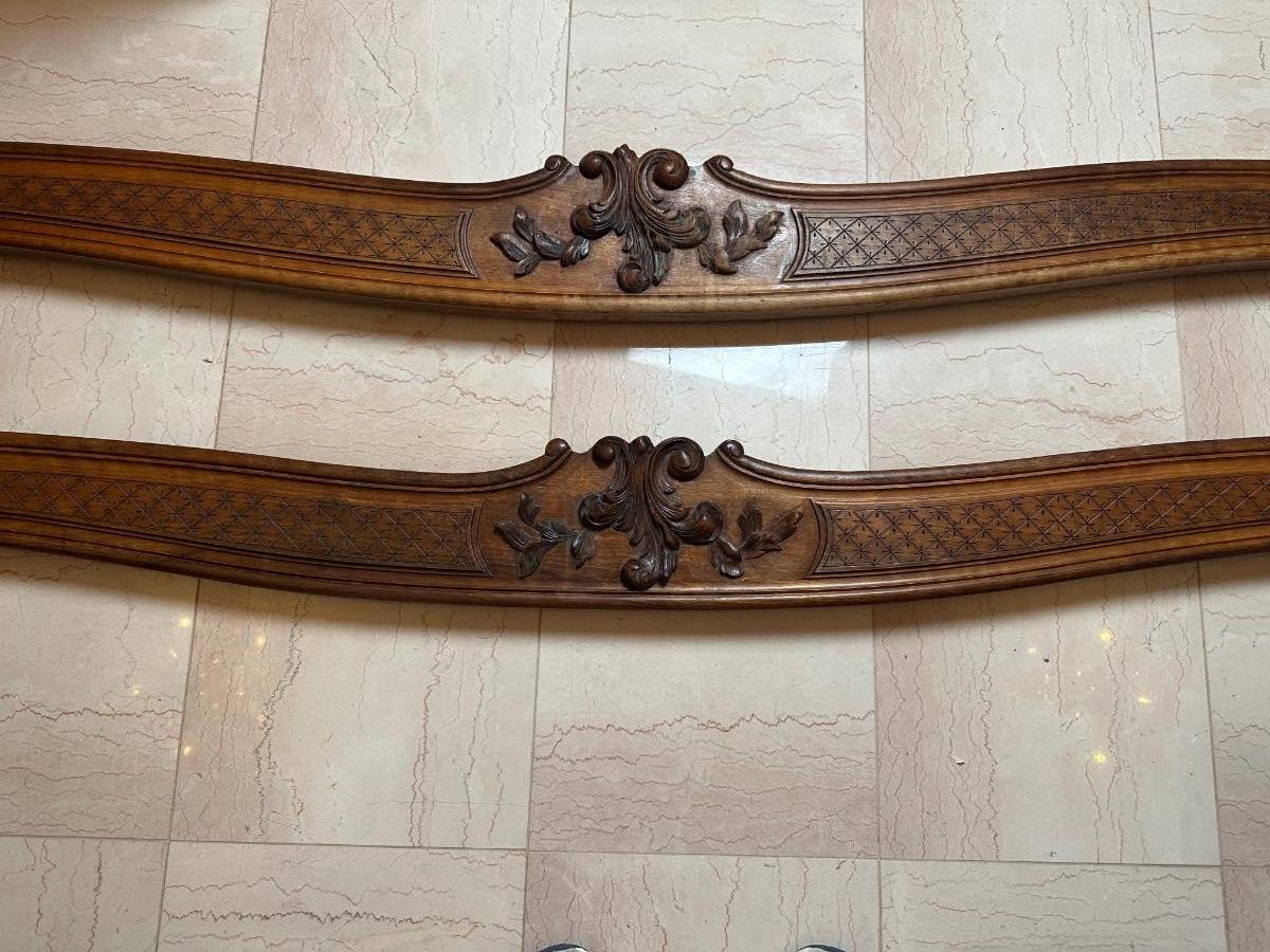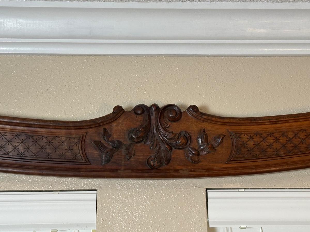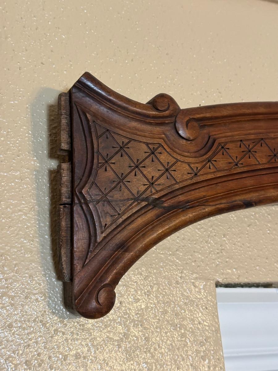 Matching pair of decorative carved wooden wall panels, designed for wall display. Each features a gently curved profile with floral carving at center and incised geometric detailing along the length. Previously used as wall décor. Solid wood construction with mounting hardware at ends.