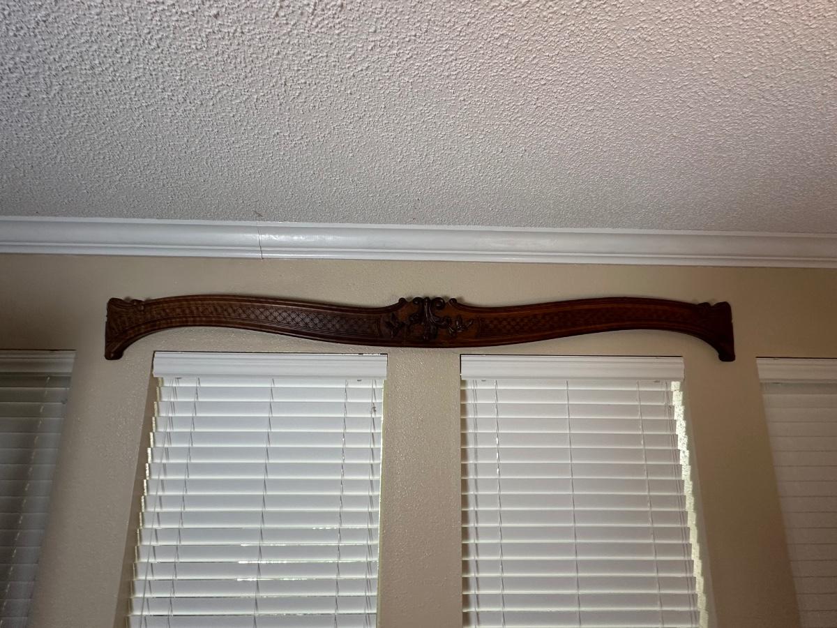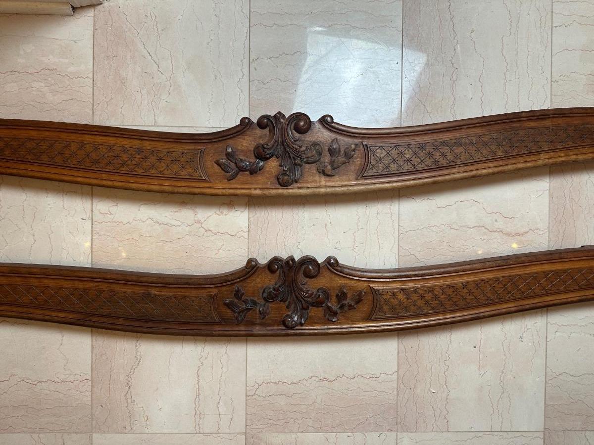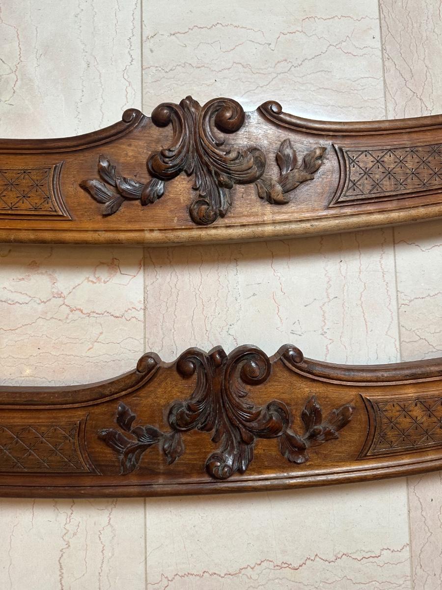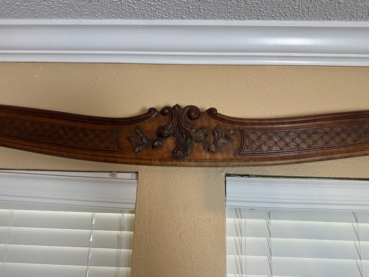 Matching pair of decorative carved wooden wall panels, designed for wall display. Each features a gently curved profile with floral carving at center and incised geometric detailing along the length. Previously used as wall décor. Solid wood construction with mounting hardware at ends.