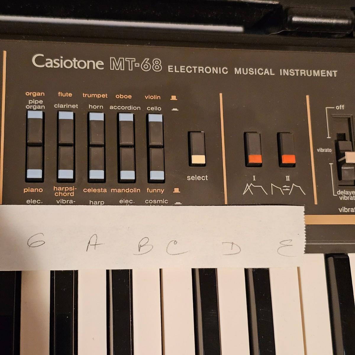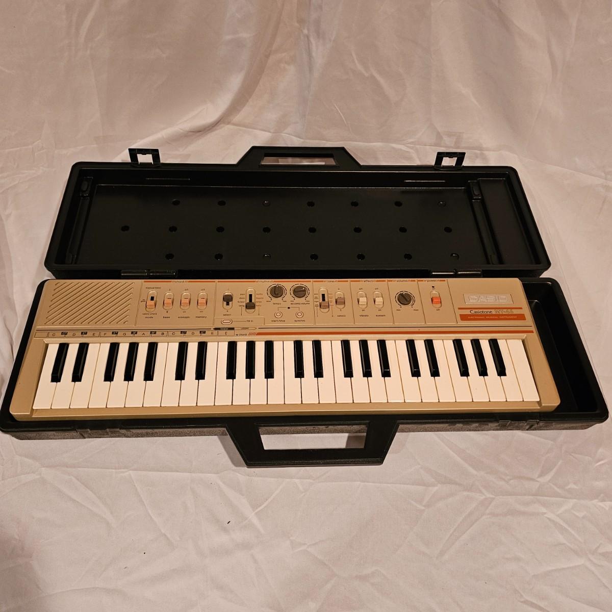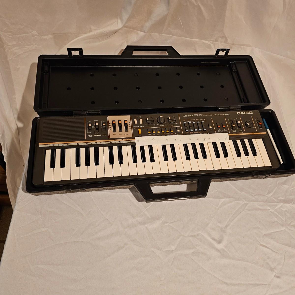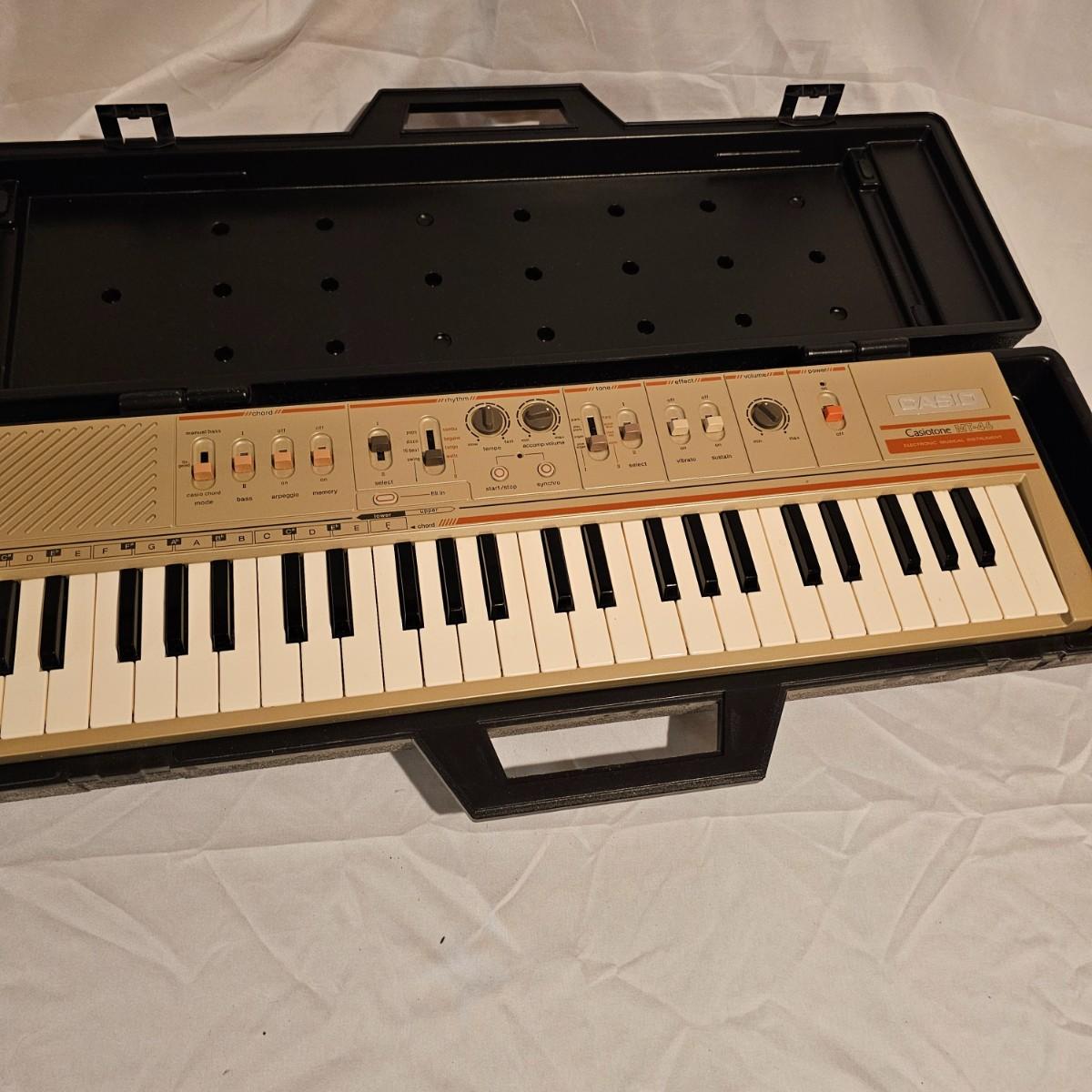 Two smaller Casiotone electronic musical instrument keyboards with hardshell cases. Casiotone MT-68 is dark brown in color, has numerous options for sound generation. The Casiotone MT-46 is light tan in color, has similiar options as other keyboard. Both units measure 25" x 7.5" x 2"H. Cases are 28" x 11" x 4"H. Units have power option of adapter or batteries. Both powered on when plugged in, but no adaptor included with these. One unit has old batteries, other has none. Not tested with batteries. See photos for details. Shipping available.