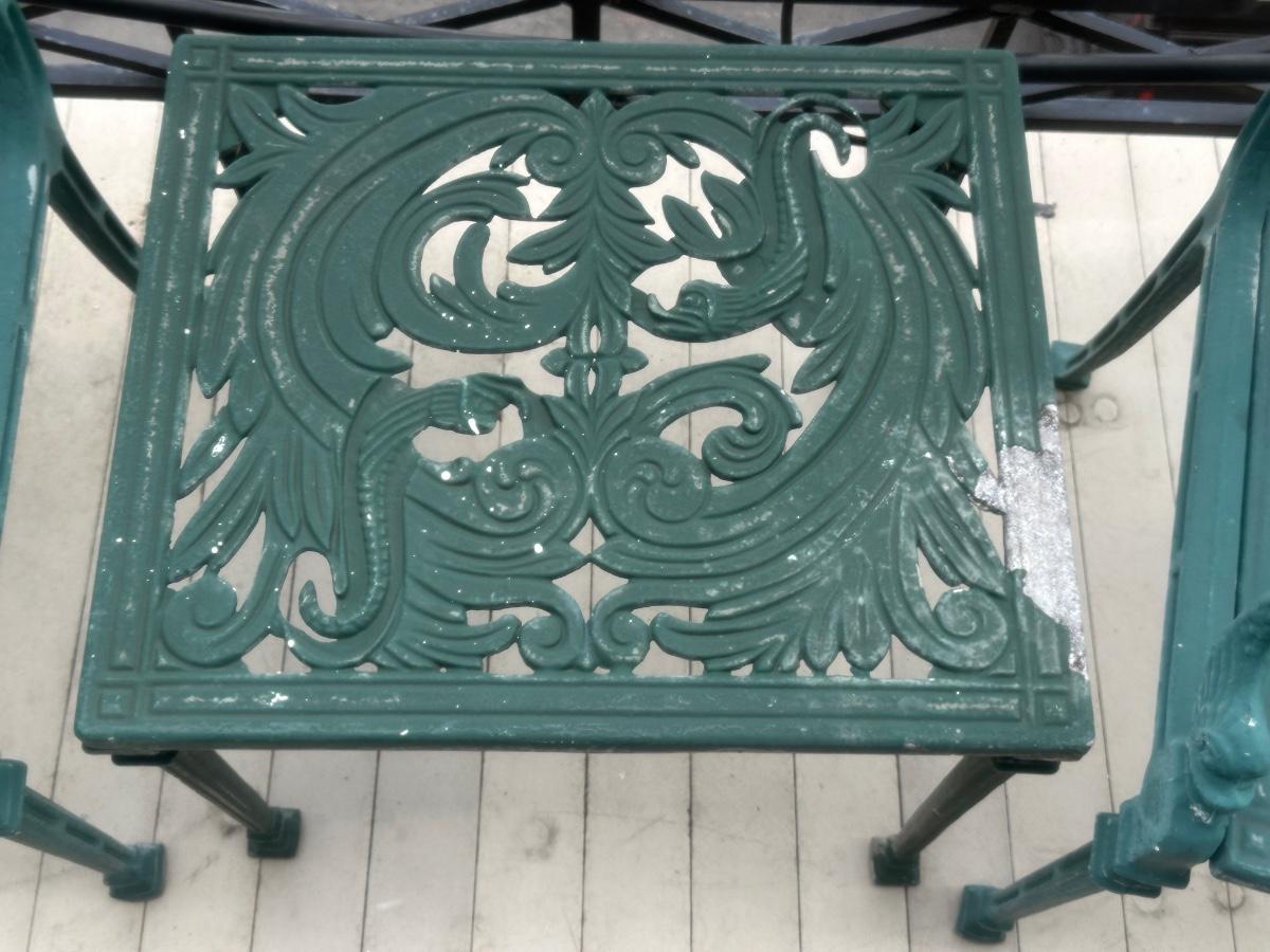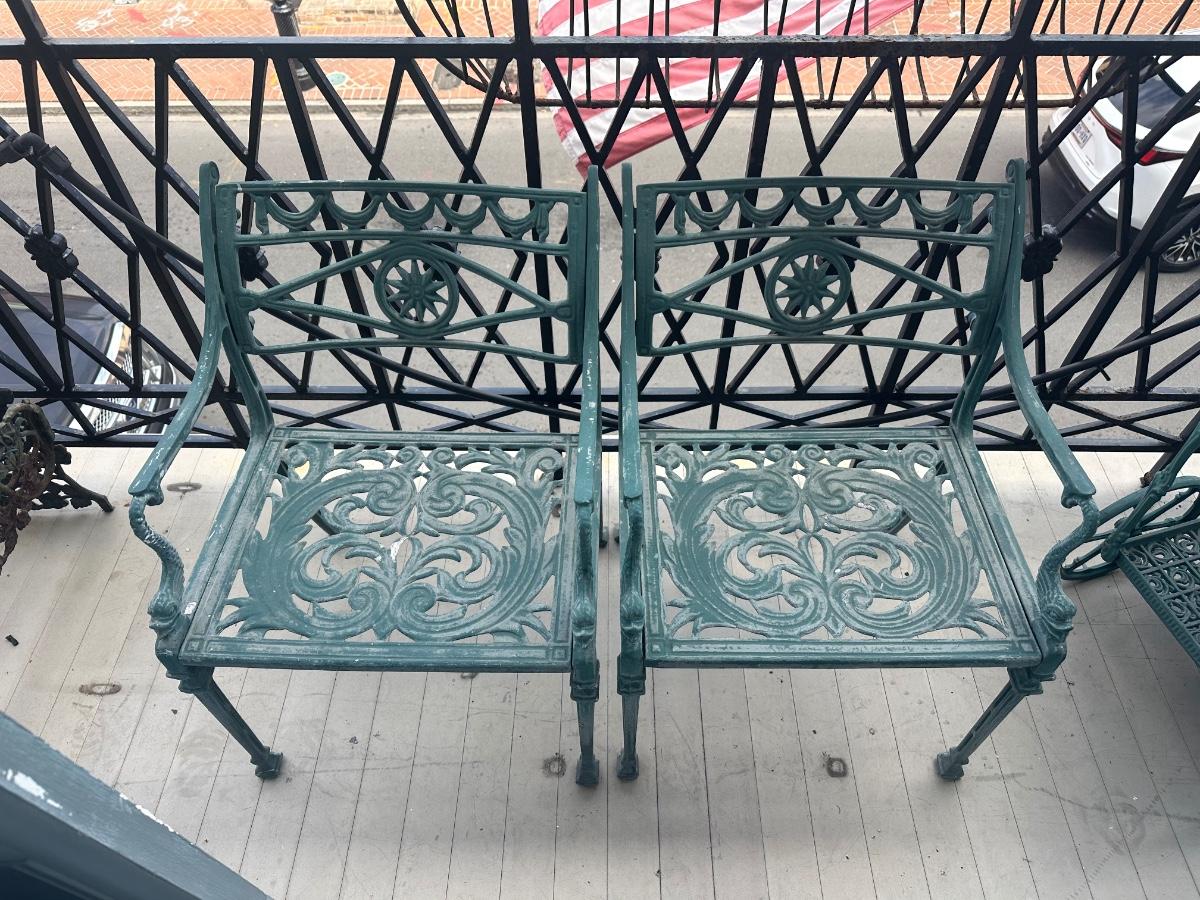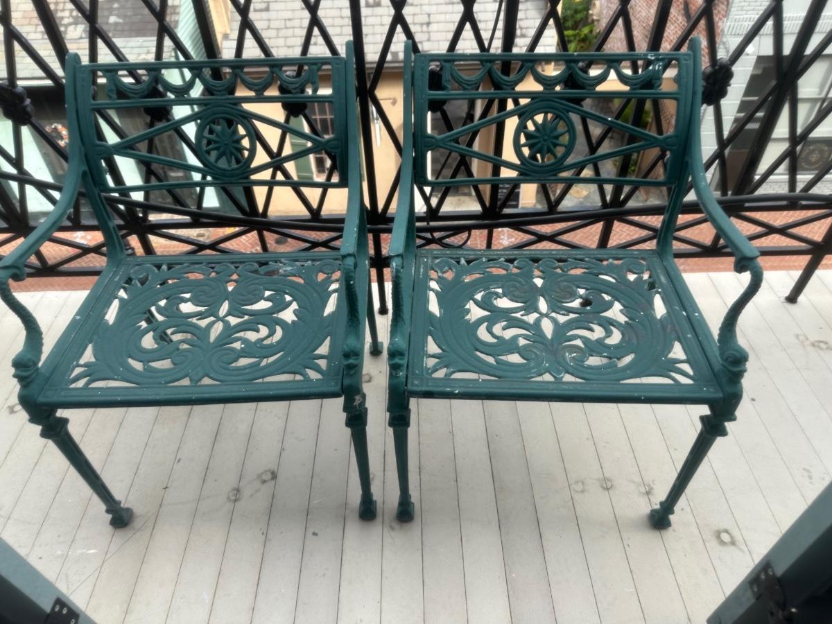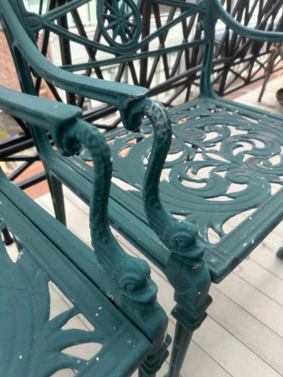 Pair of Cast Aluminum Outdoor Chairs & End Table – Star & Dolphin Design.