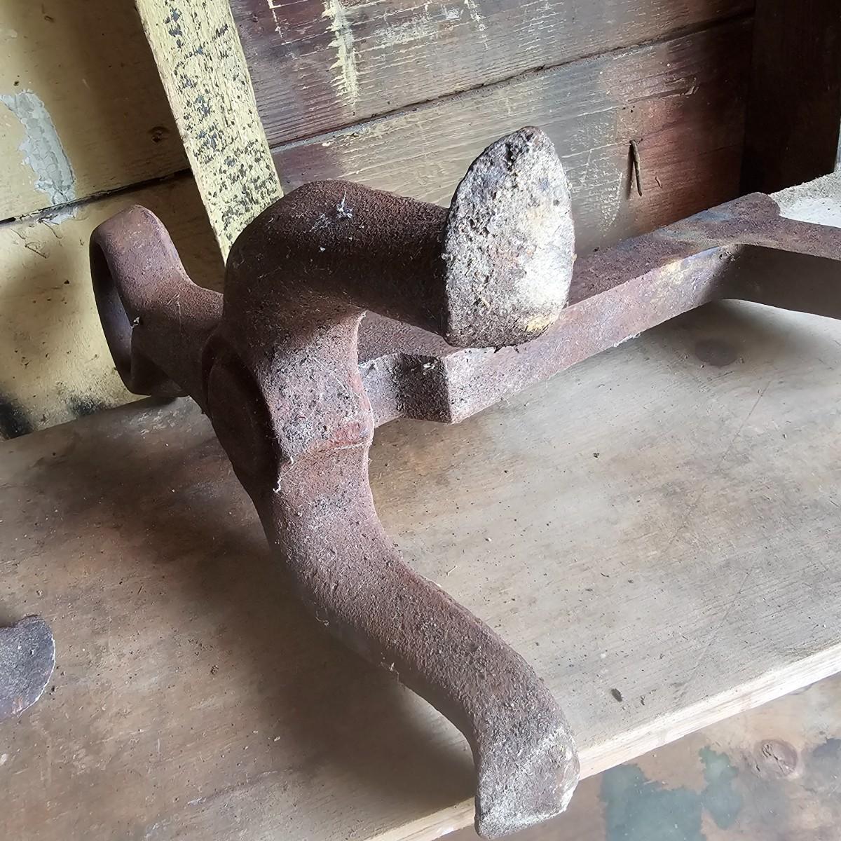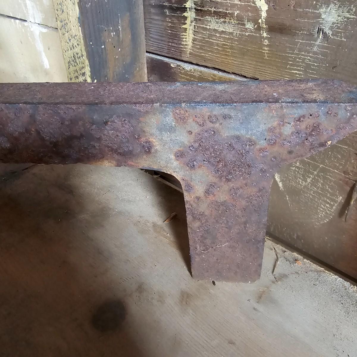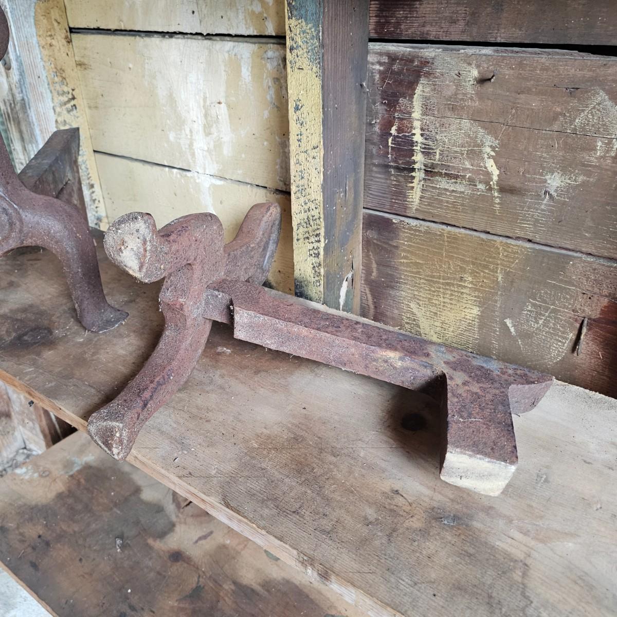 Solid, heavy 1.5" thick cast iron fireplace andirons. Tripod foot style with upright front piece. Items measure 8.5" x 14" x 15"H. Residual rust overall. See photos for details. Local pickup only.