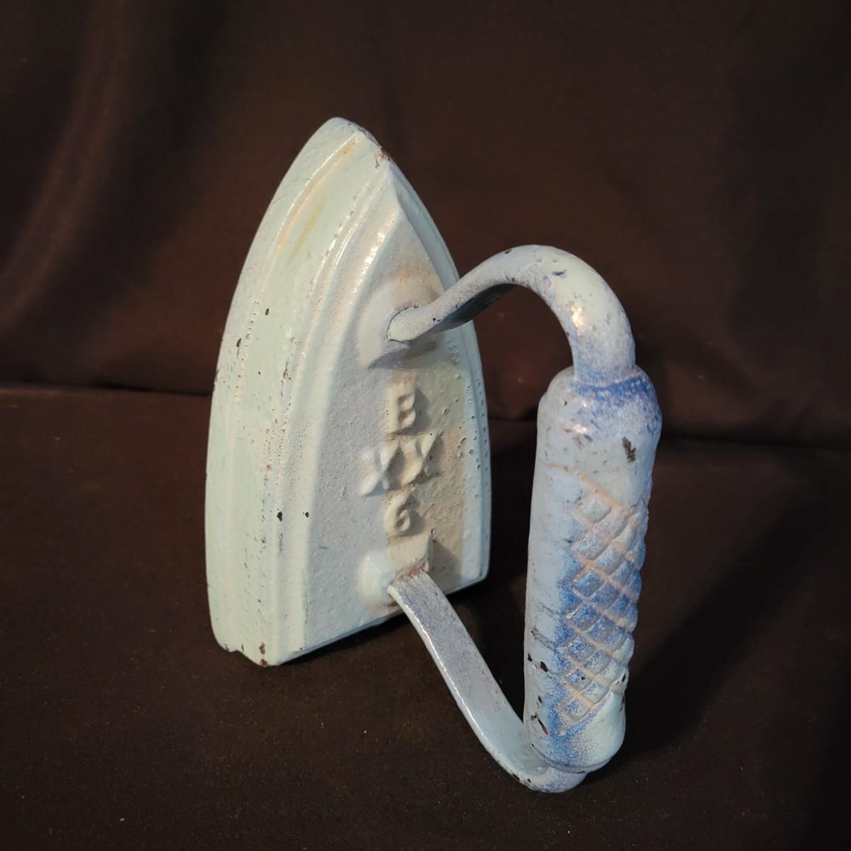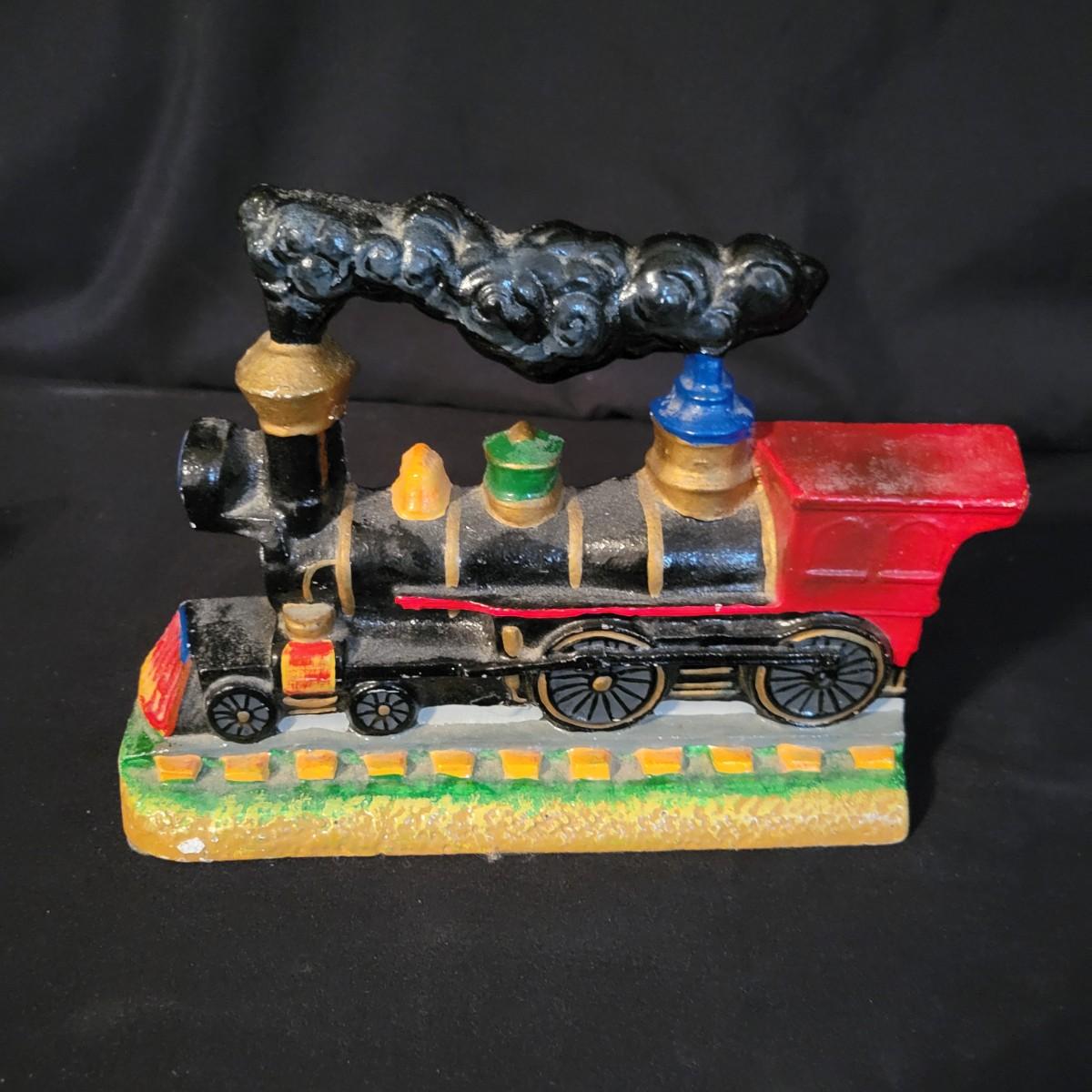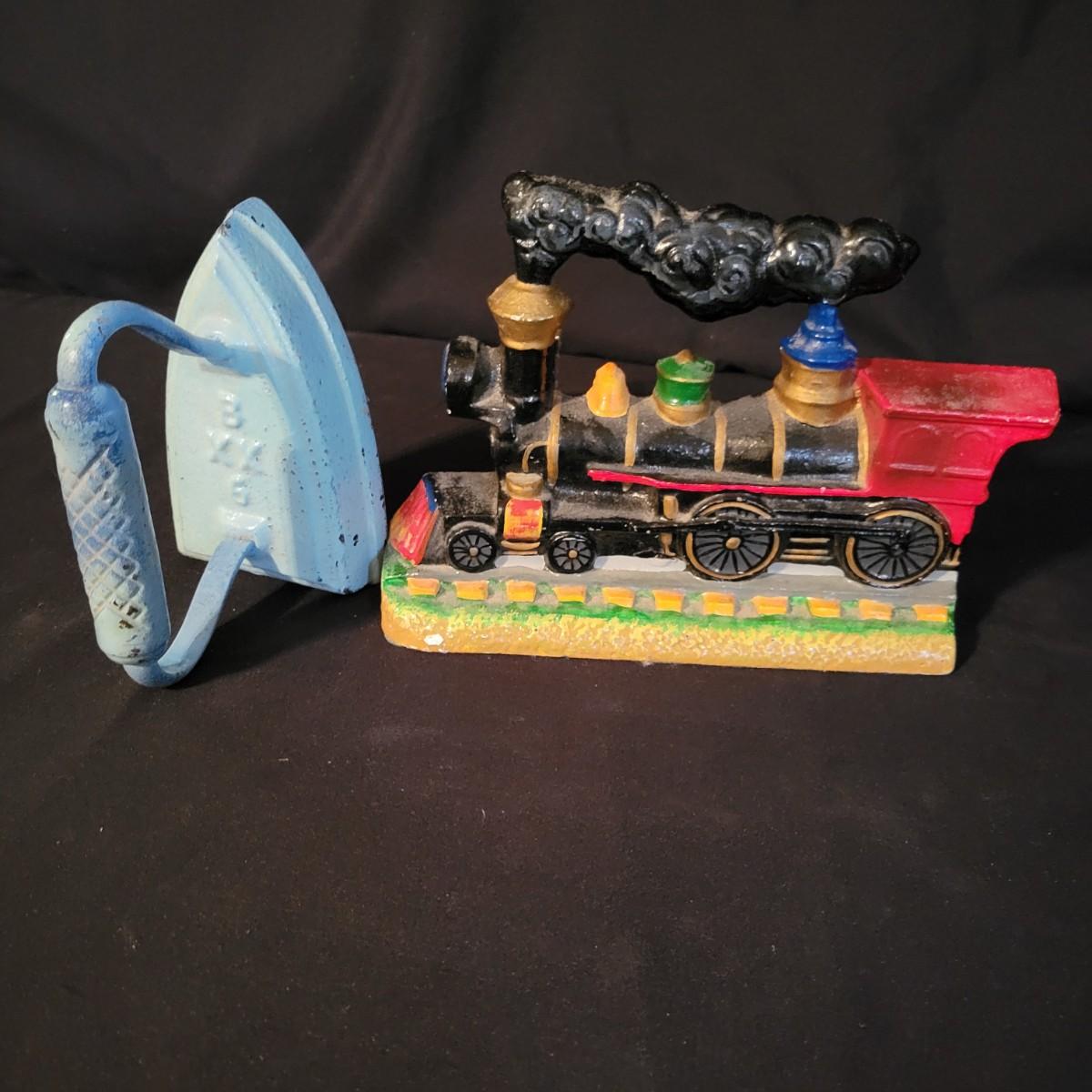 A pair of cast iron door stops. Included is a iron doorstop that is a steam engine that is painted. It measures approximately 10" x 2.5" x 6.5"H. There is also a flat iron that has been painted blue and has the marking, B XX G on its surface. Shipping available