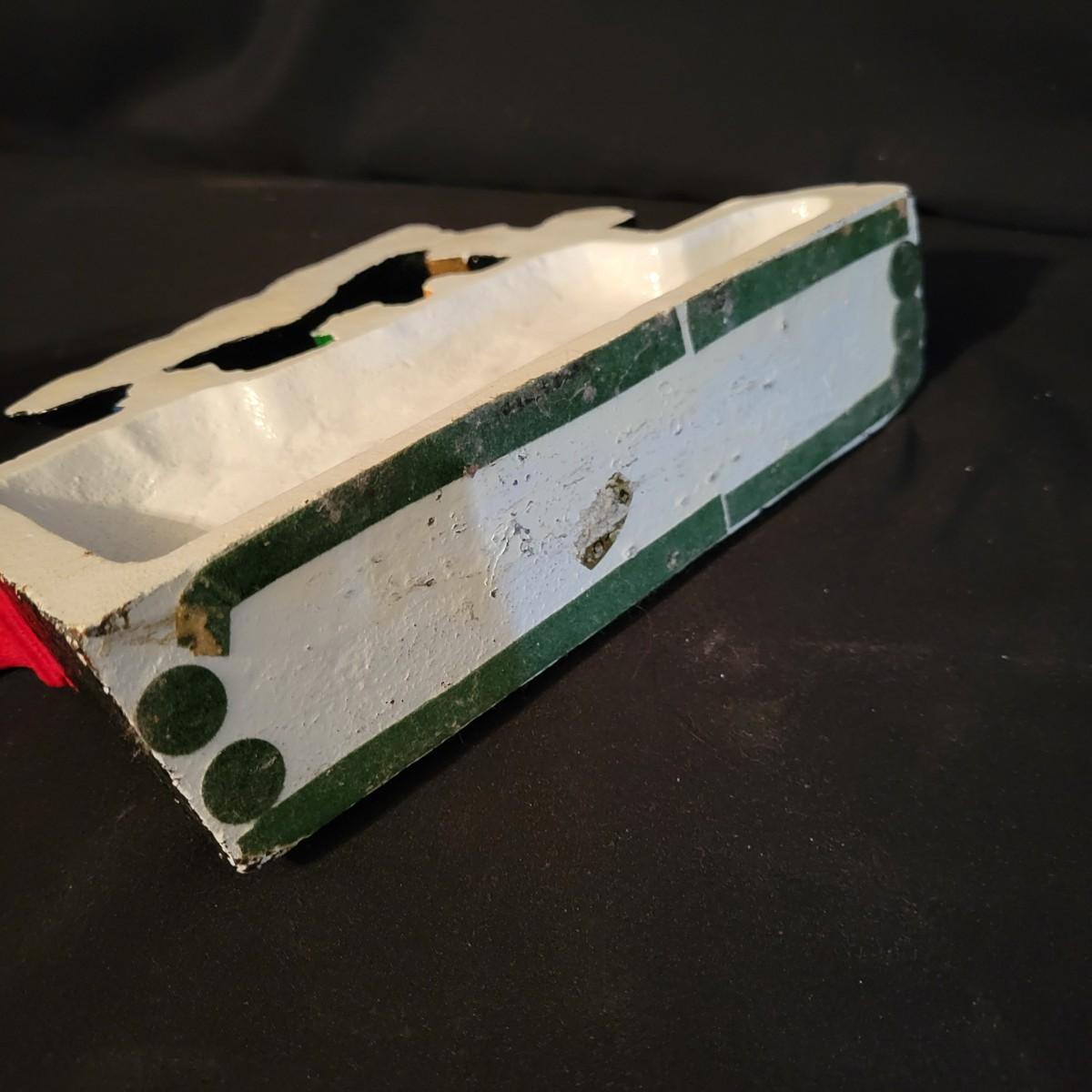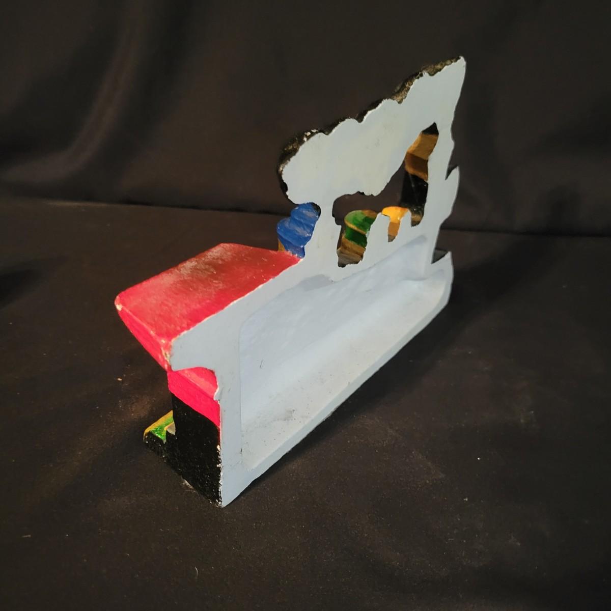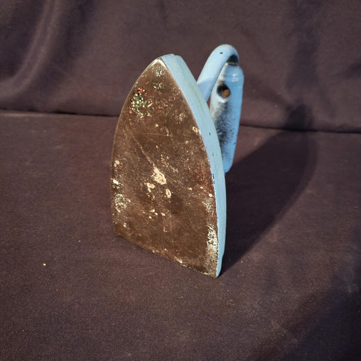 A pair of cast iron door stops. Included is a iron doorstop that is a steam engine that is painted. It measures approximately 10" x 2.5" x 6.5"H. There is also a flat iron that has been painted blue and has the marking, B XX G on its surface. Shipping available