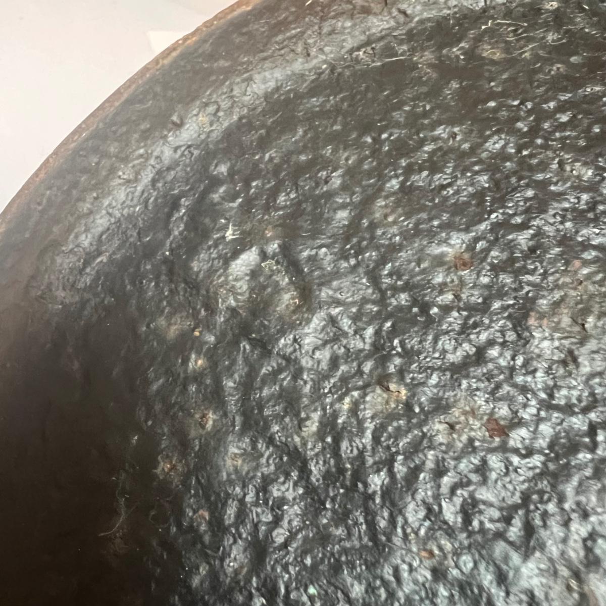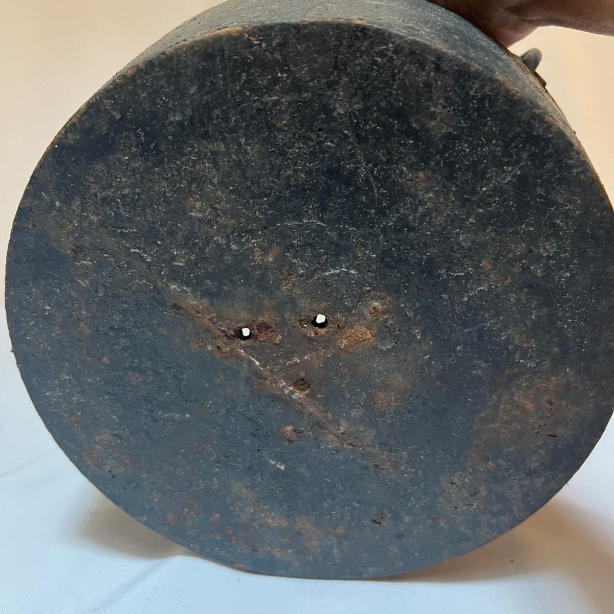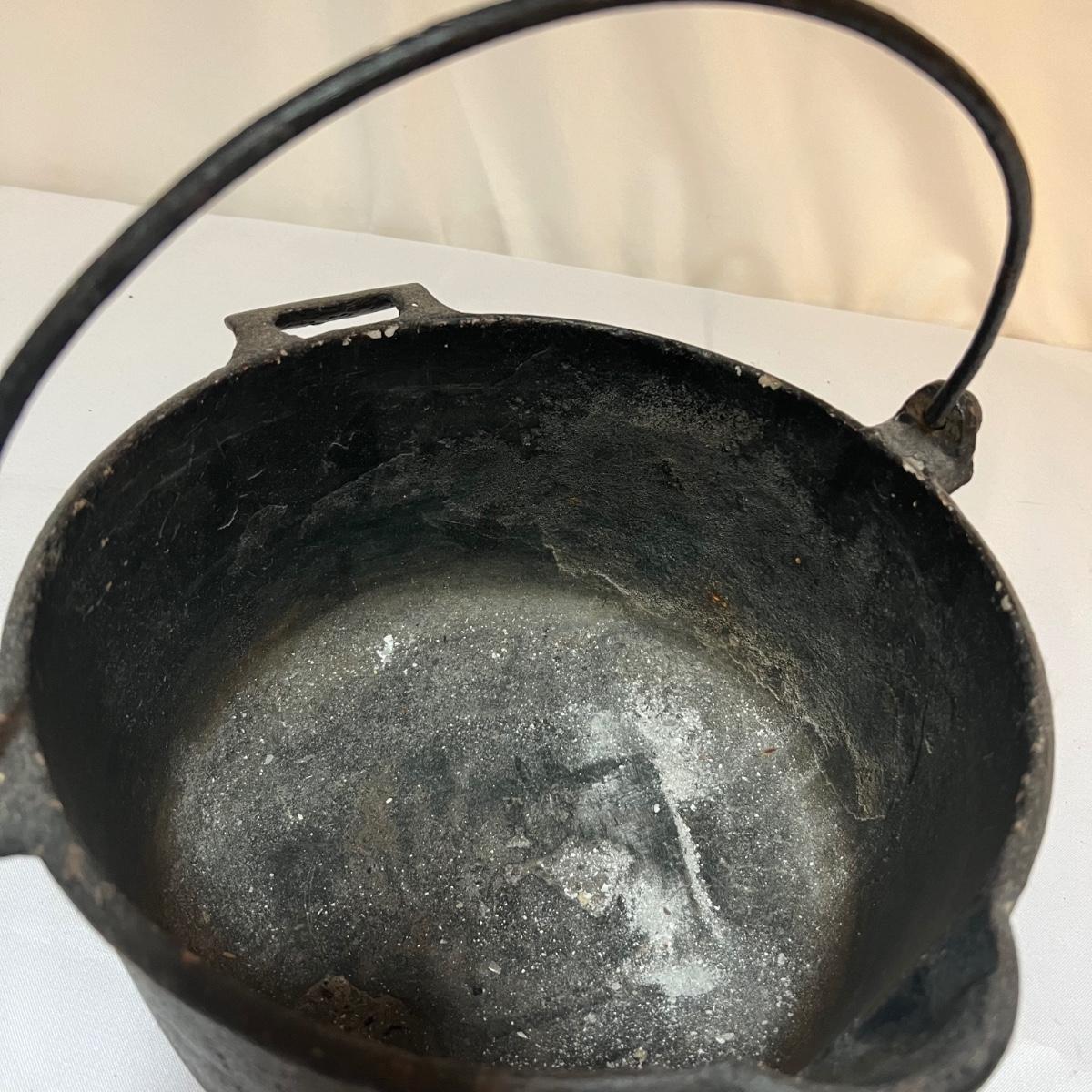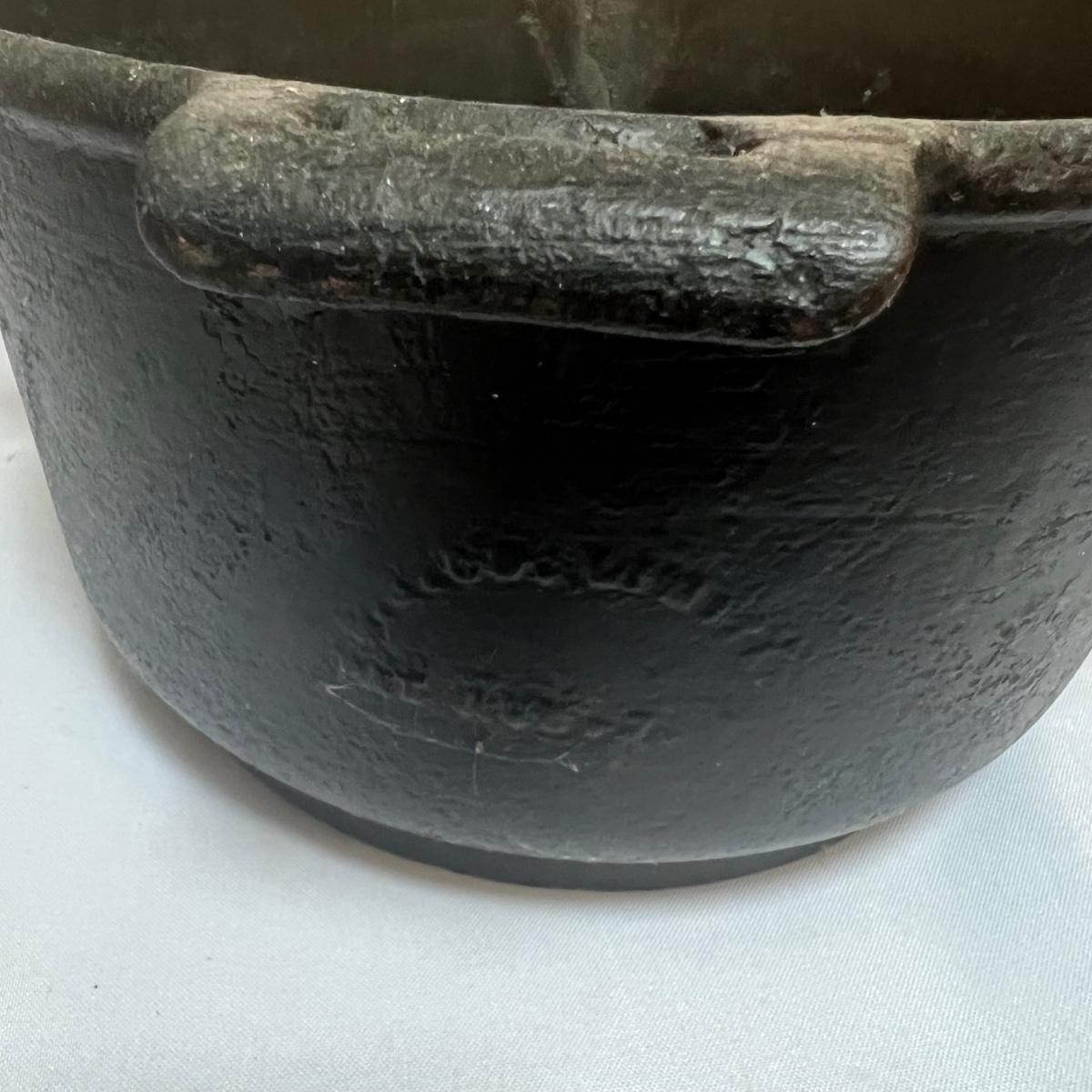 Two cast iron pots with handles that appear to be 5 quart. One has the number 5 on the bottom, its company logo is worn and indecipherable. The other pot is unmarked, it has substantial interior rust and a few small holes in its base; measures 8.5”D x 7”H.