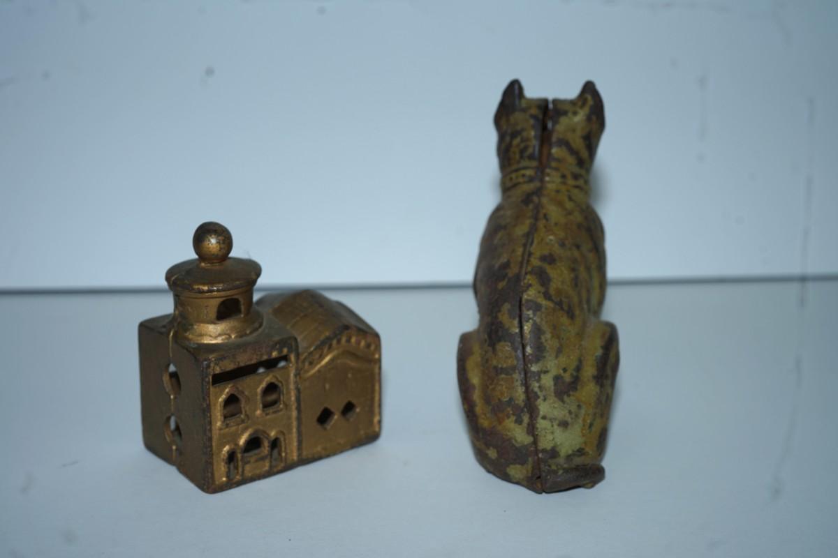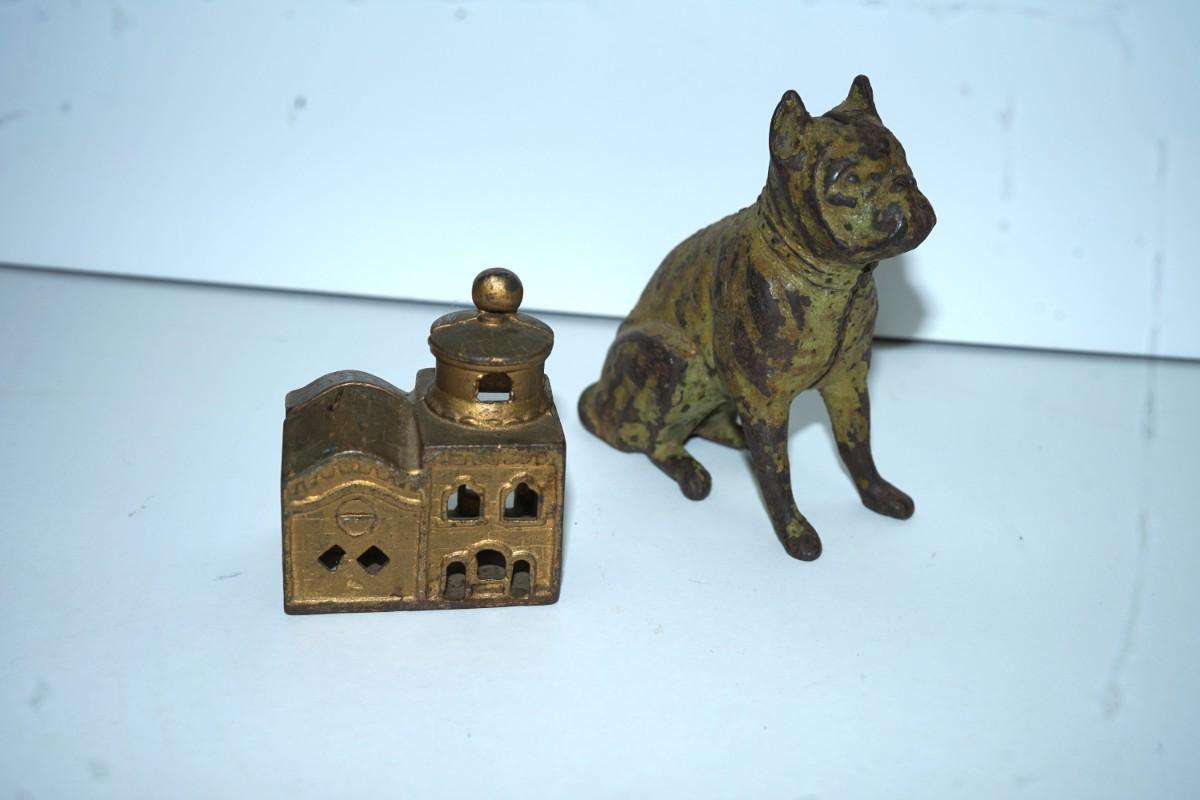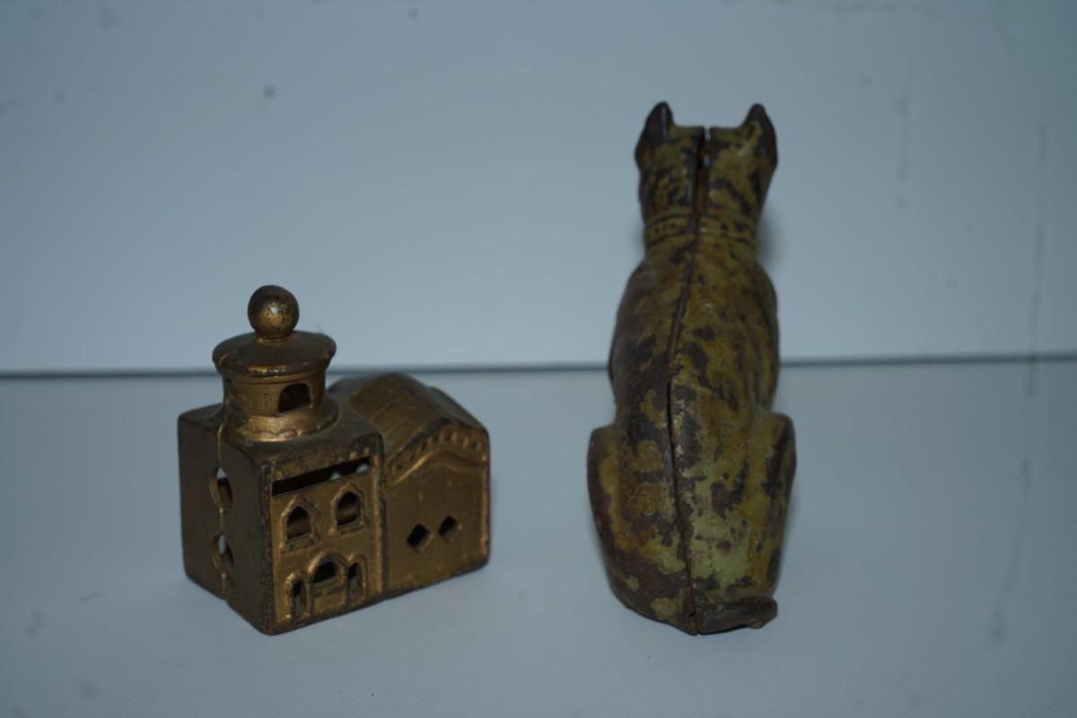 PAIR OF CAST IRON STILL BANKS DOG & BUILDING