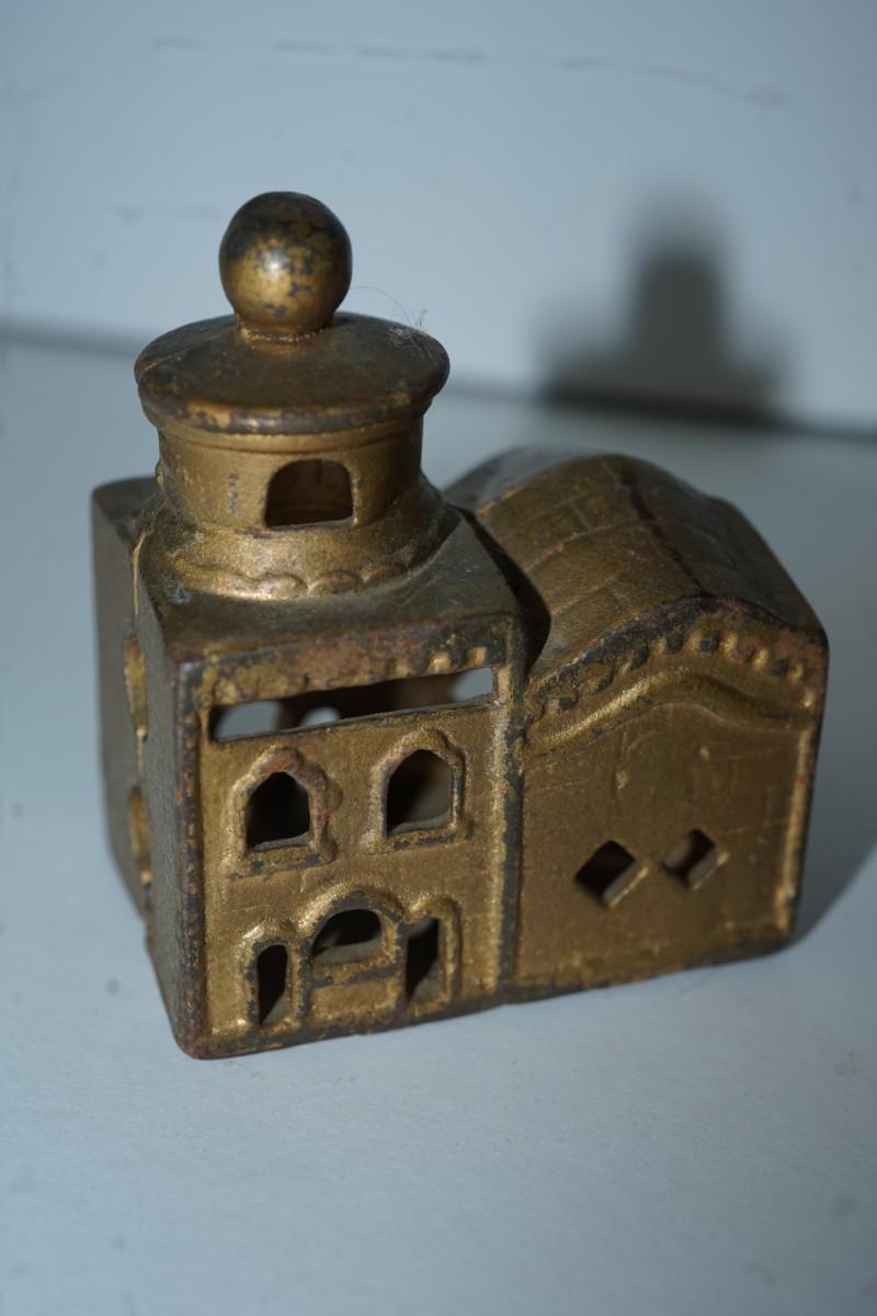 The building is in good condition with slight paint loss, there is a slot on the back of the building to place the. coin . a screw to remove the sides away . Novelty antiques with wear and age.