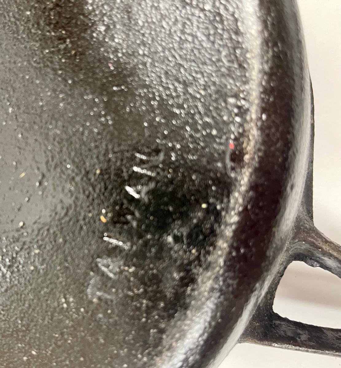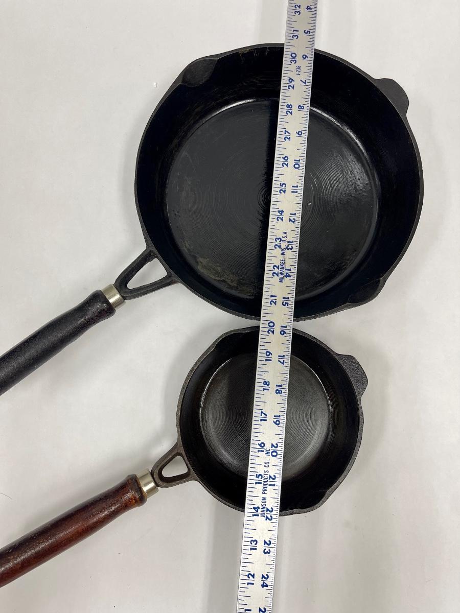 Pair of Cast Iron Wooden Handle Cooking Skillets, there is no significant damage to the skillets and is in good useable condition. Check pictures for more details and for sizing.