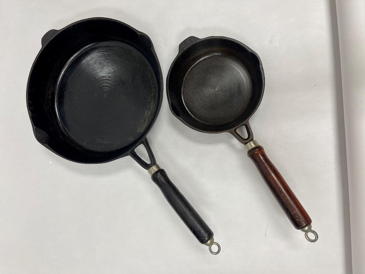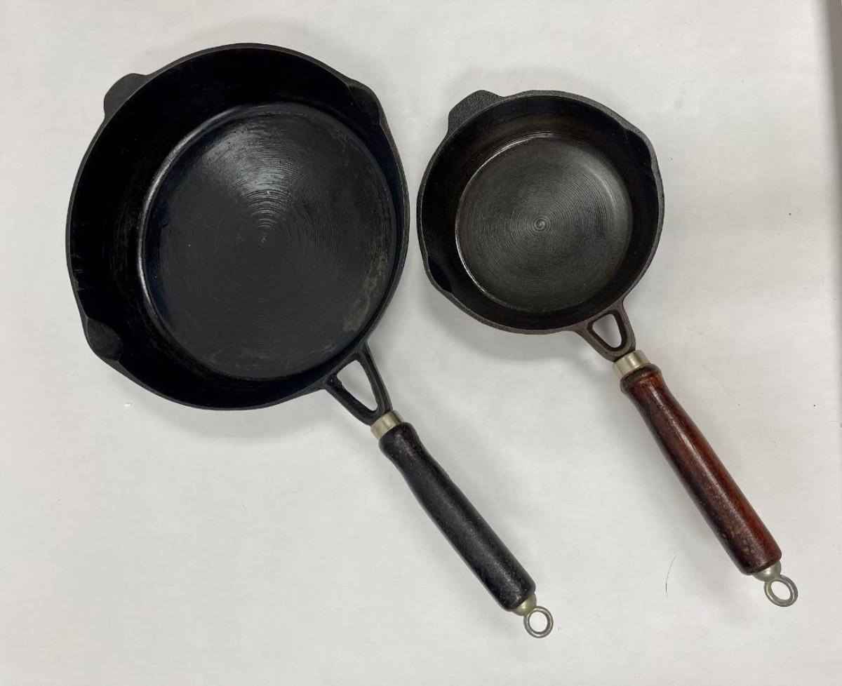 Pair of Cast Iron Wooden Handle Cooking Skillets