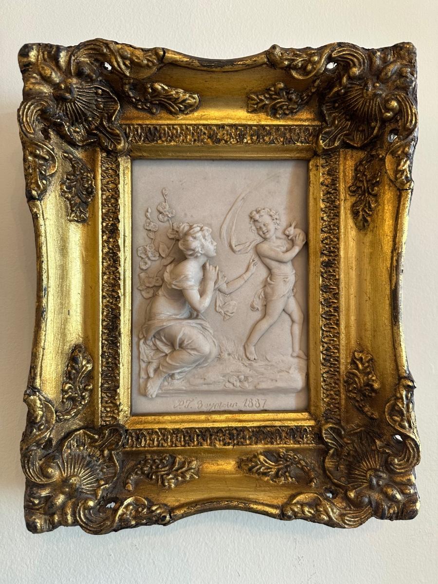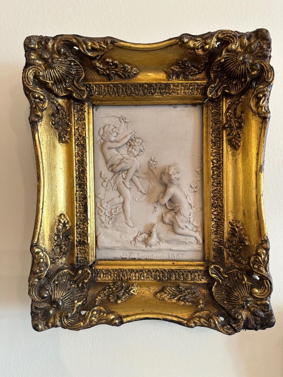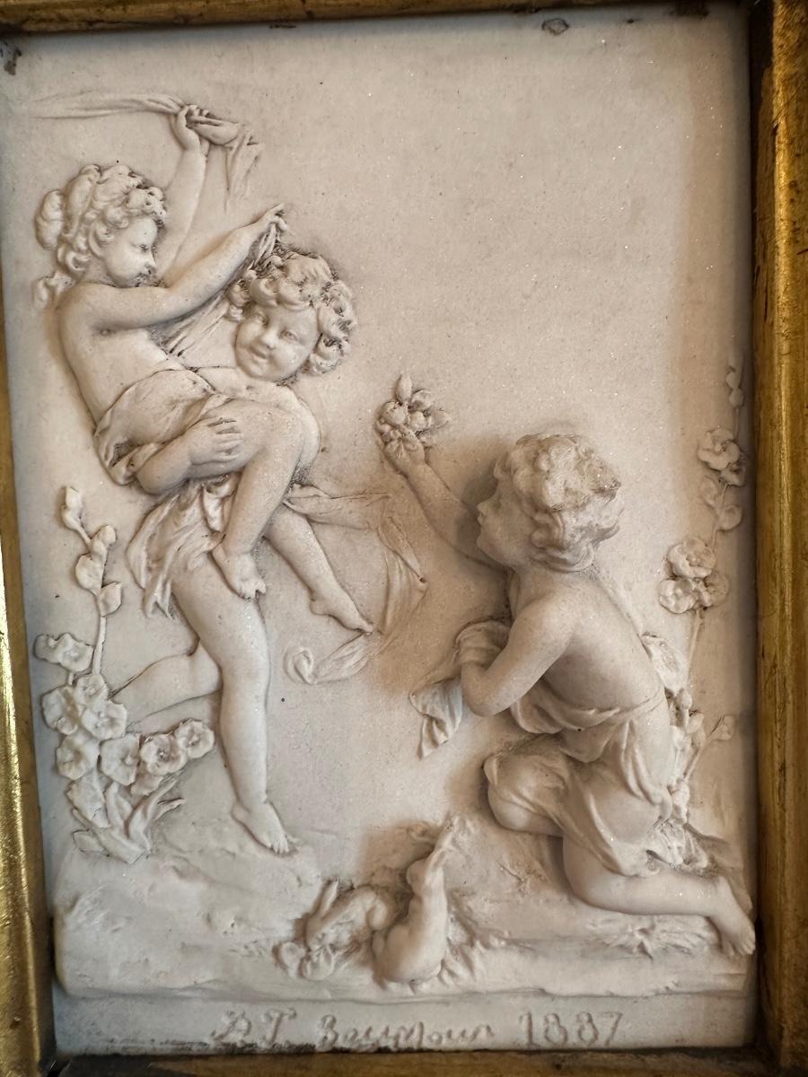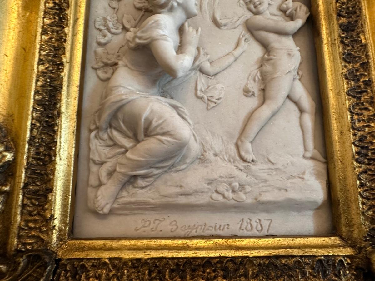 Pair of gilt-framed figural bas-relief plaques, each depicting classical-style scenes with children and draped figures. The reliefs are cast in a light stone-like material and are both signed “P.J. Seymour 1887” along the lower edge.
