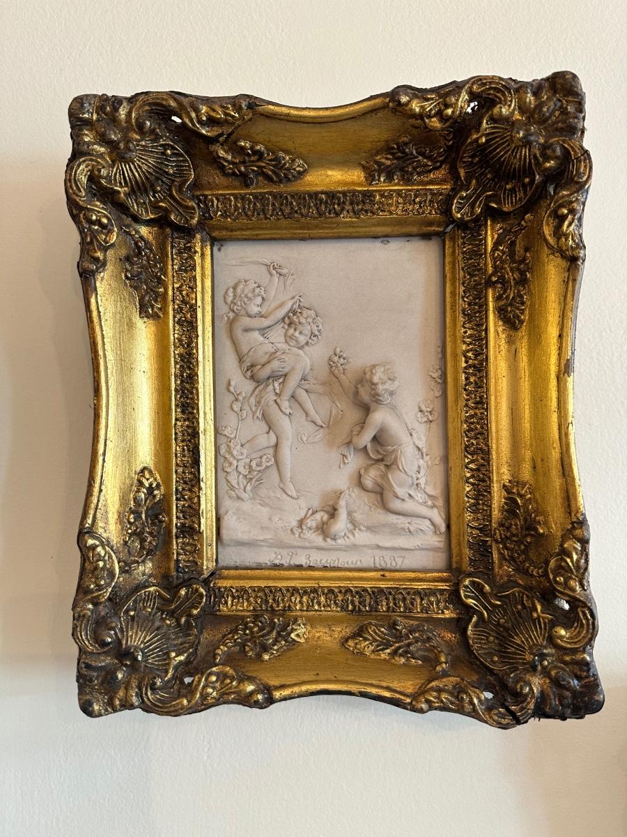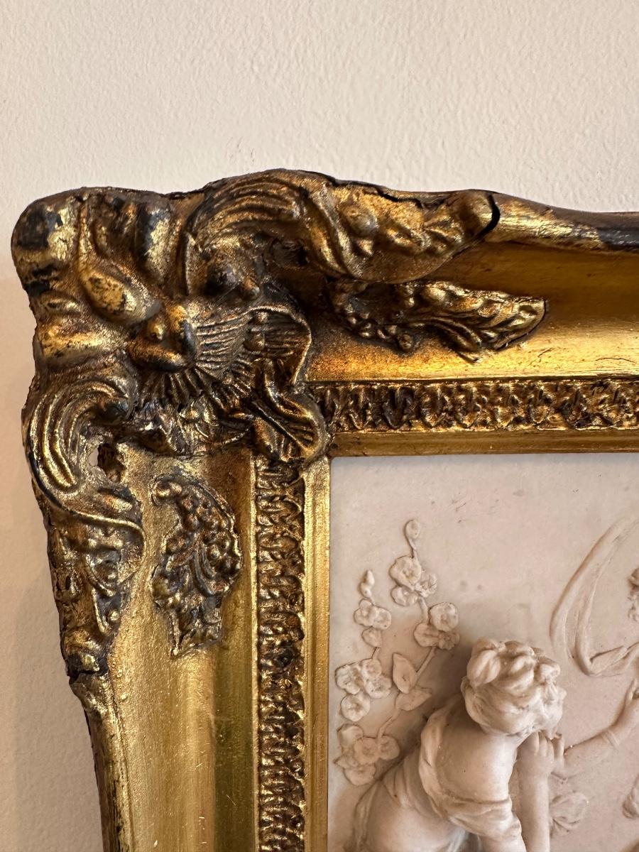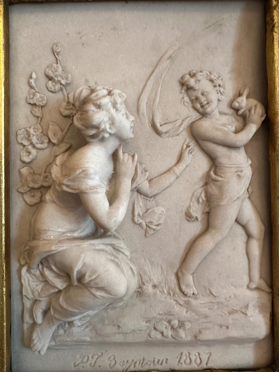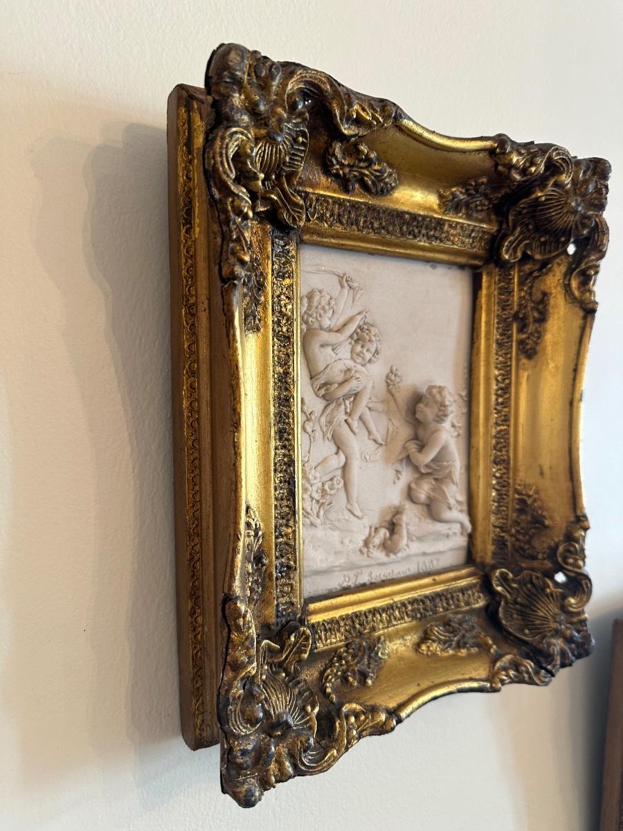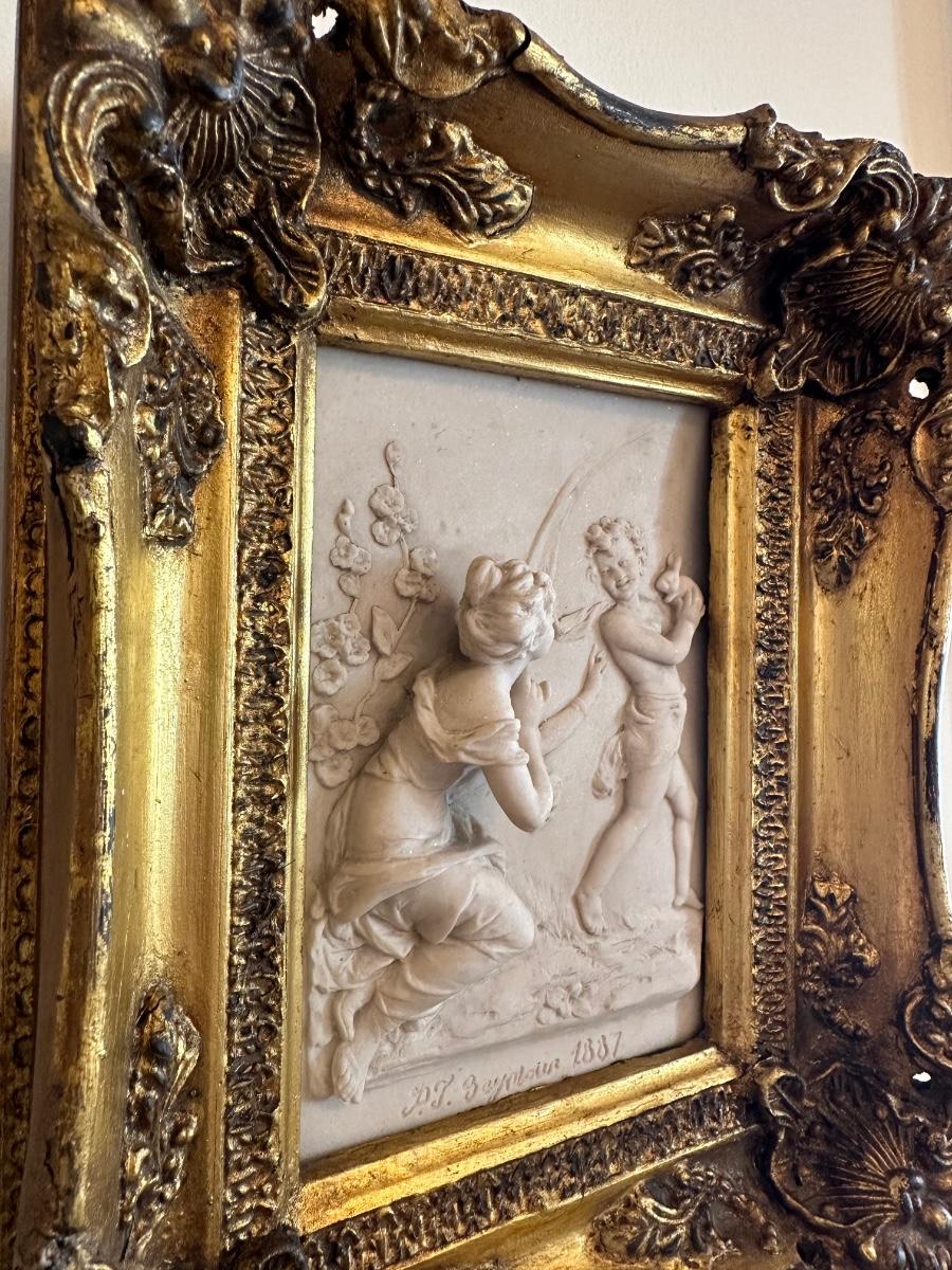 Pair of gilt-framed figural bas-relief plaques, each depicting classical-style scenes with children and draped figures. The reliefs are cast in a light stone-like material and are both signed “P.J. Seymour 1887” along the lower edge.