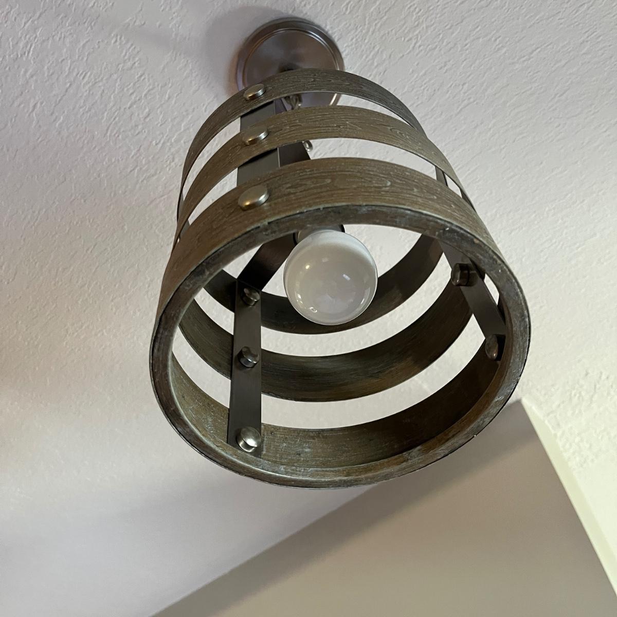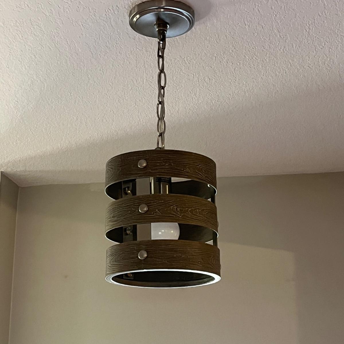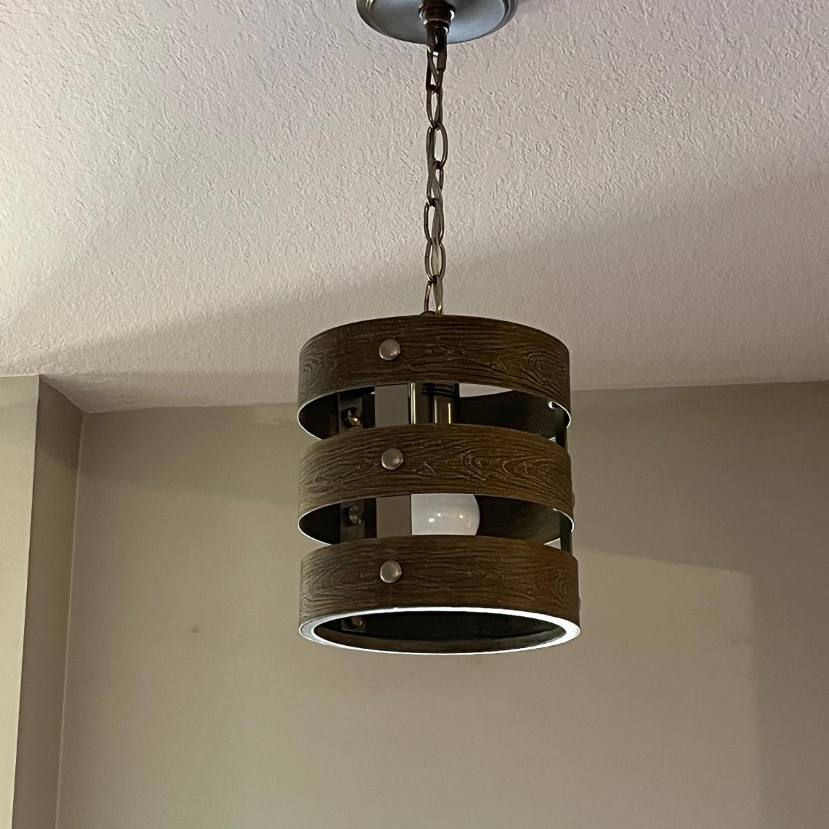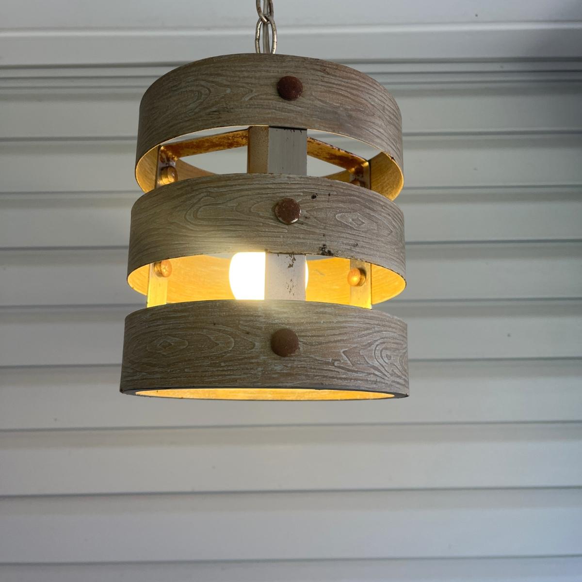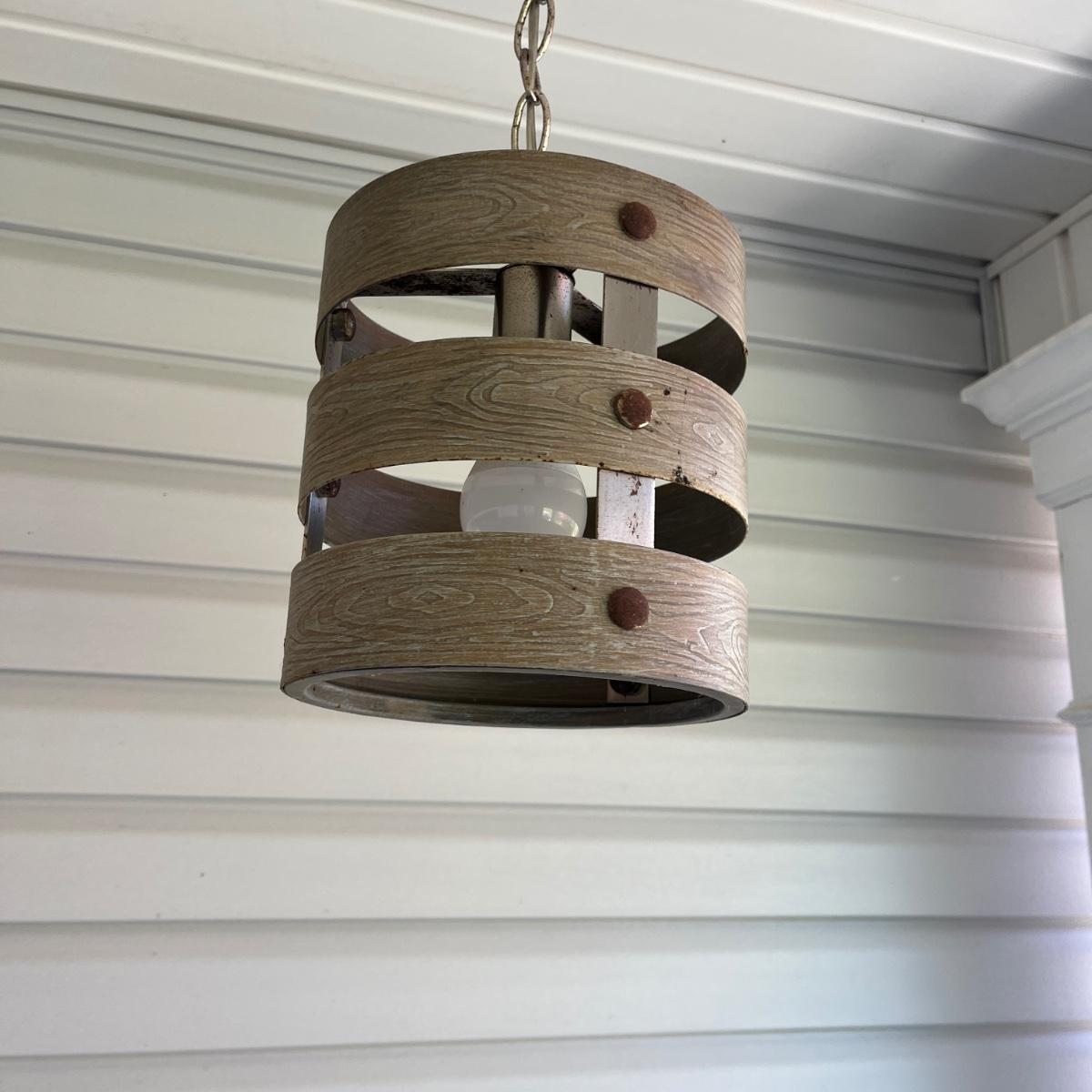 Lot includes a pair of metal ceiling lamps with a faux wood finish. Lights measure 8”D x 10”H with a 18” Chain. The winning bidder will be responsible for taking this down, including disconnecting the electrical components and capping the wires. The lights are 9' from the ground. A ladder will be provided at pickup. One light has rust, see pictures. These lights match other lights in this auction.