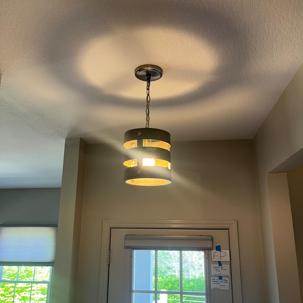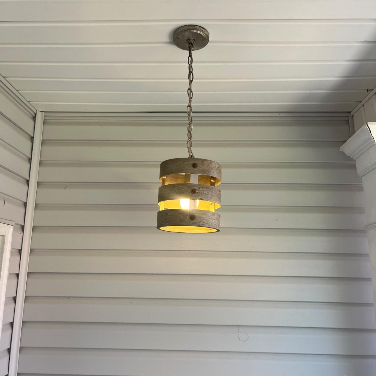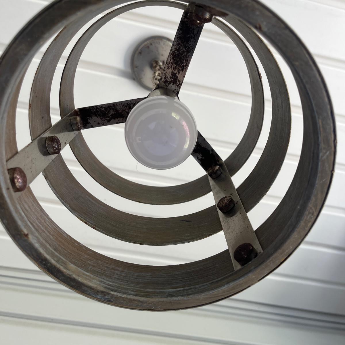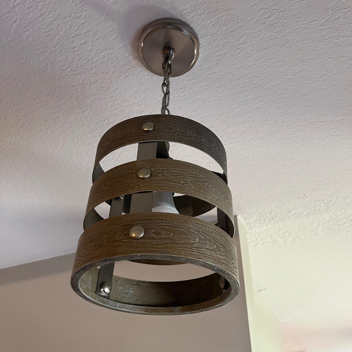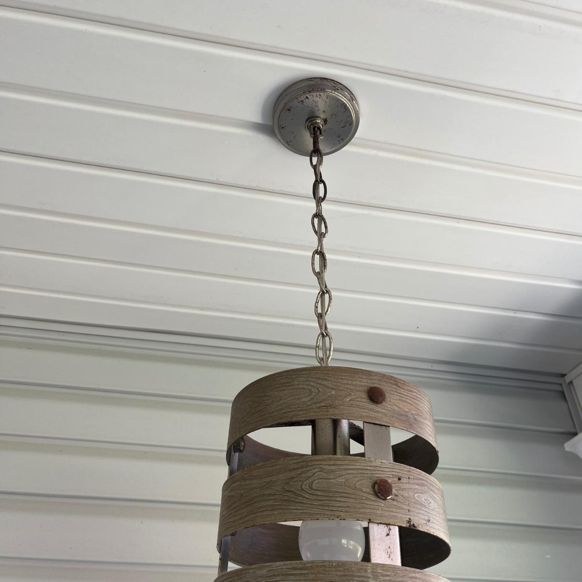 Lot includes a pair of metal ceiling lamps with a faux wood finish. Lights measure 8”D x 10”H with a 18” Chain. The winning bidder will be responsible for taking this down, including disconnecting the electrical components and capping the wires. The lights are 9' from the ground. A ladder will be provided at pickup. One light has rust, see pictures. These lights match other lights in this auction.