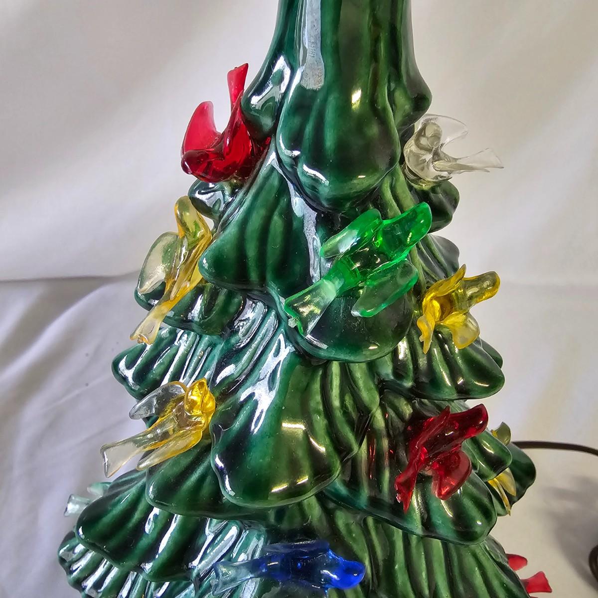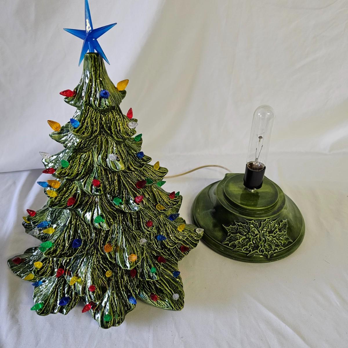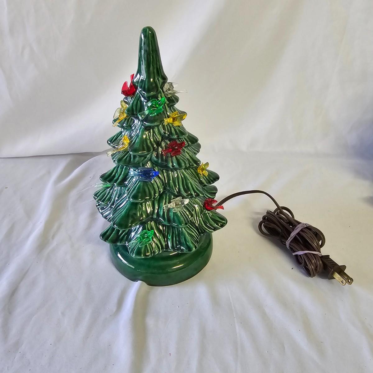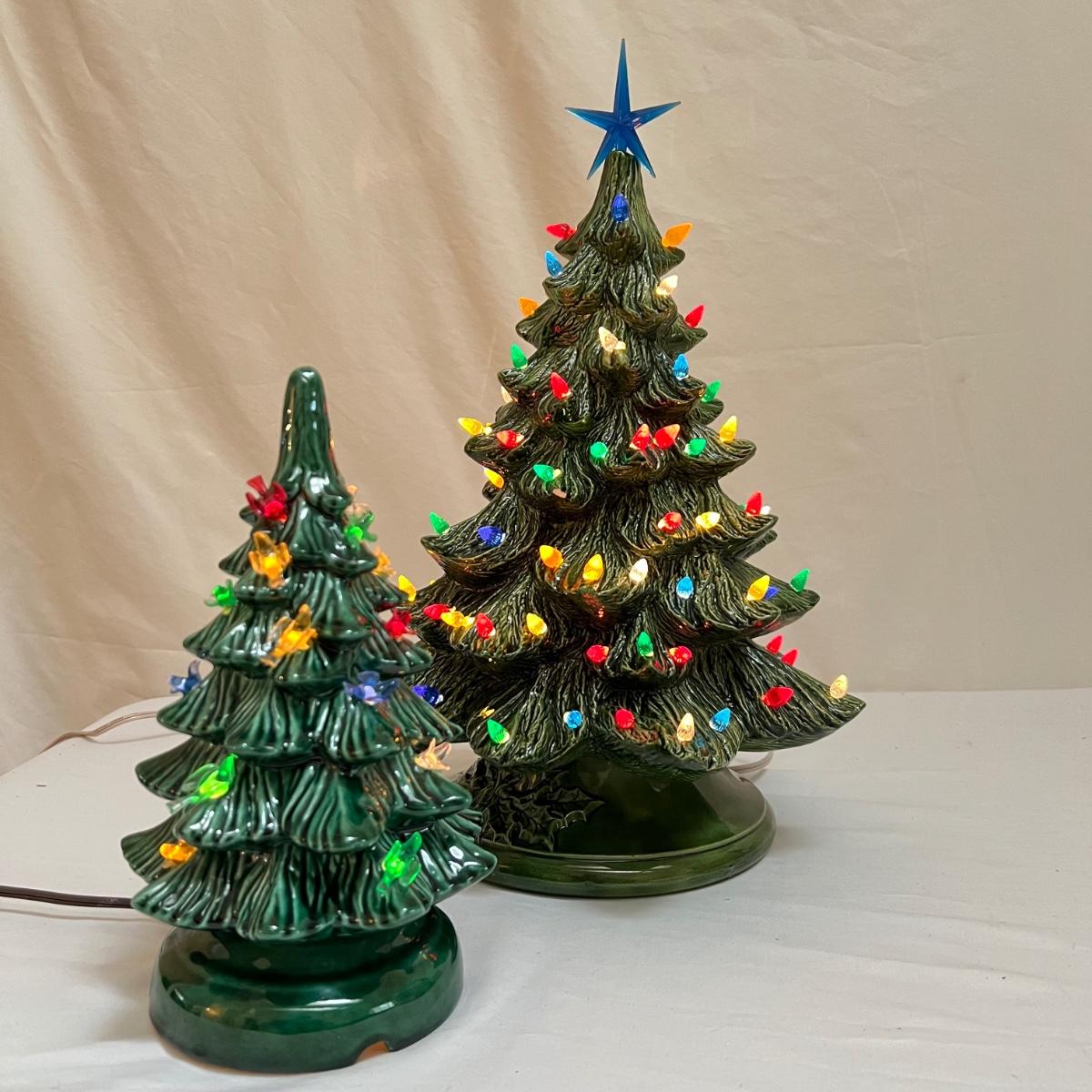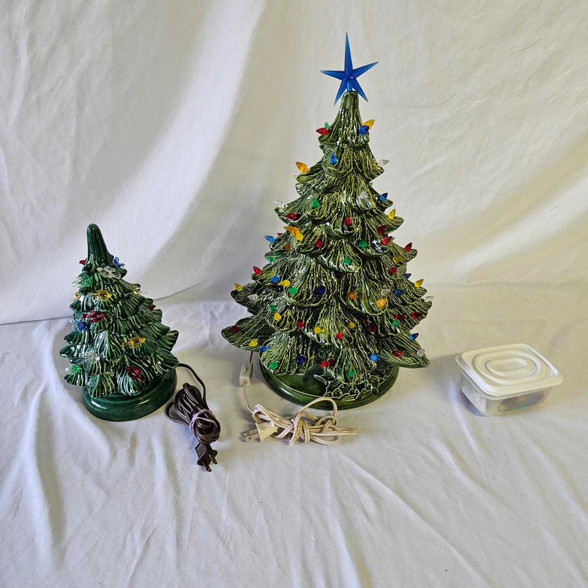 Two traditional style ceramic trees with lights and jewels. Larger tree is 11"D x 18"H, has separate base and inline cord. Tree topper and extra jewels included. Smaller tree is 6"D x 10"H, is all one piece and has bird figure jewels. One bird piece is missing. Inline cord also. Both trees powered on when plugged in. See photos for details. Shipping available.