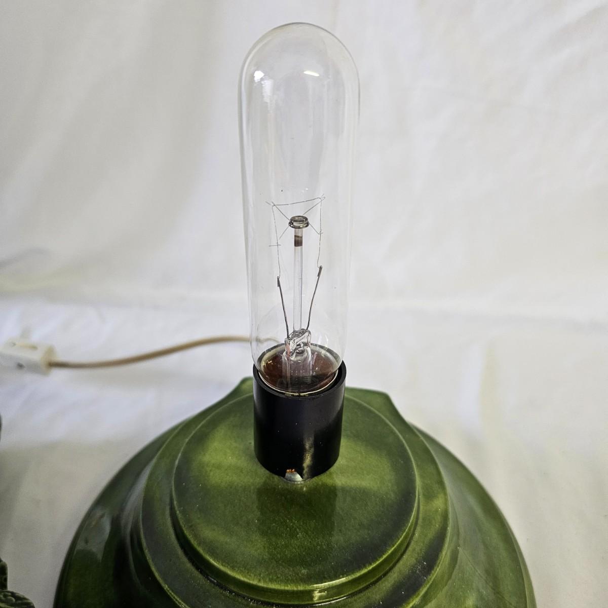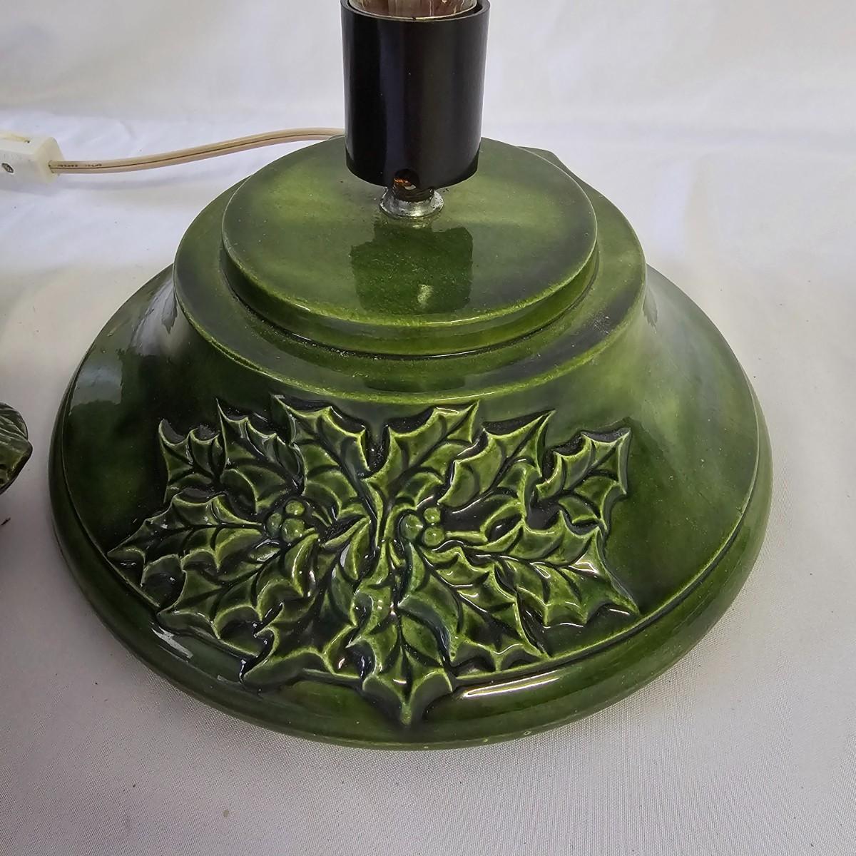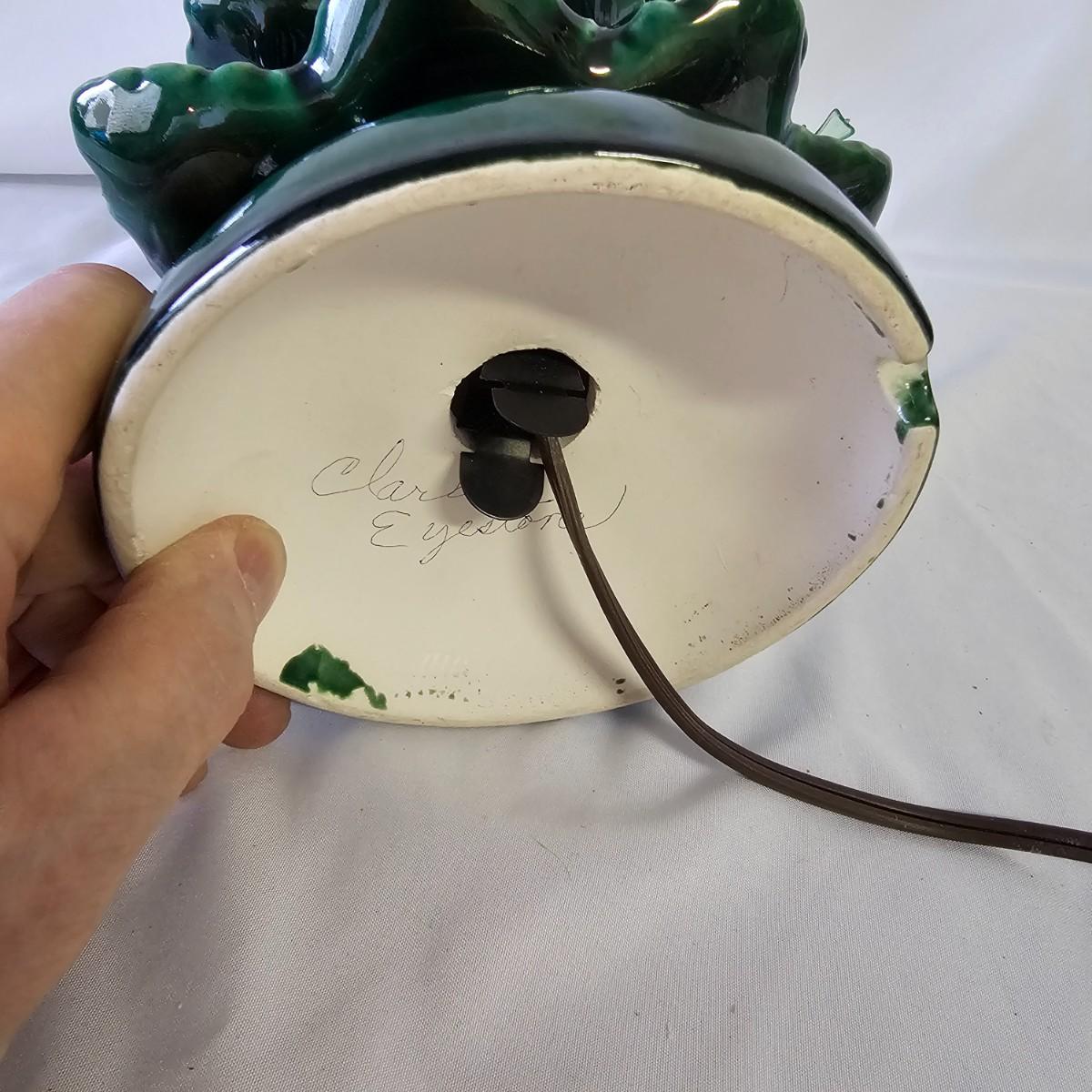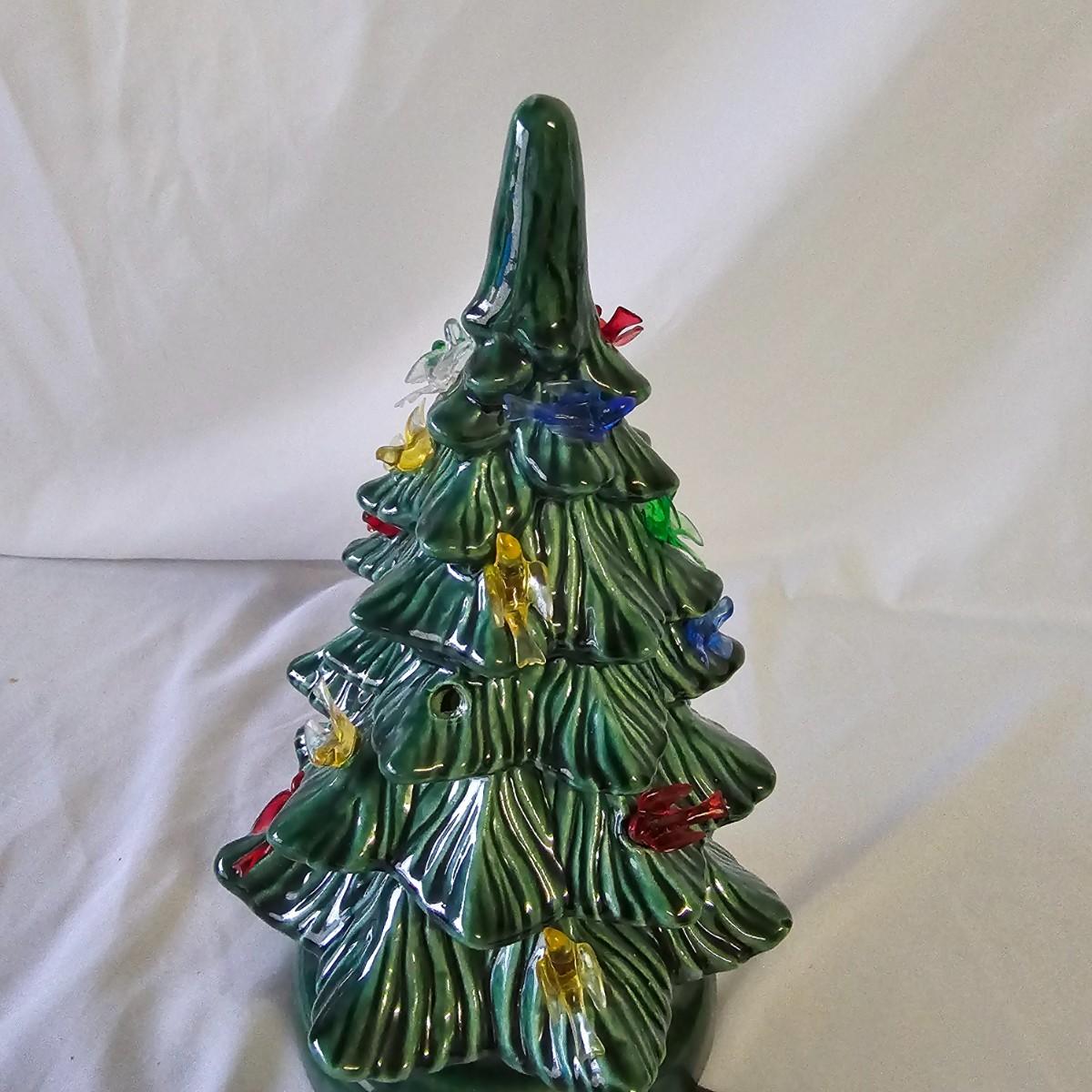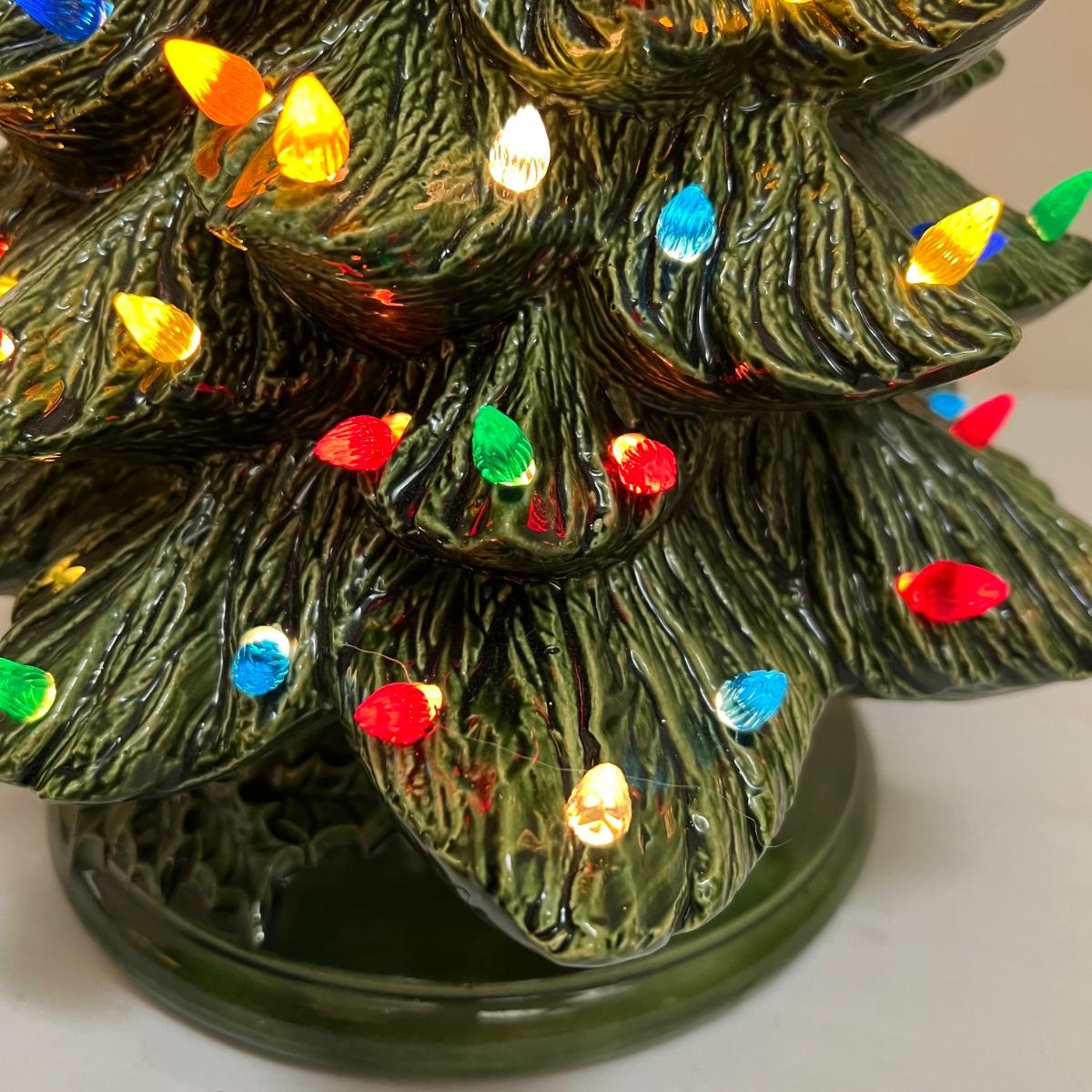Two traditional style ceramic trees with lights and jewels. Larger tree is 11"D x 18"H, has separate base and inline cord. Tree topper and extra jewels included. Smaller tree is 6"D x 10"H, is all one piece and has bird figure jewels. One bird piece is missing. Inline cord also. Both trees powered on when plugged in. See photos for details. Shipping available.