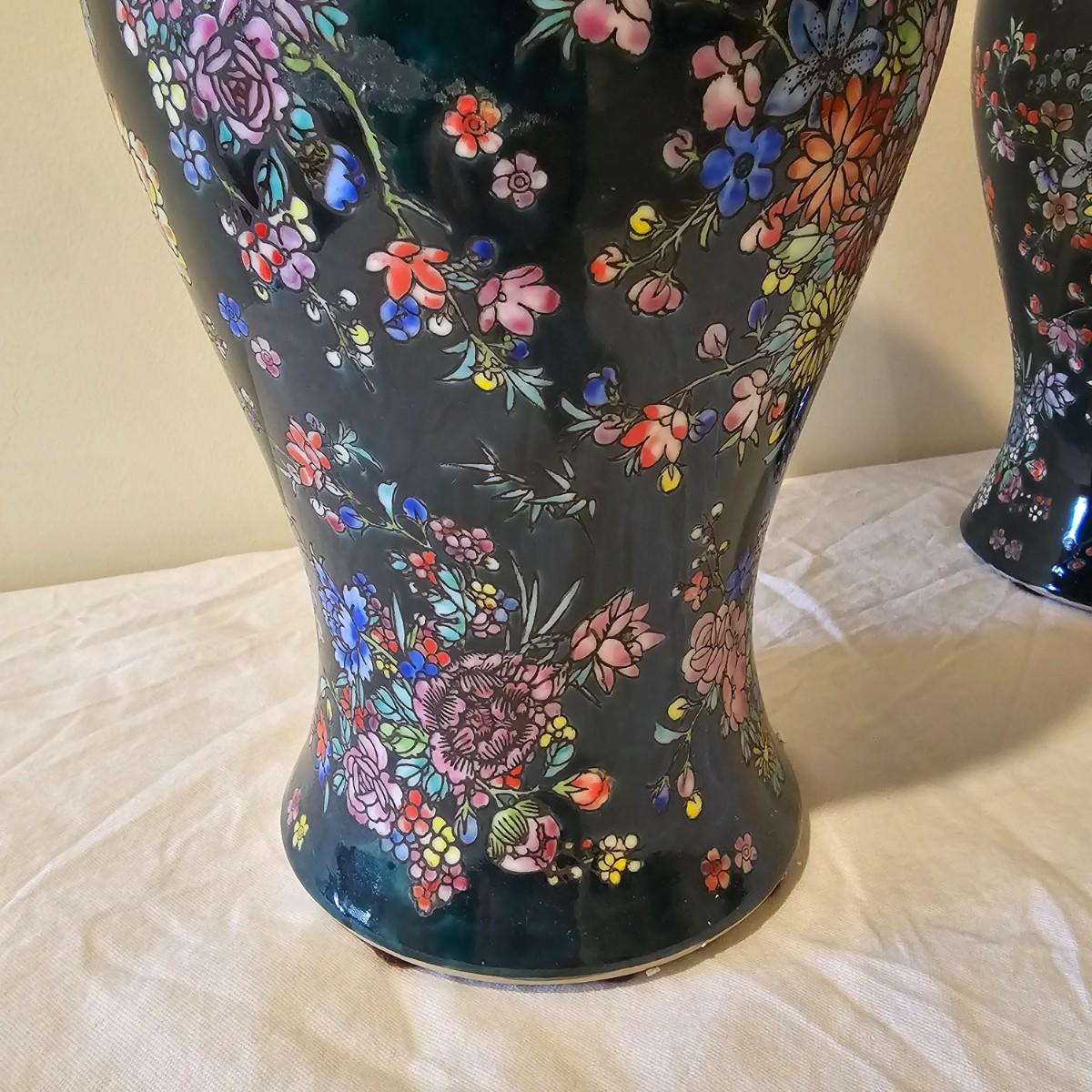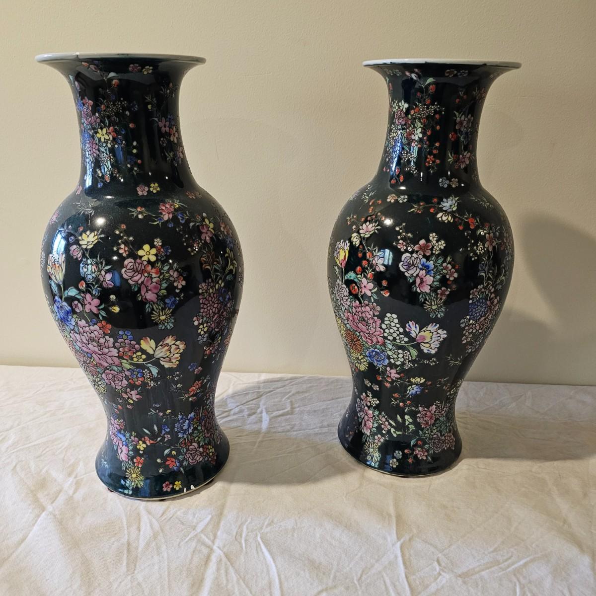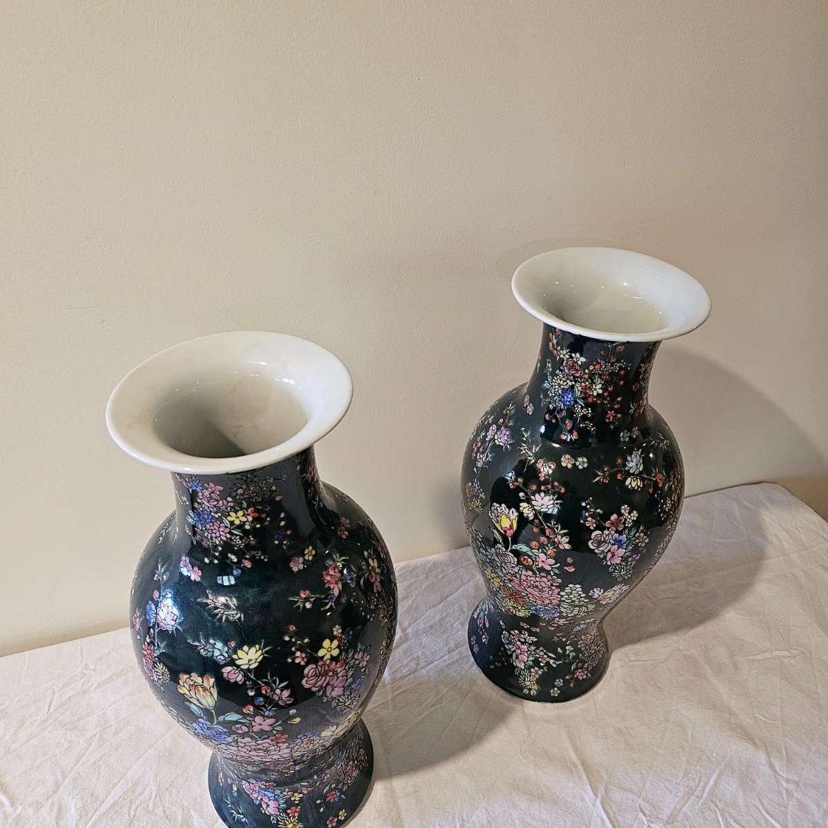 Beautiful dark background with groups and bouquets of flowers, these items have white rims and interior glaze. Each vase measures 8" D x 18" H. See photos for details. Shipping available.
