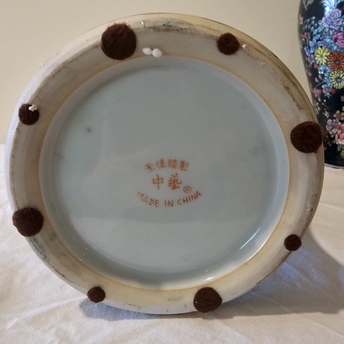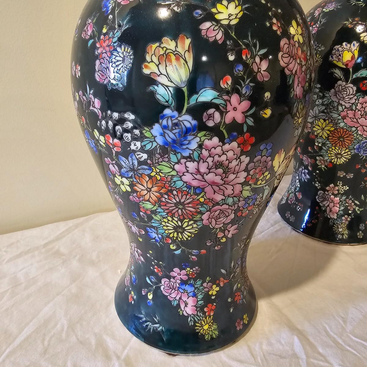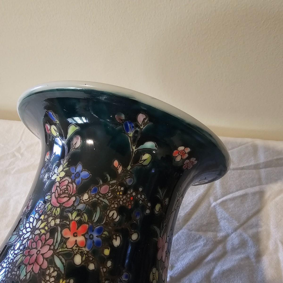 Beautiful dark background with groups and bouquets of flowers, these items have white rims and interior glaze. Each vase measures 8" D x 18" H. See photos for details. Shipping available.