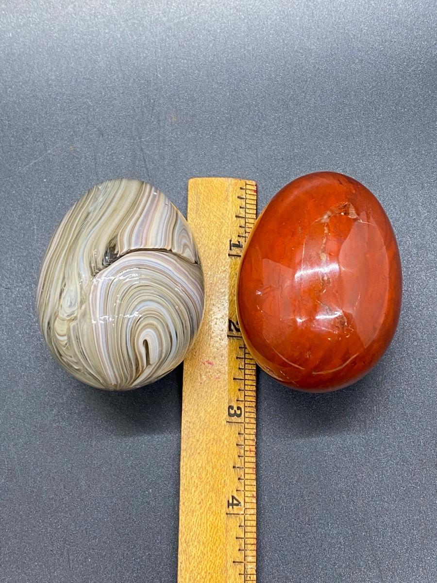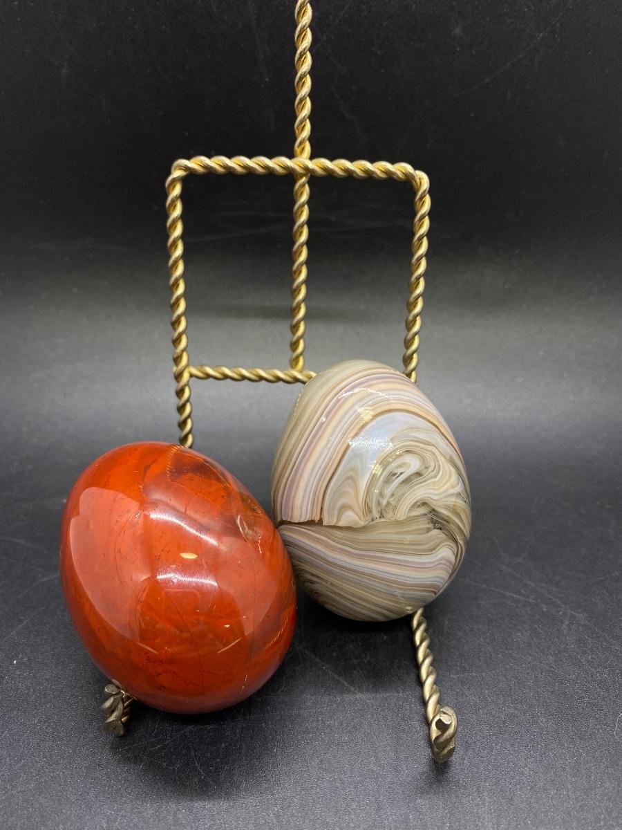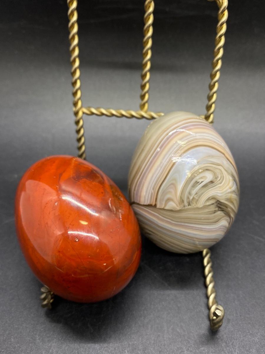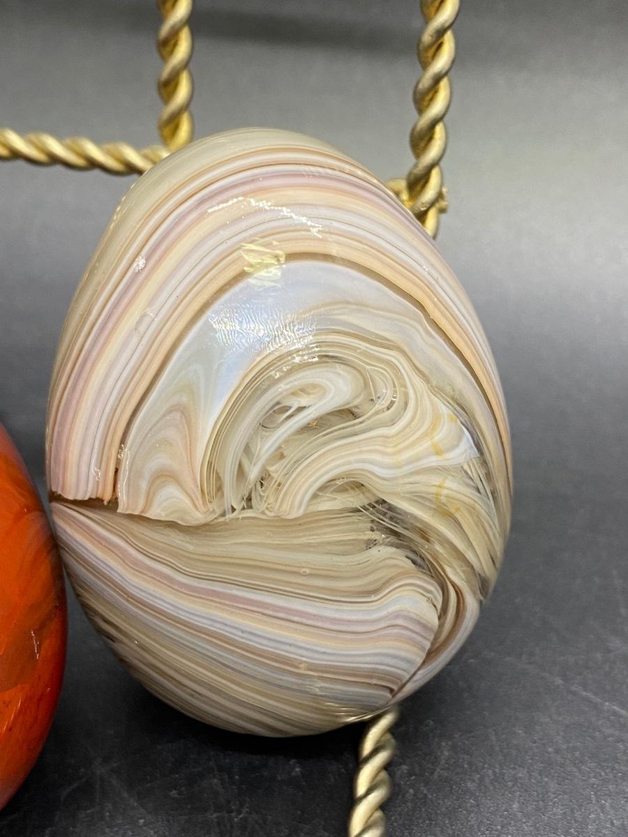 Pair of Blown Glass & Stone Colorful Pattern Eggs, there is no significant damage to either of the pieces and is in good displayable condition. Check pictures for more details and for sizing.