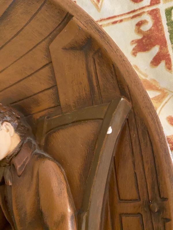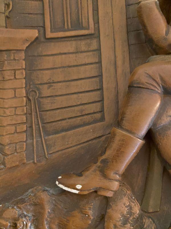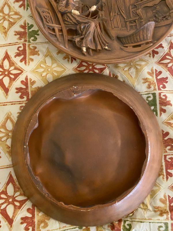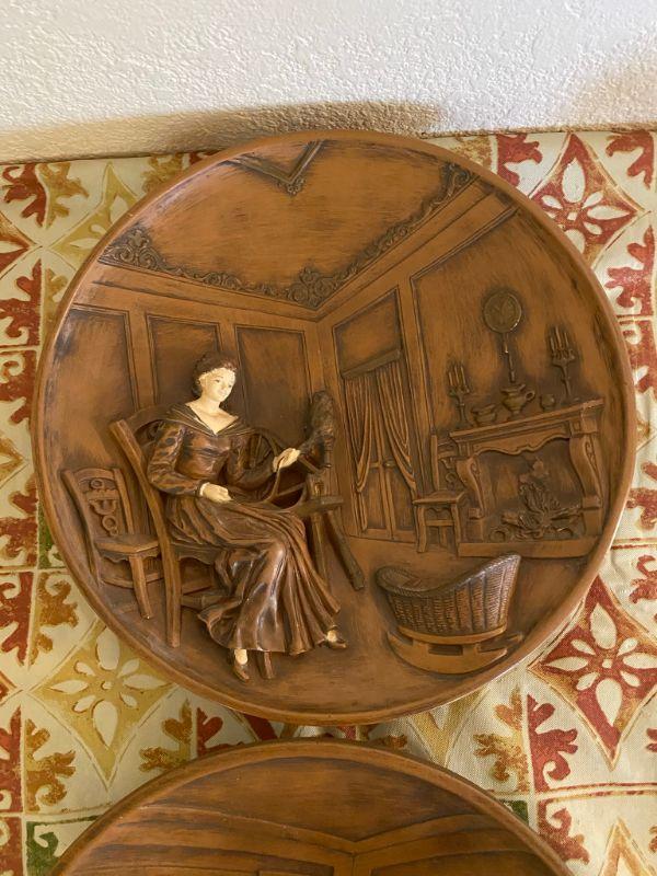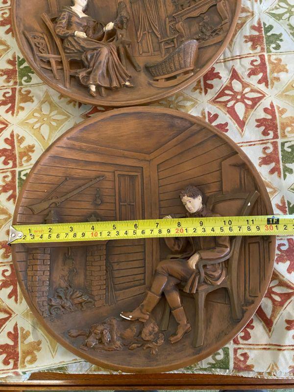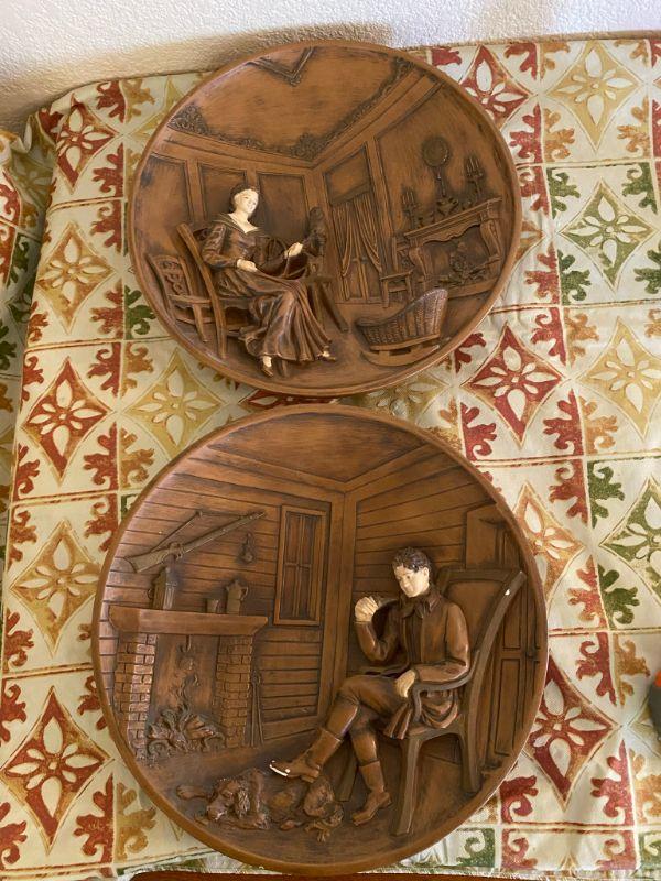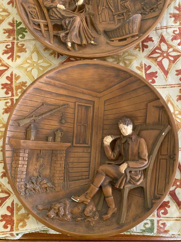 Pair of ceramic embossed wall plates. Cabin scenes. About 12" across, small chips on the guy plate.