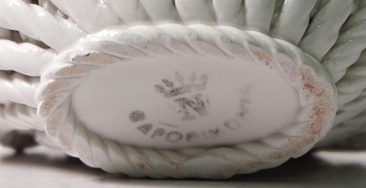 Stamped Capodimonte with a "made it Italy" sticker. Measures approx. 5"H, 5.5"W, 4"D.