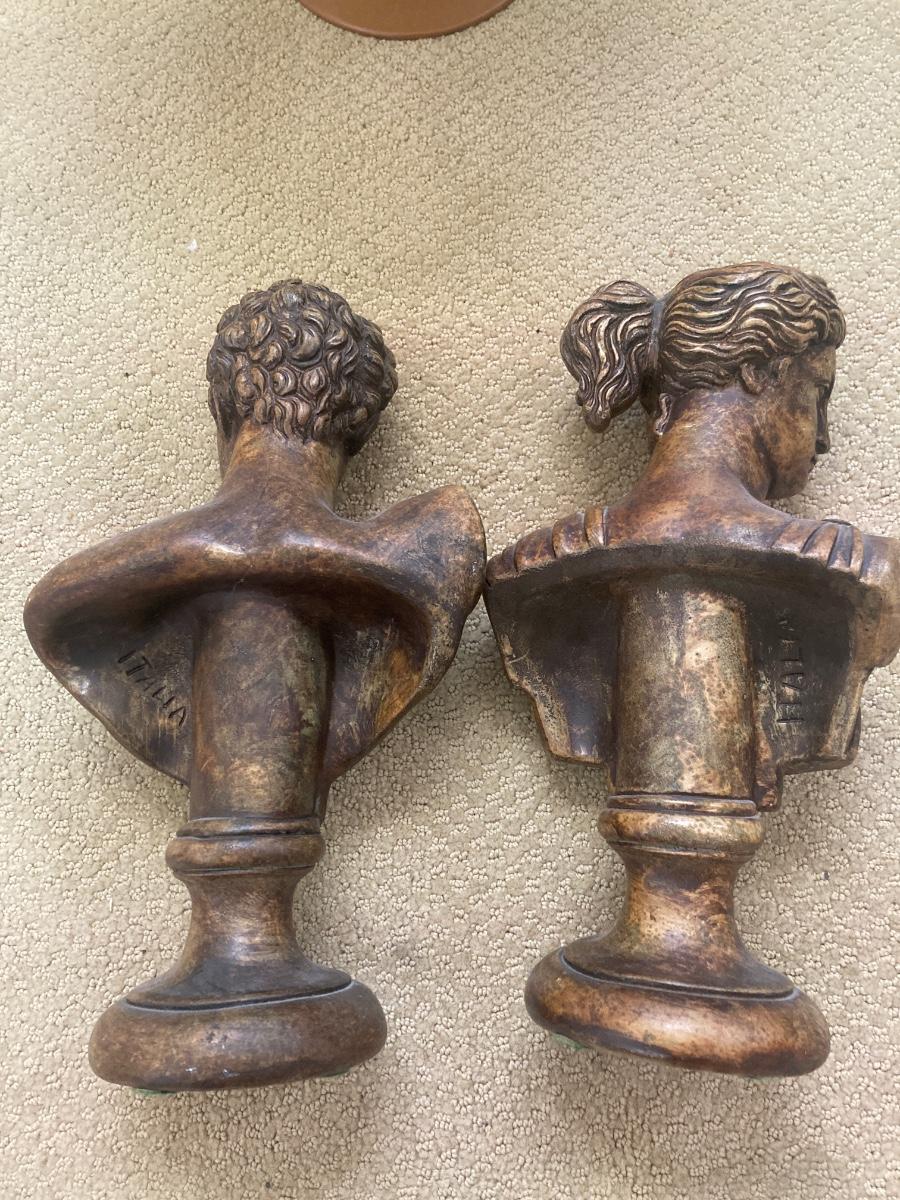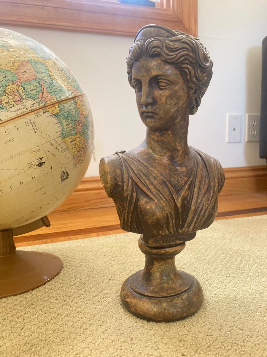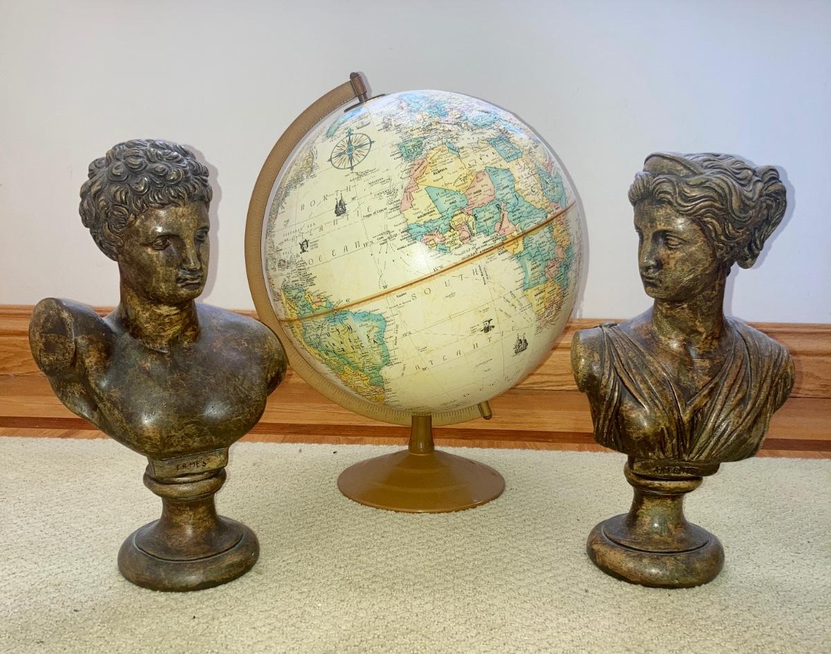 Pair of ceramic busts signed Italy on each. Both 14”in height. 12” Globemaster globe.