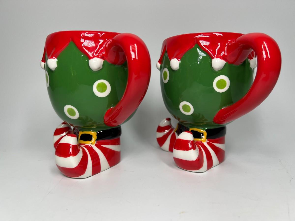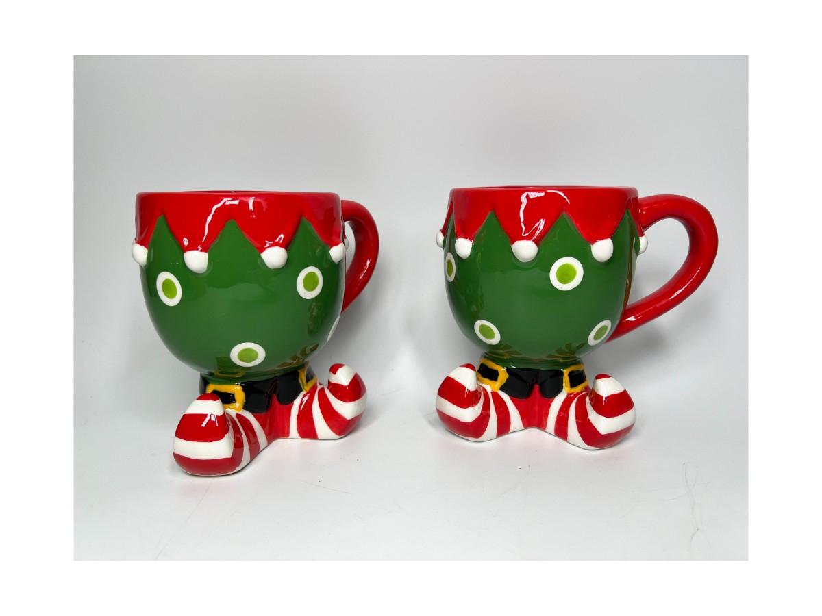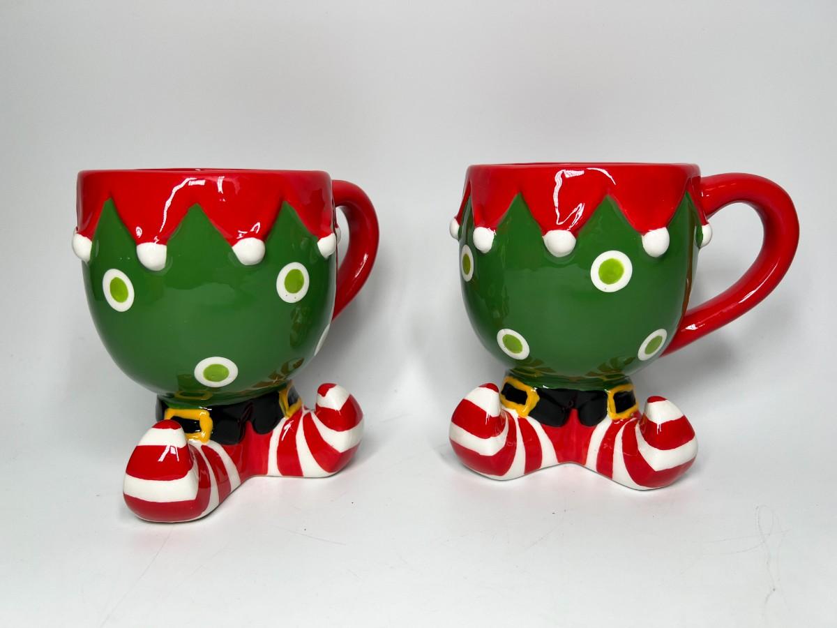 Pair of Ceramic Jolly Elf Shoes Christmas Coffee Tea Mugs, there is no significant damage to the mugs and is in good useable condition. Check pictures for more details and for sizing.