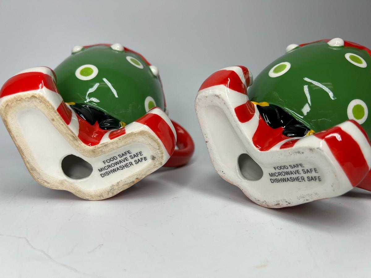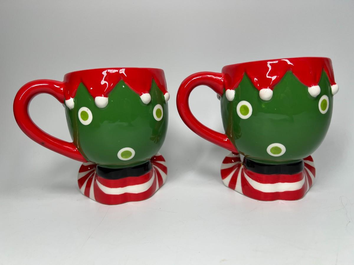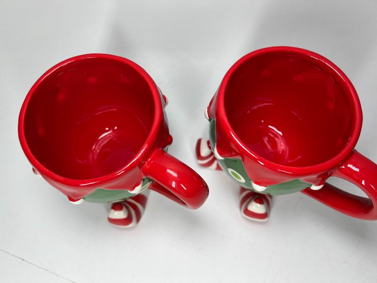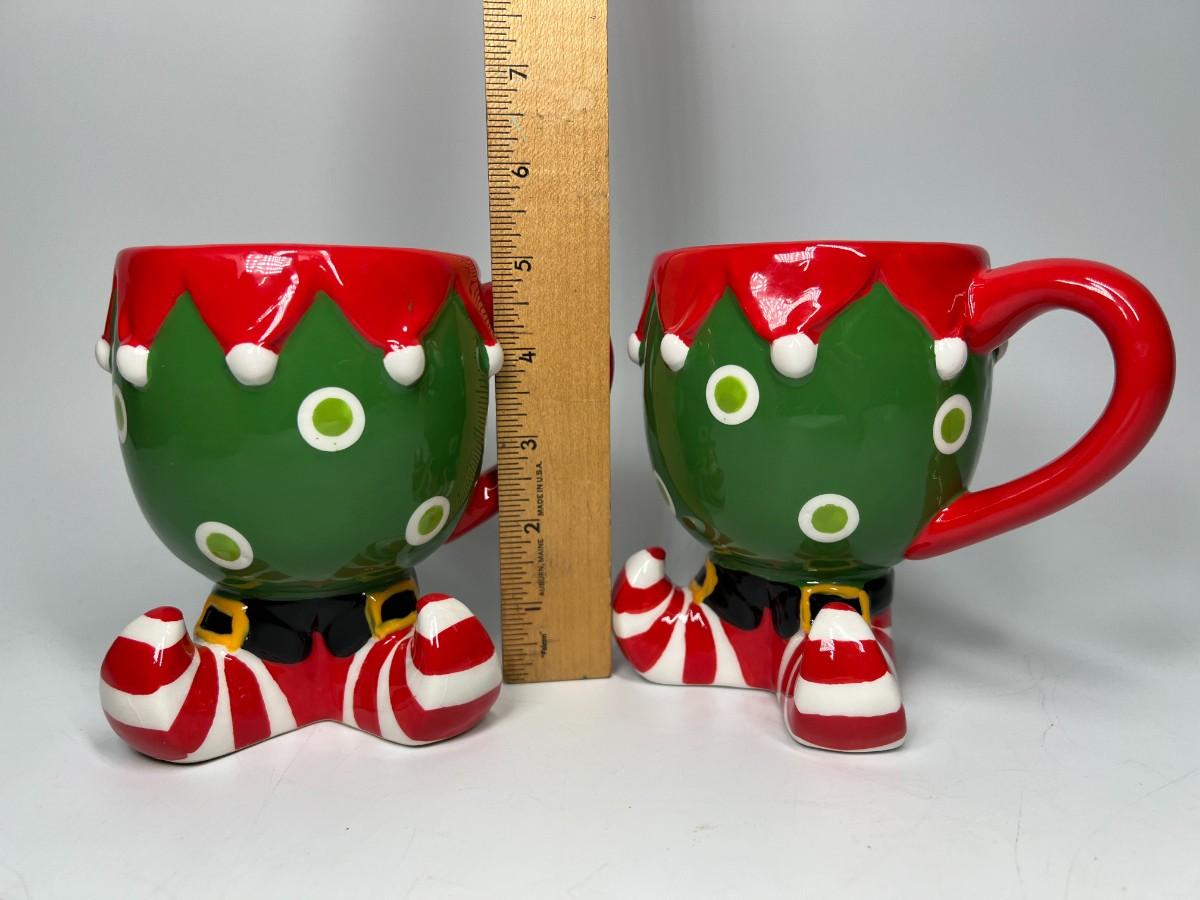 Pair of Ceramic Jolly Elf Shoes Christmas Coffee Tea Mugs, there is no significant damage to the mugs and is in good useable condition. Check pictures for more details and for sizing.