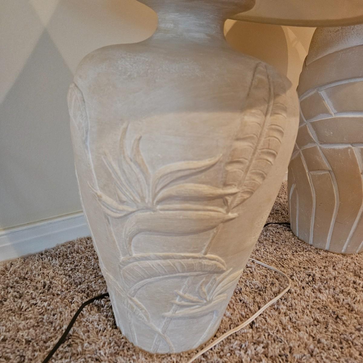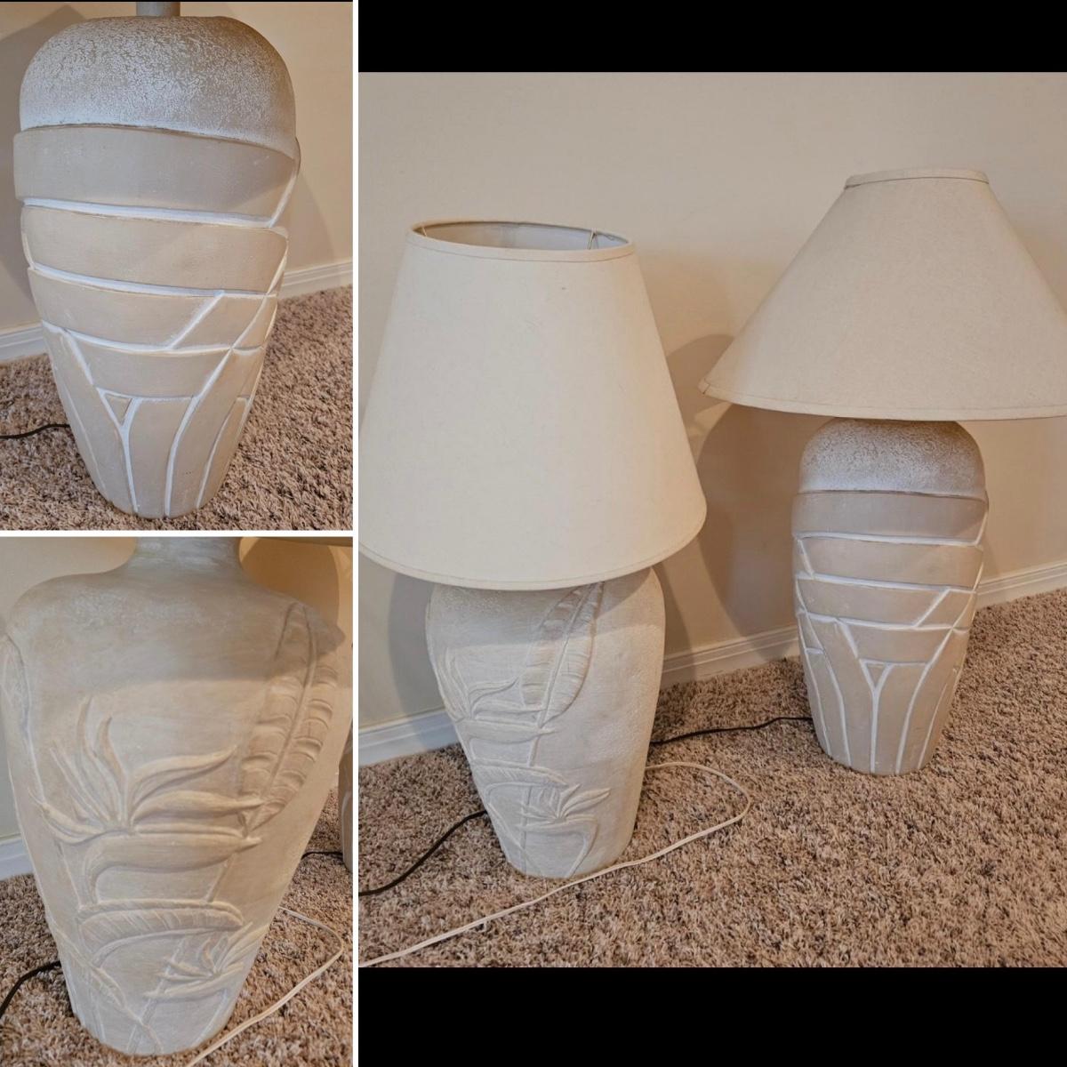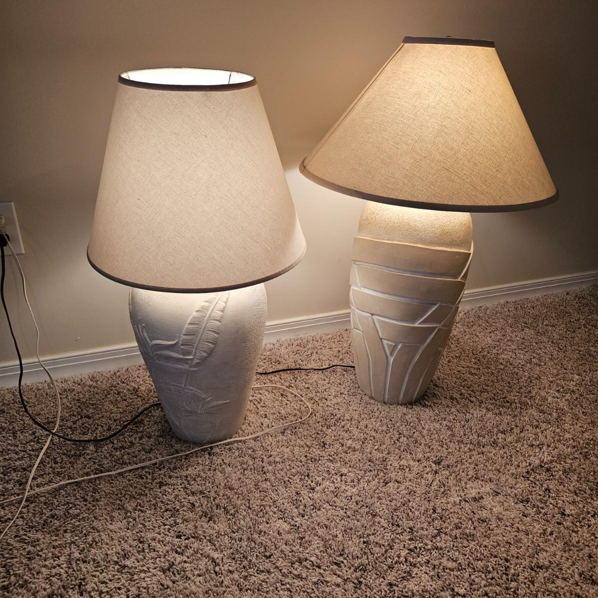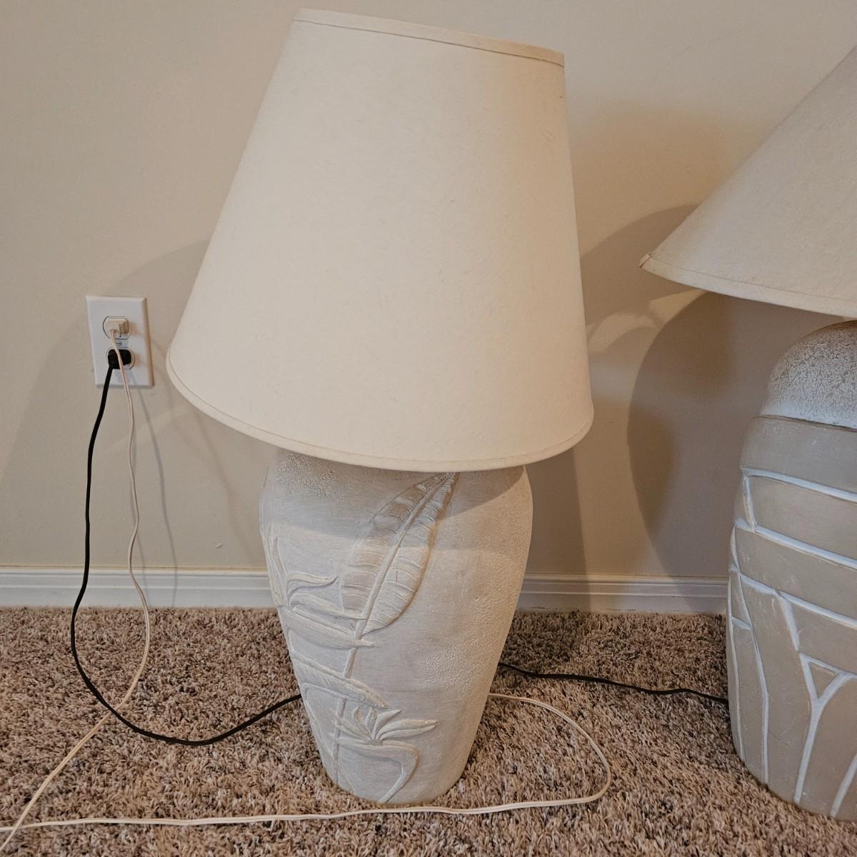 A pair of ceramic table lamps that both powered on when plugged in. Both have three way on/off switches. The smaller lamp has a bird of paradise theme on it and the larger one has a basket weave. The largest lamp measures approximately 19"D x 33"H including the shade. Local pickup only