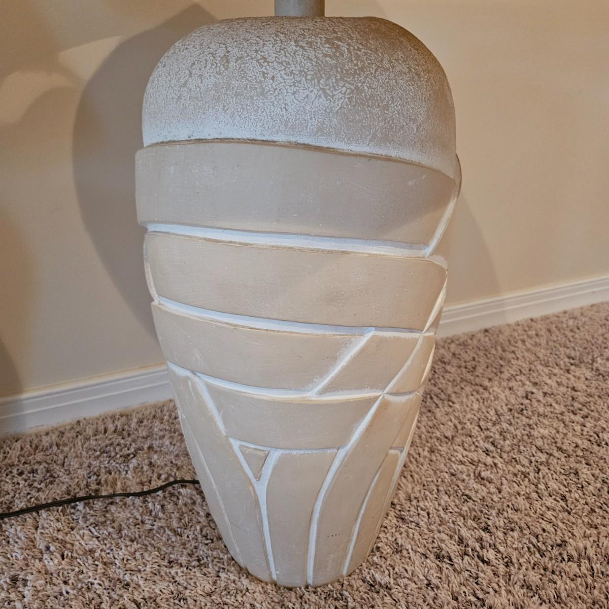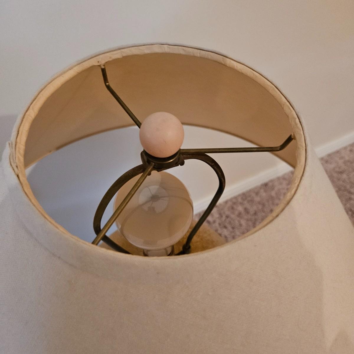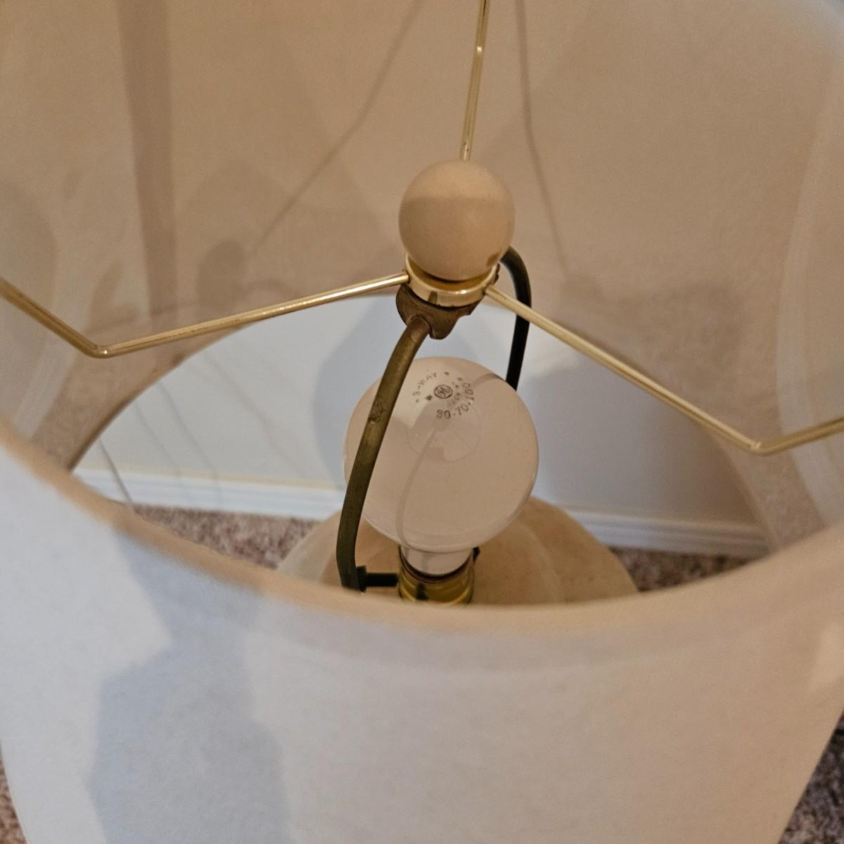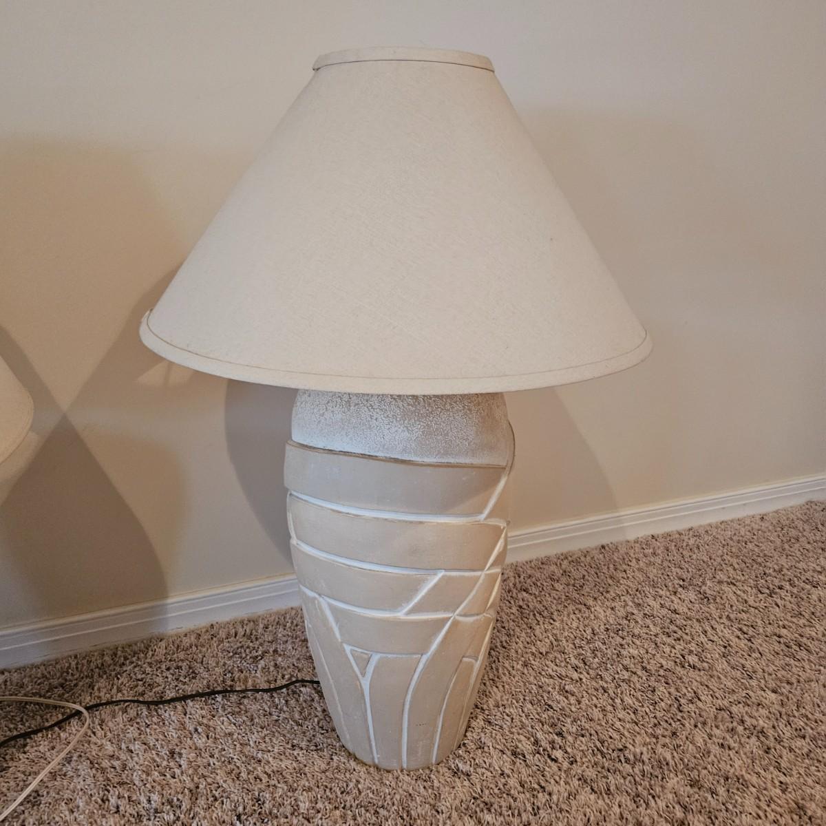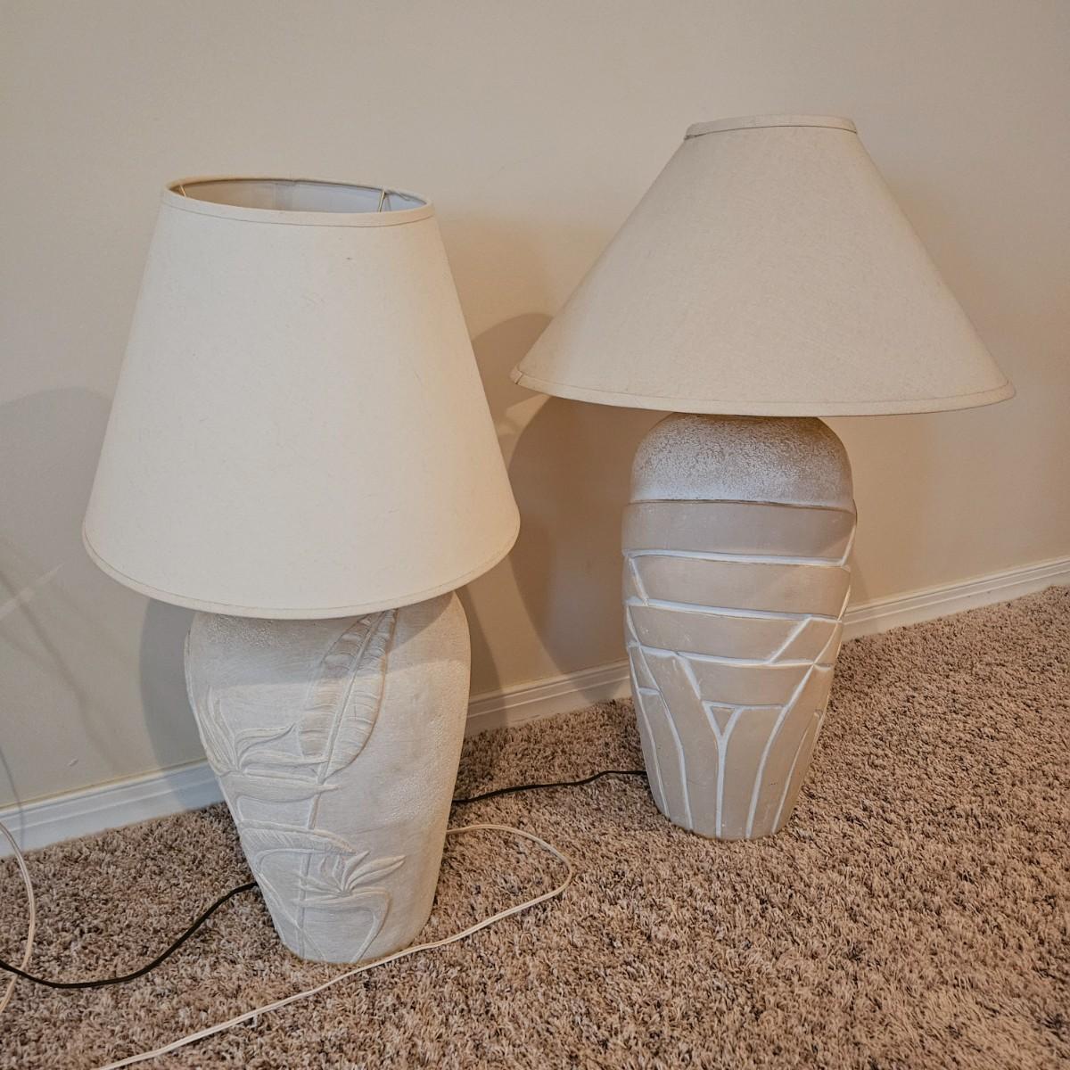 A pair of ceramic table lamps that both powered on when plugged in. Both have three way on/off switches. The smaller lamp has a bird of paradise theme on it and the larger one has a basket weave. The largest lamp measures approximately 19"D x 33"H including the shade. Local pickup only