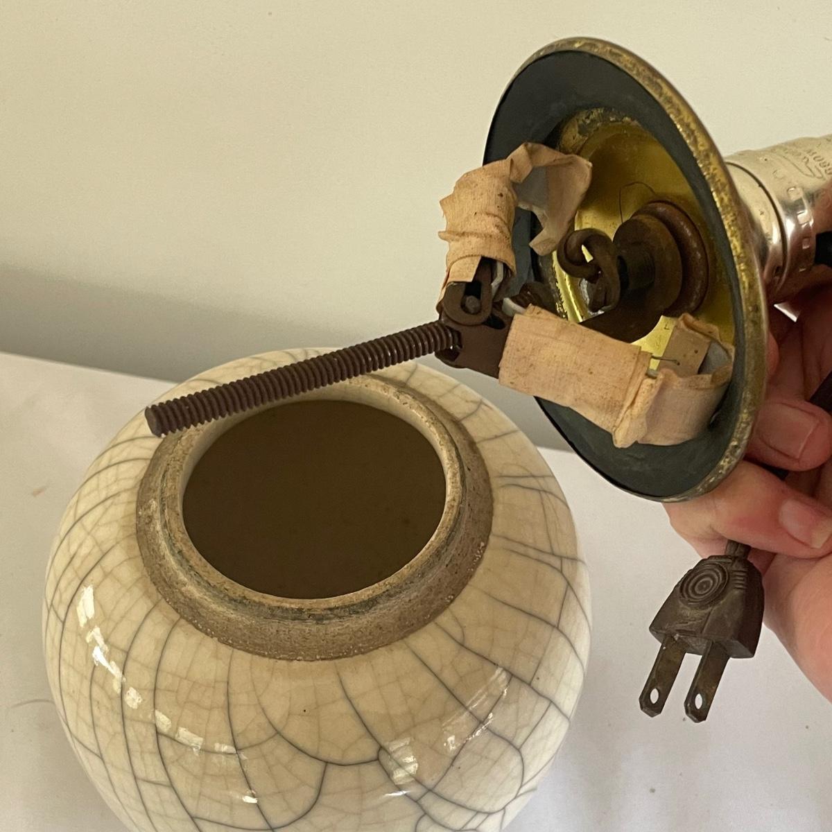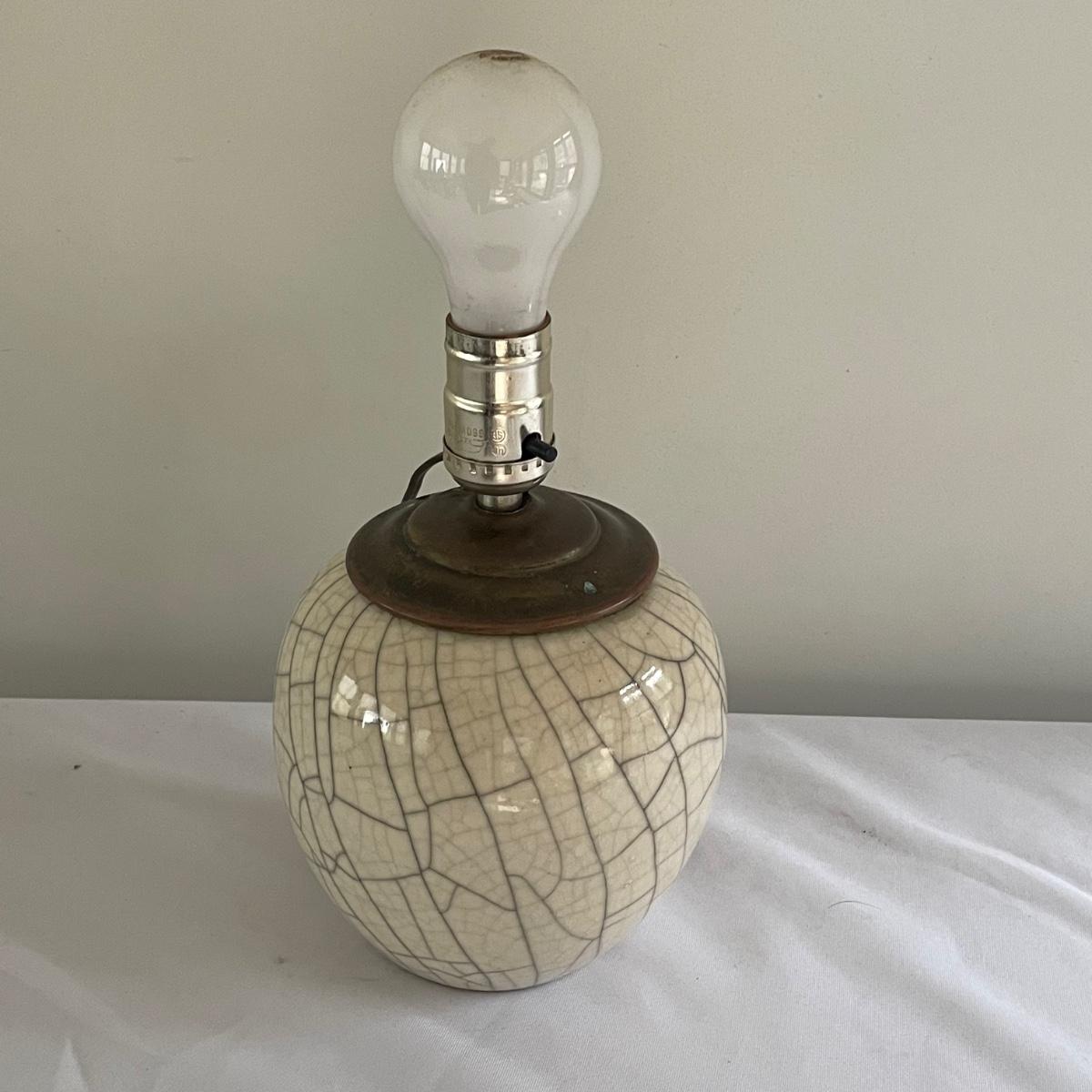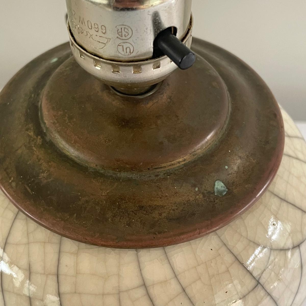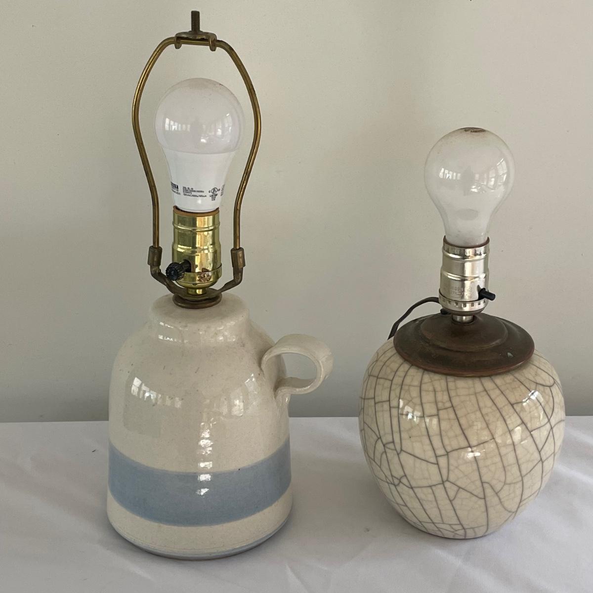 The lamp with the crackle glaze and brass top has a label that reads John Wanamaker, New York. The other ceramic lamp measures 5” d x 15” tall (measured up to the hardware hoop).