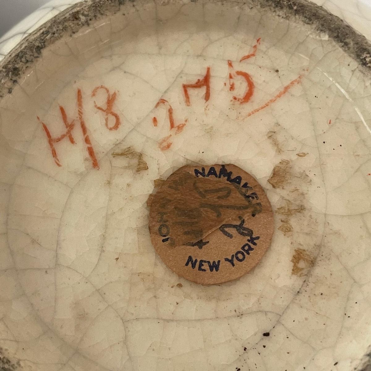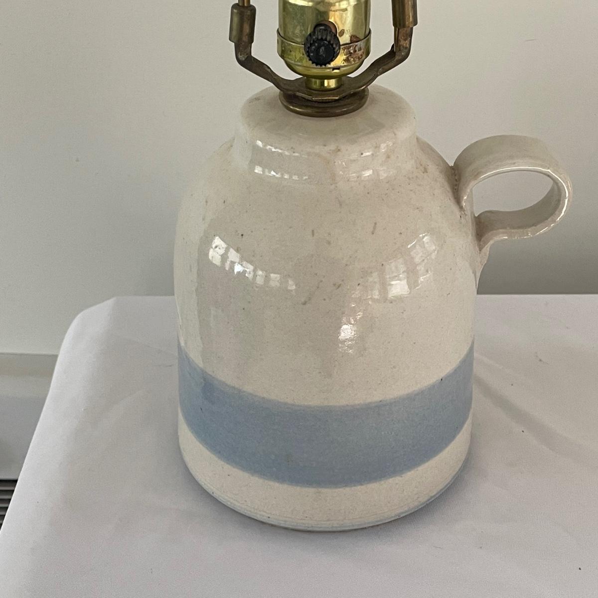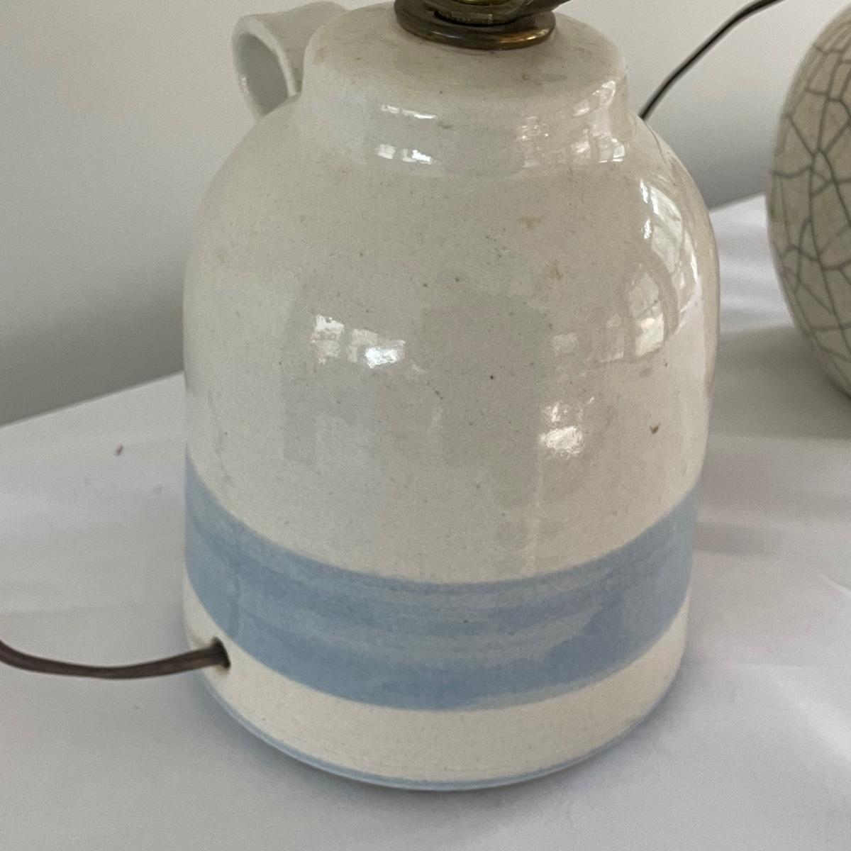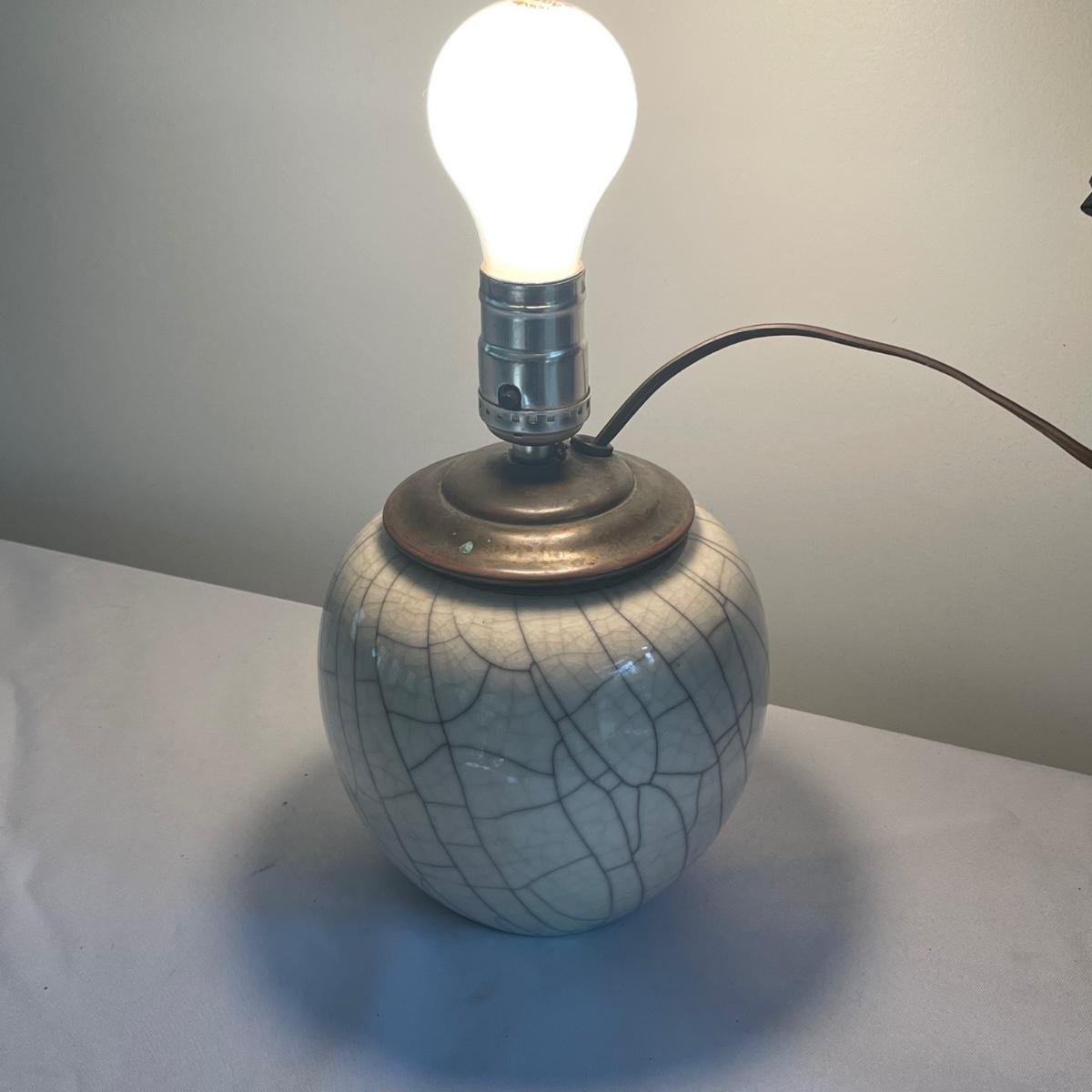 The lamp with the crackle glaze and brass top has a label that reads John Wanamaker, New York. The other ceramic lamp measures 5” d x 15” tall (measured up to the hardware hoop).