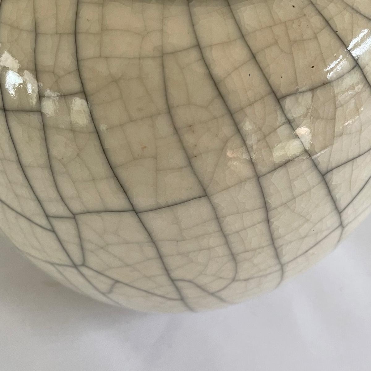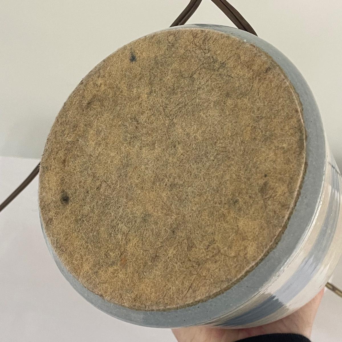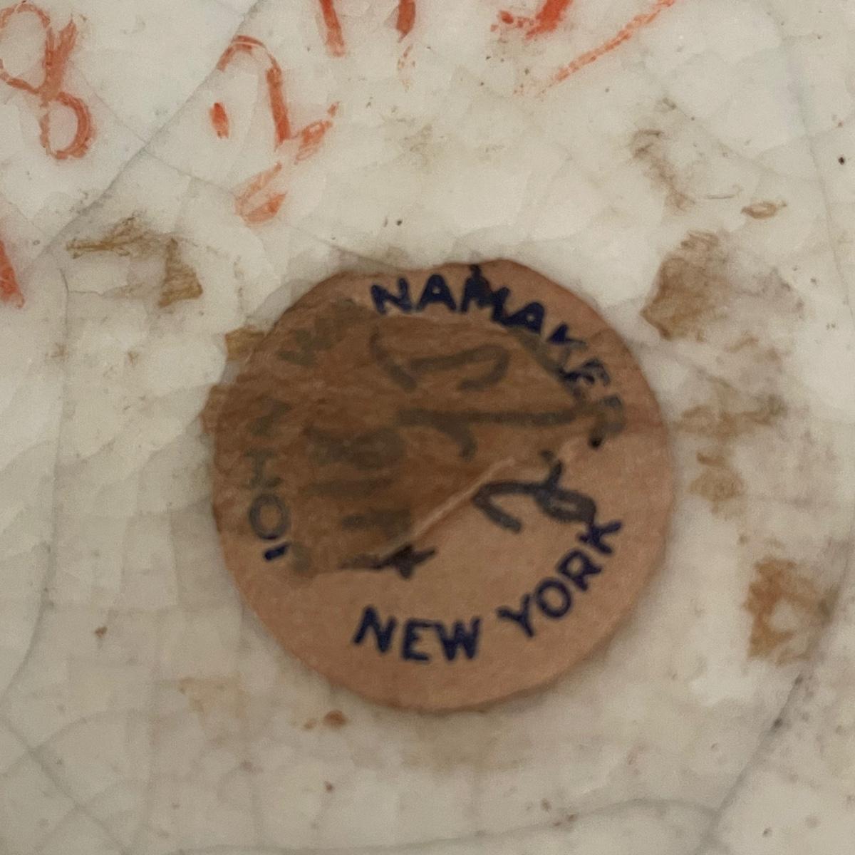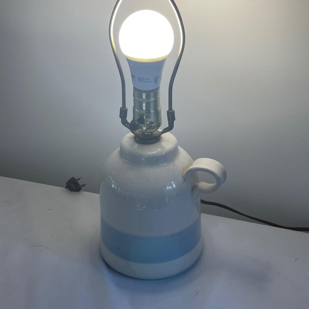 The lamp with the crackle glaze and brass top has a label that reads John Wanamaker, New York. The other ceramic lamp measures 5” d x 15” tall (measured up to the hardware hoop).