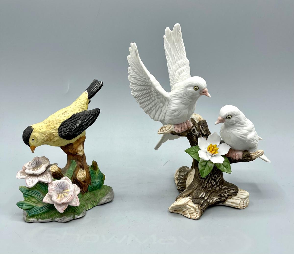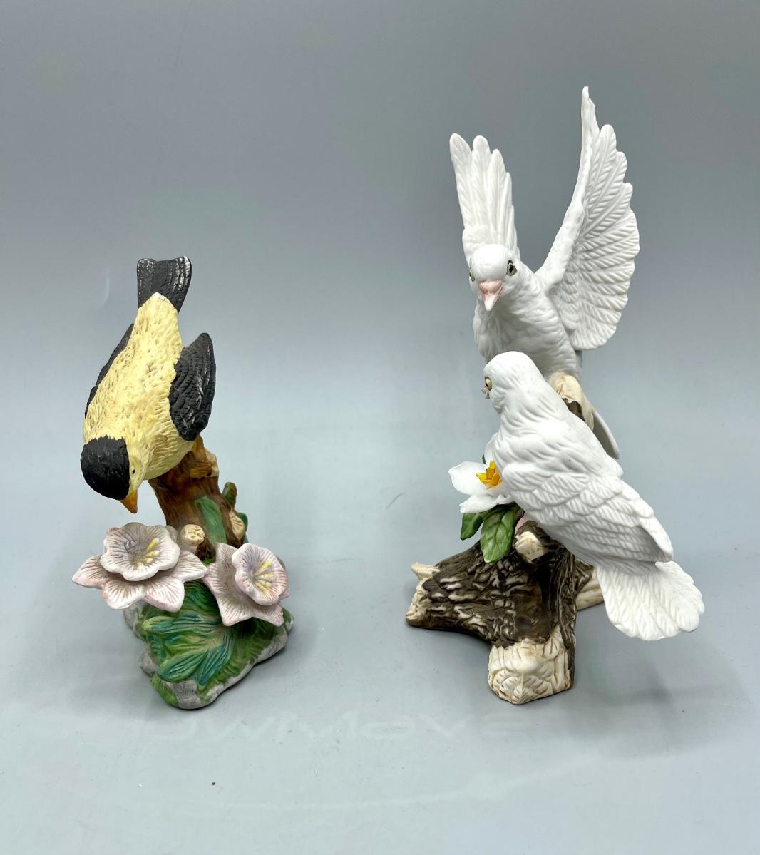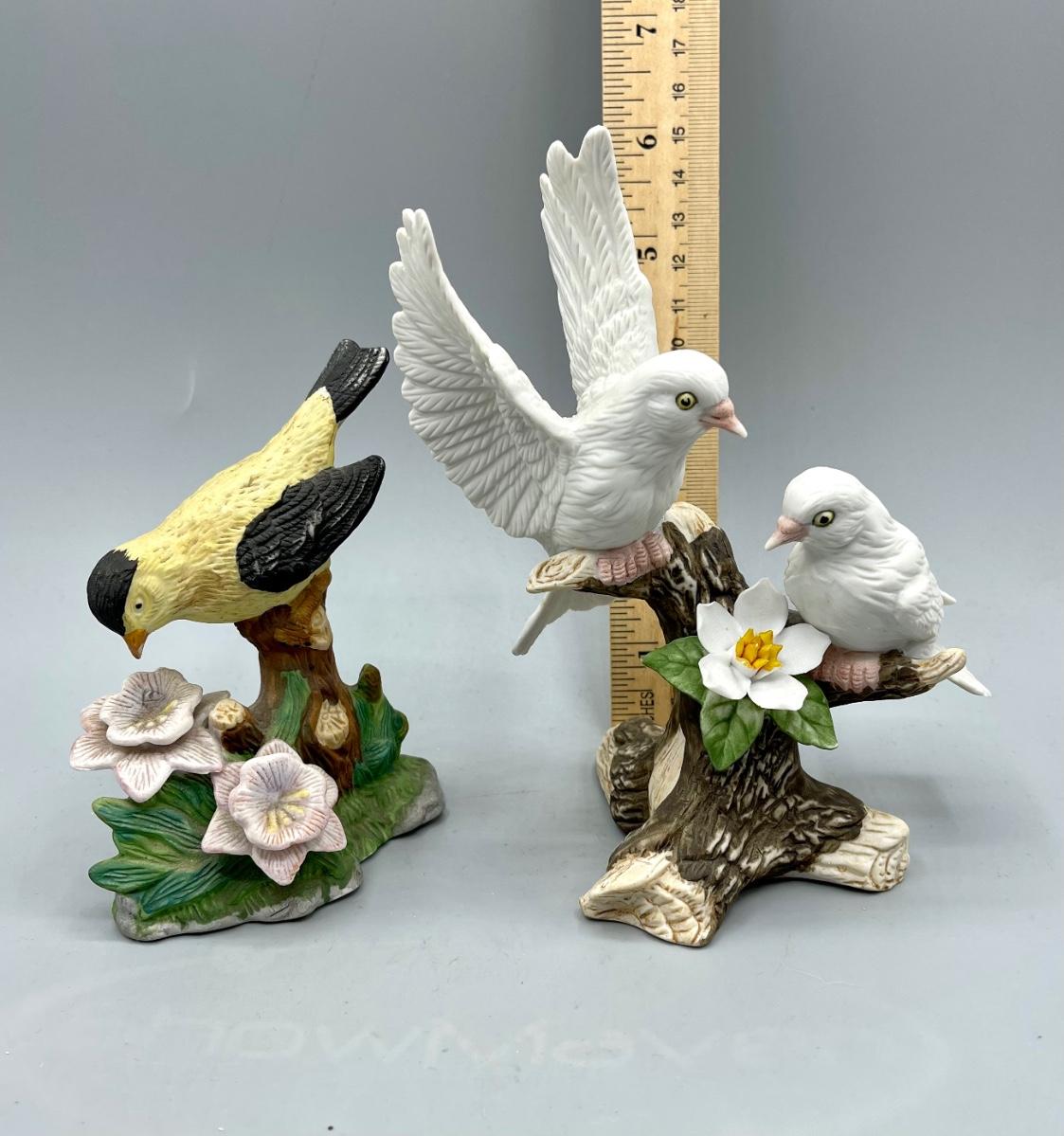 Pair of Ceramic Perching Bird Figurines Russ Nature's Song Goldfinch & Doves
