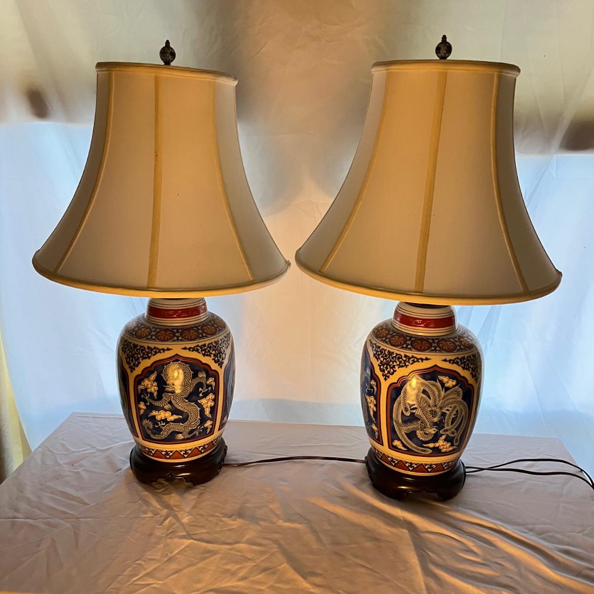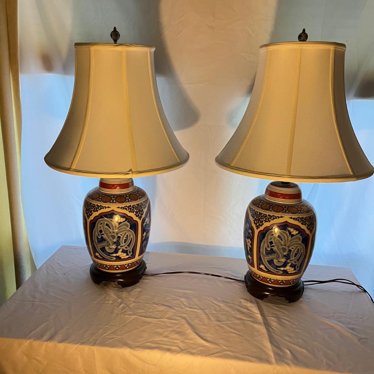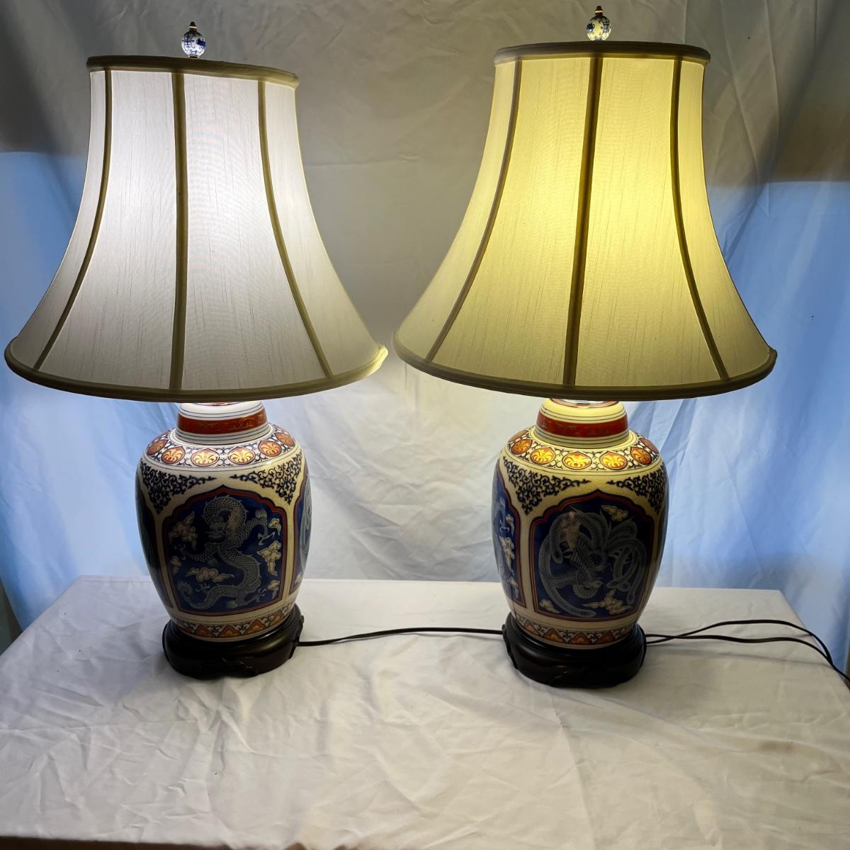 Lot includes a pair Oriental Ginger Jar Style ceramic table lamps with wooden bases. Both lamps worked when tested. Lamps measure 7.5”D x 27” tall without shades.