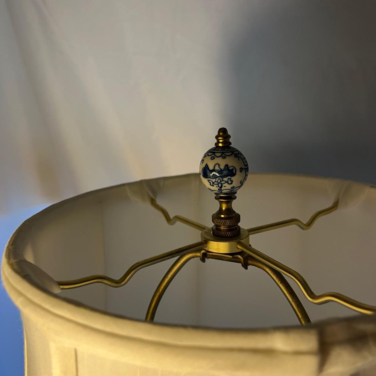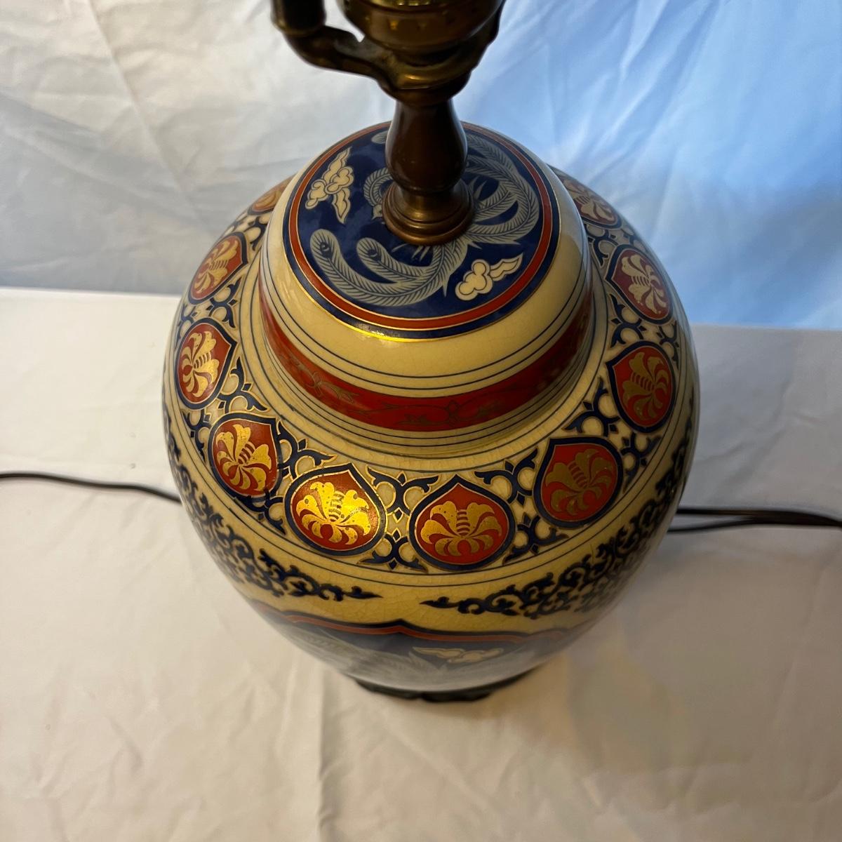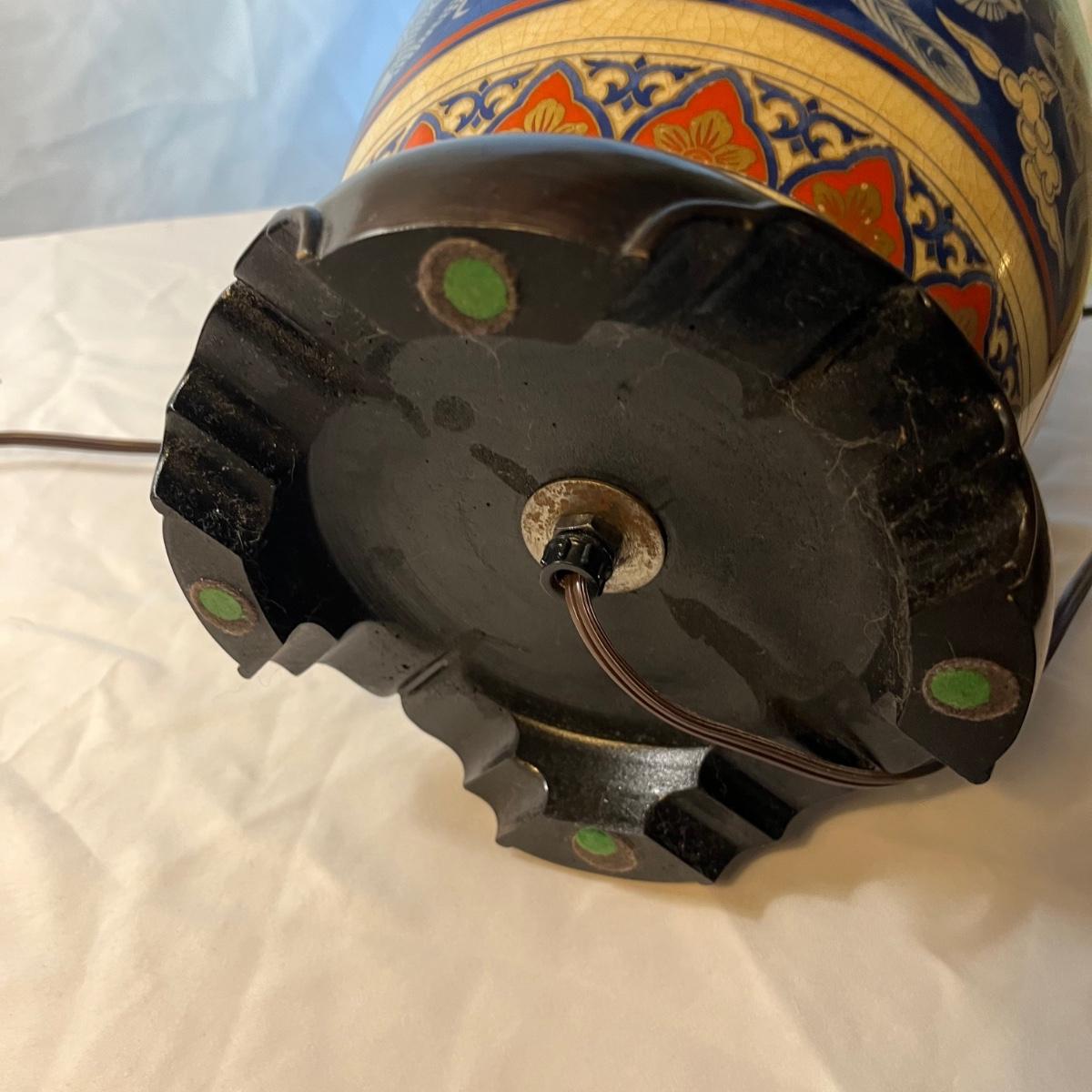 Lot includes a pair Oriental Ginger Jar Style ceramic table lamps with wooden bases. Both lamps worked when tested. Lamps measure 7.5”D x 27” tall without shades.