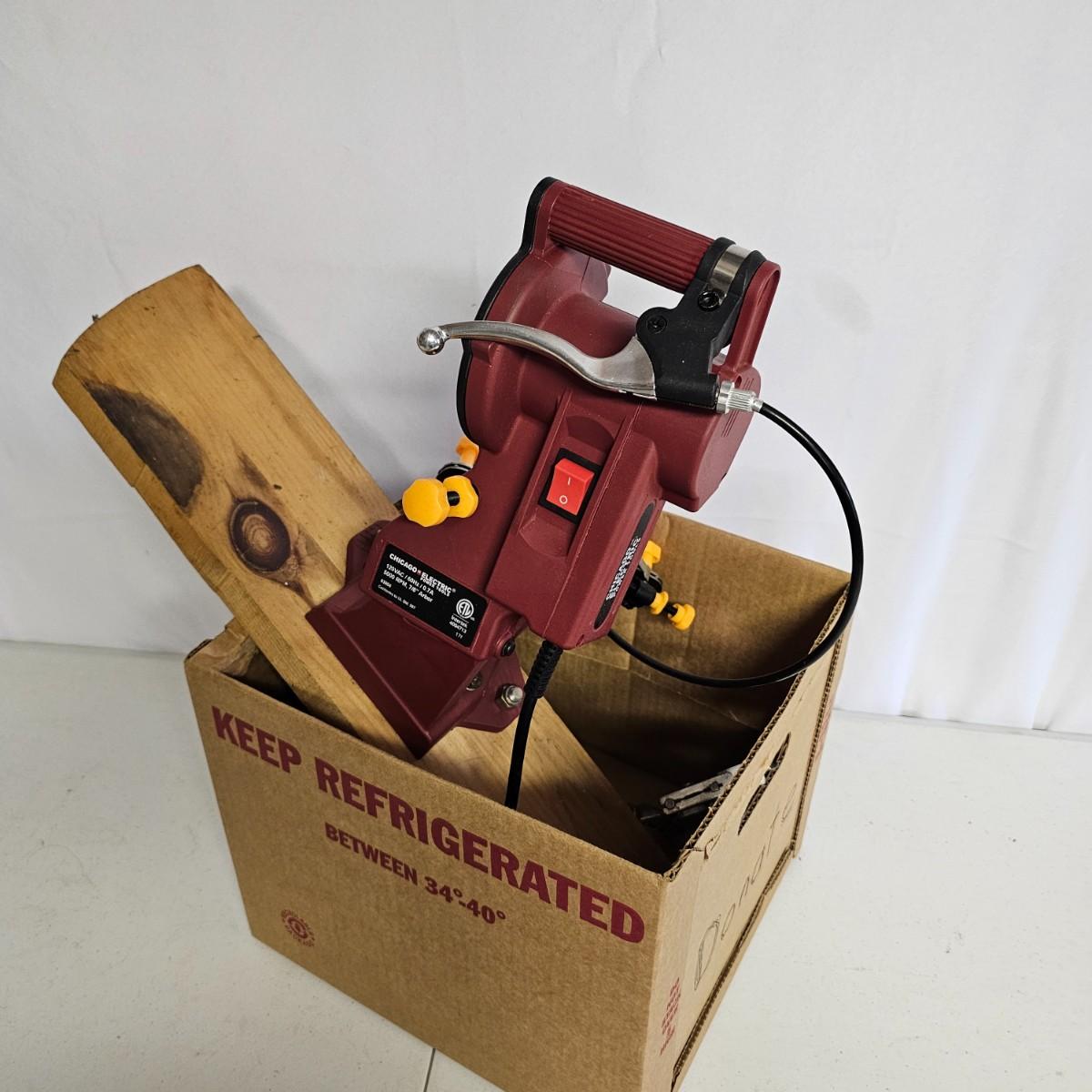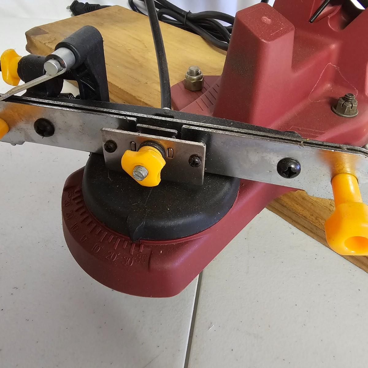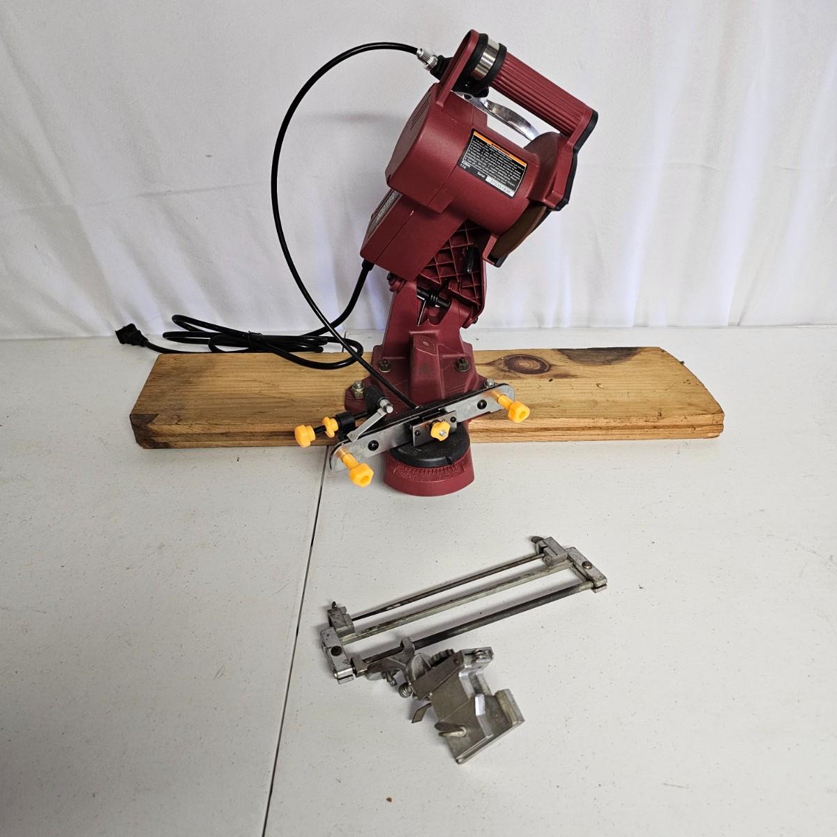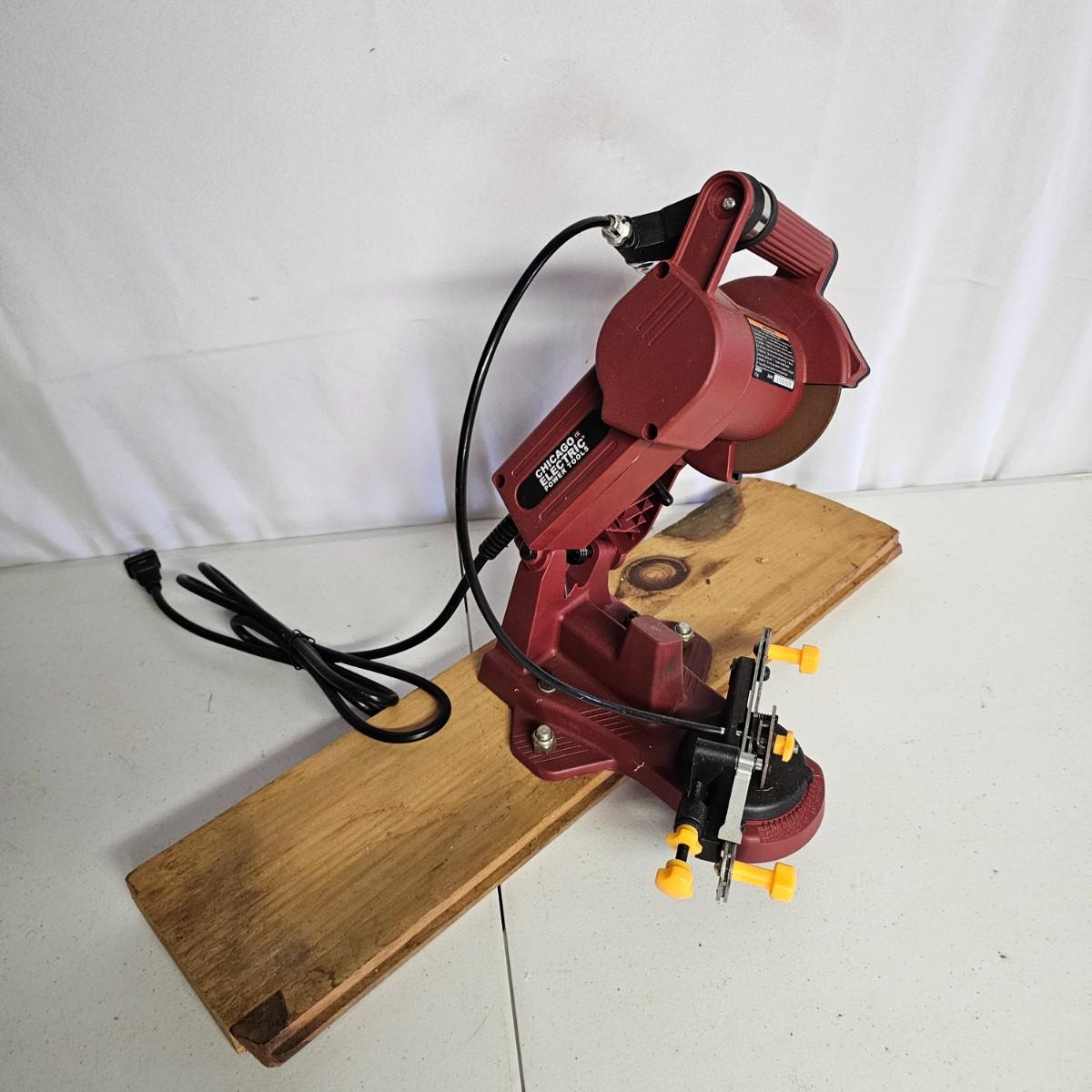 One electric and one manual guide for sharpening chainsaw blades. The Chicago Electric unit has a motorized wheel, clamp and adjustable chain holder. Measures 24" x 11" x 16" H, is mounted on board for stability. Sears Clamp-On File-N-Guide is aluminum, holds file in frame and is also adjustable. Measures 9" x 4" x 7"H. See photos for details. Shipping available.