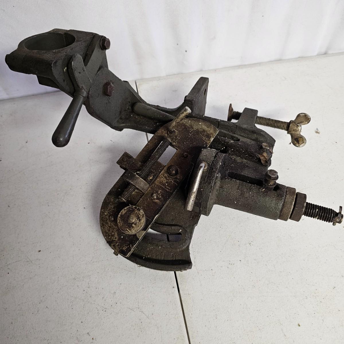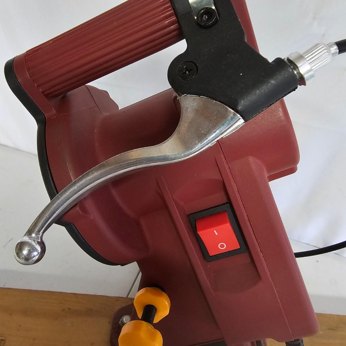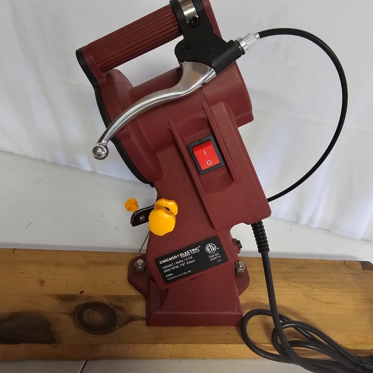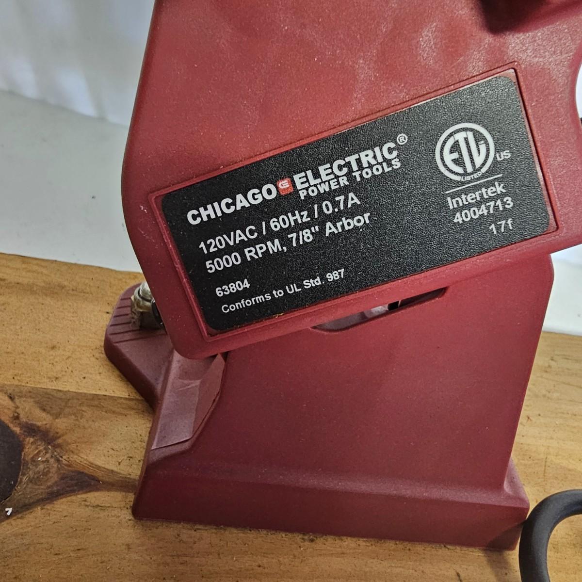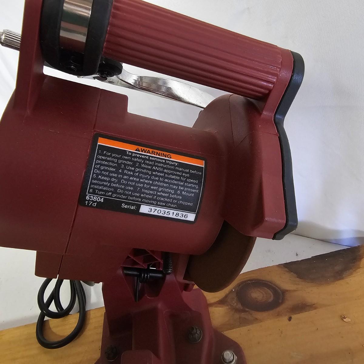 One electric and one manual guide for sharpening chainsaw blades. The Chicago Electric unit has a motorized wheel, clamp and adjustable chain holder. Measures 24" x 11" x 16" H, is mounted on board for stability. Sears Clamp-On File-N-Guide is aluminum, holds file in frame and is also adjustable. Measures 9" x 4" x 7"H. See photos for details. Shipping available.