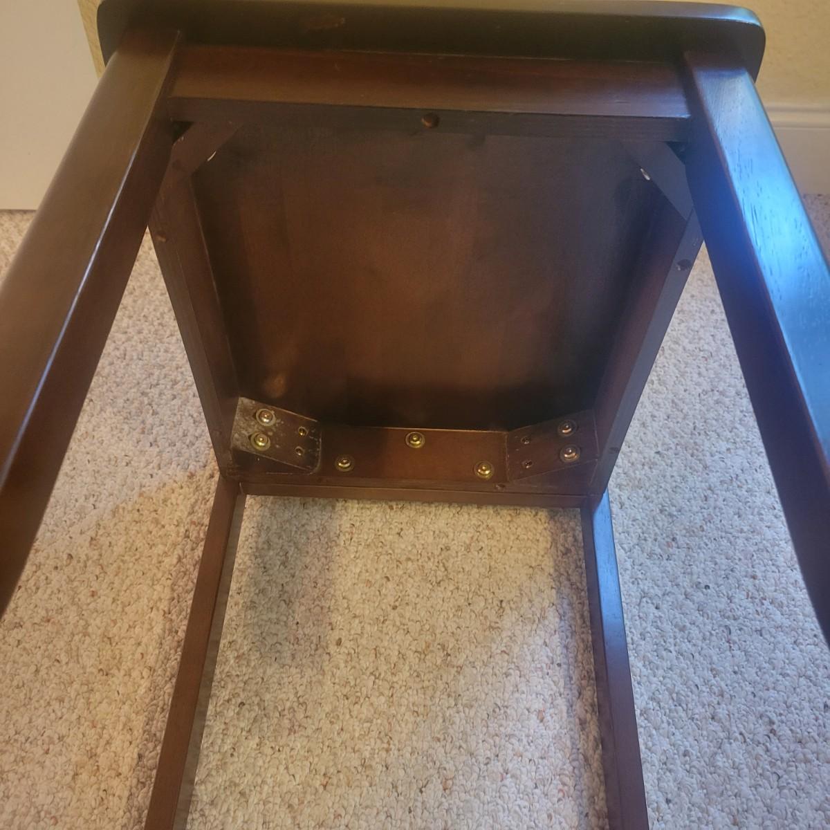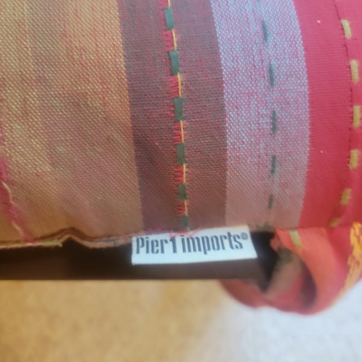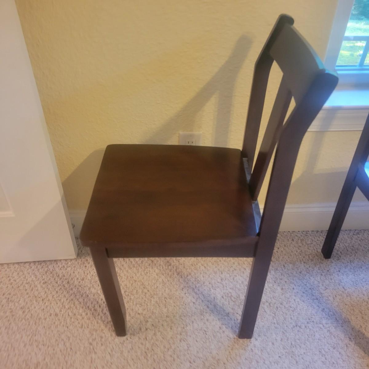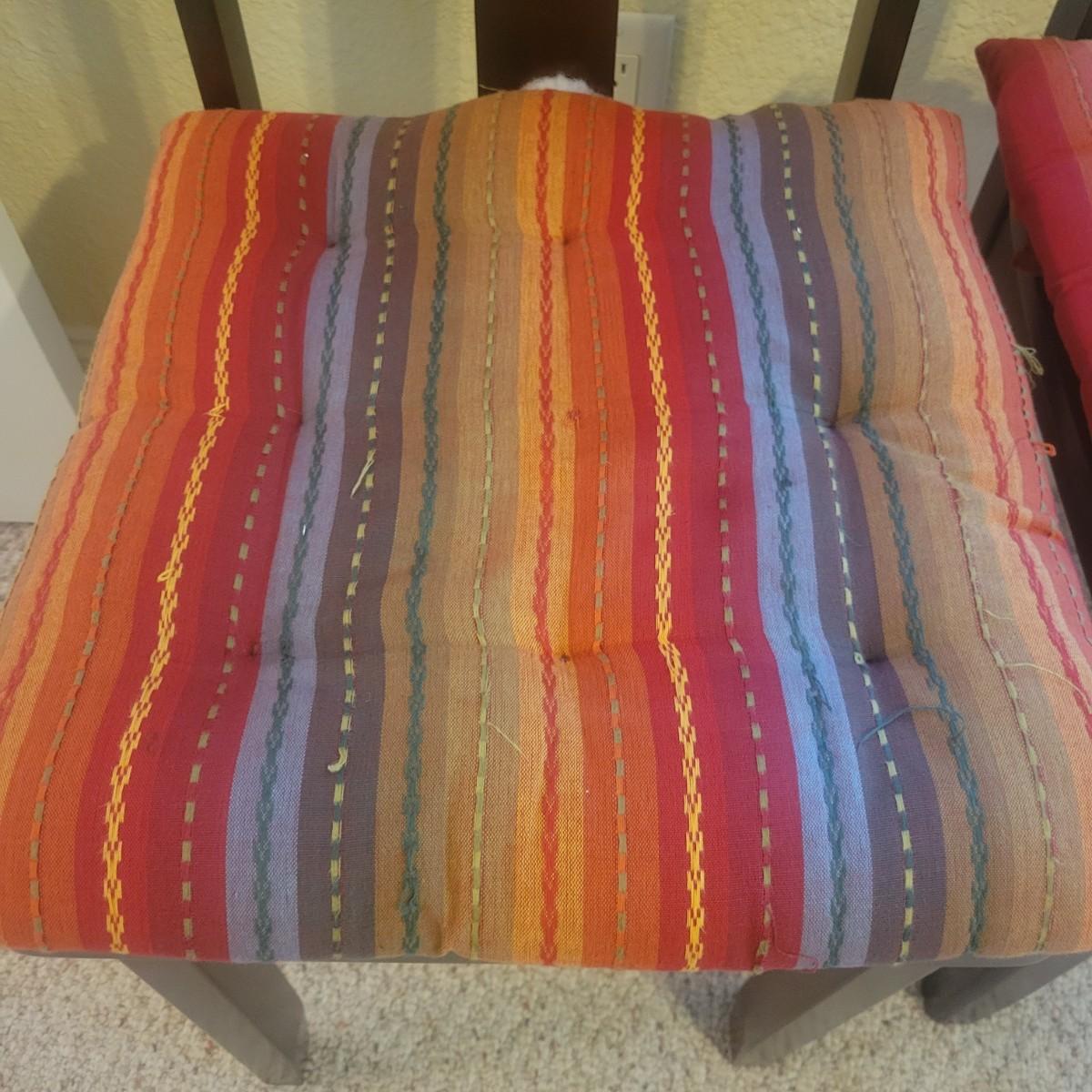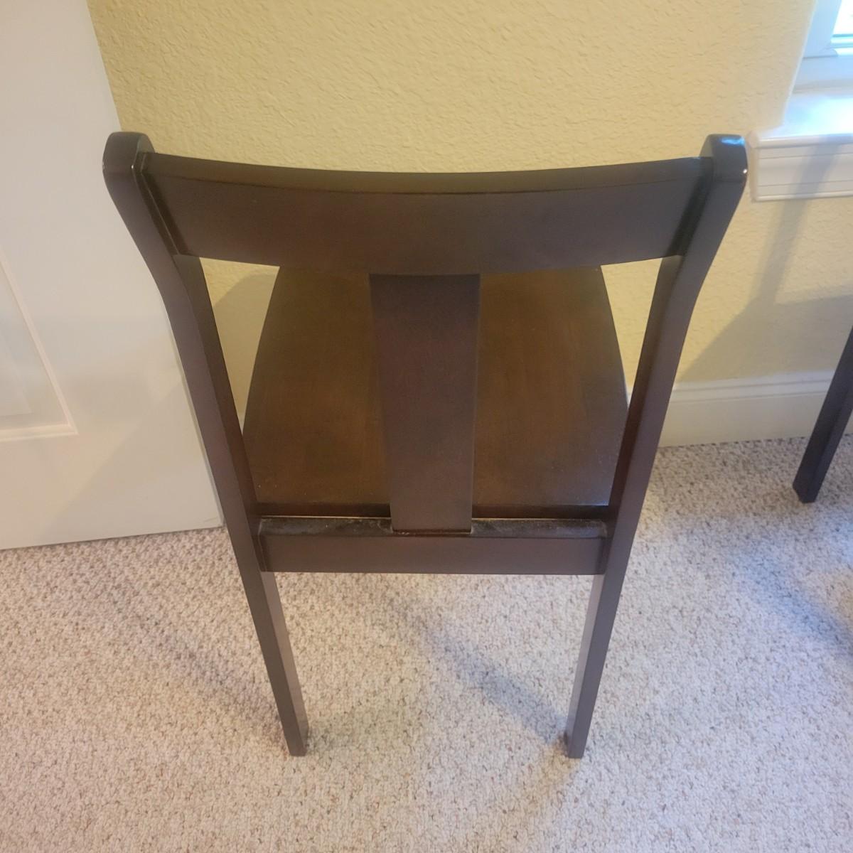 A pair of wooden chairs with a dark walnut finish. There chairs measure approximately 16.5" x 19" x 33"H with a seat height of 17.5". This lot also includes two Pier One seat cushions. Local pickup only