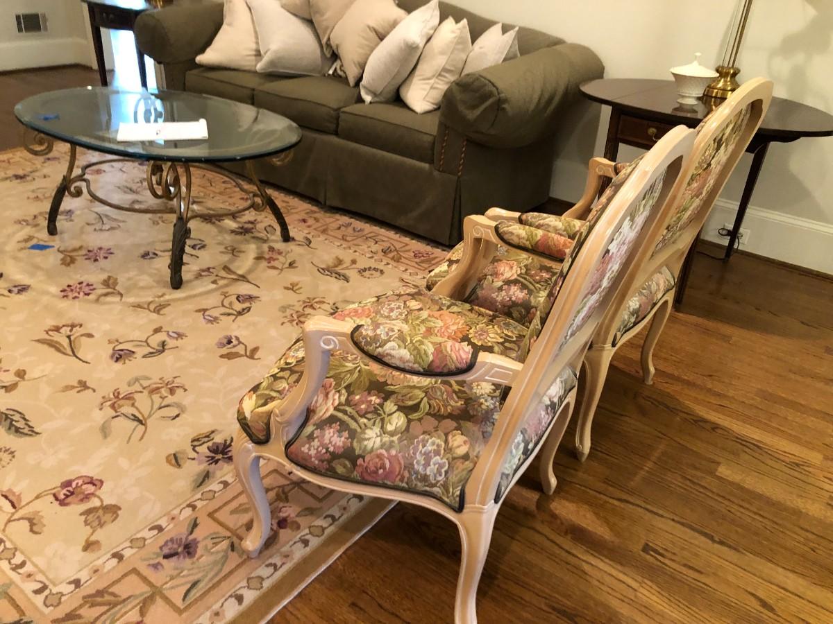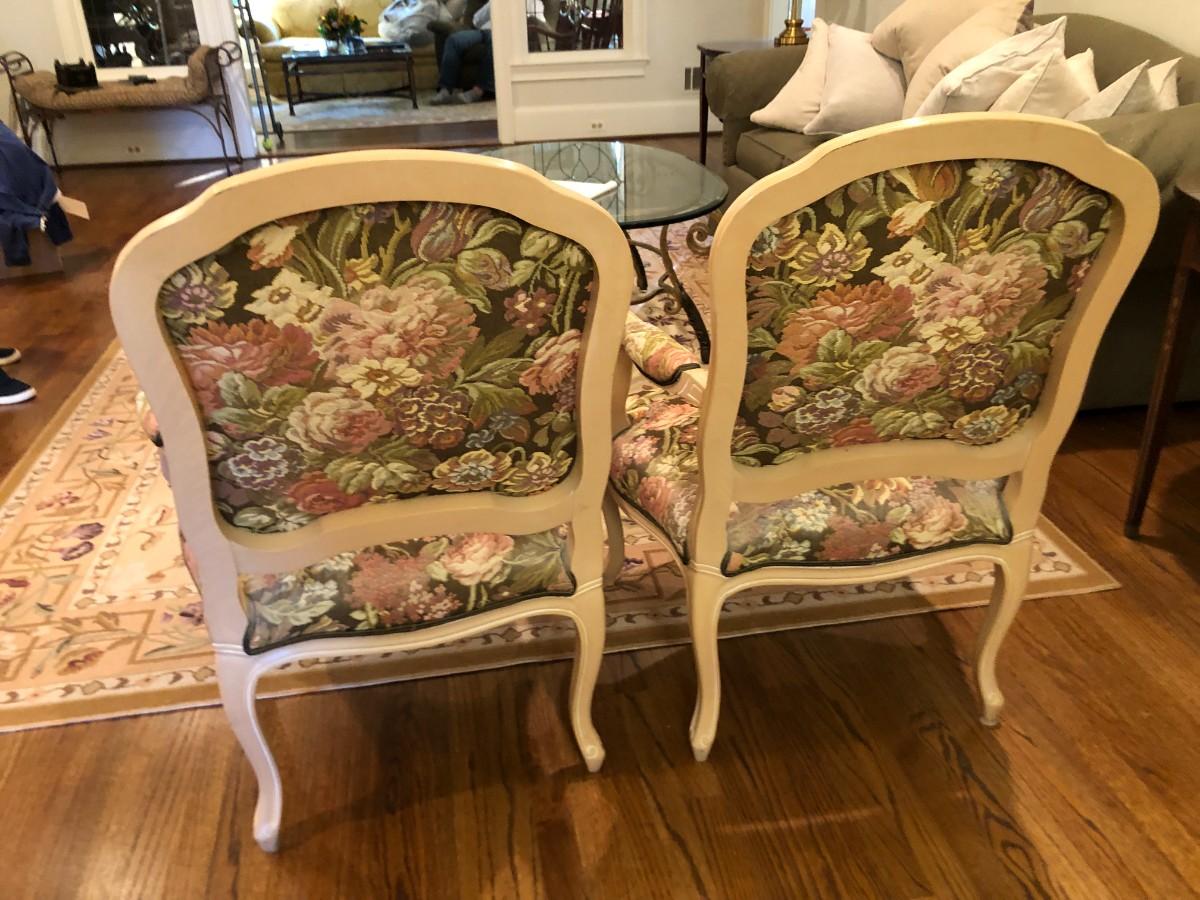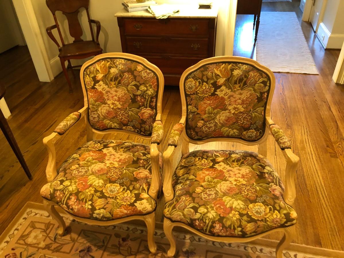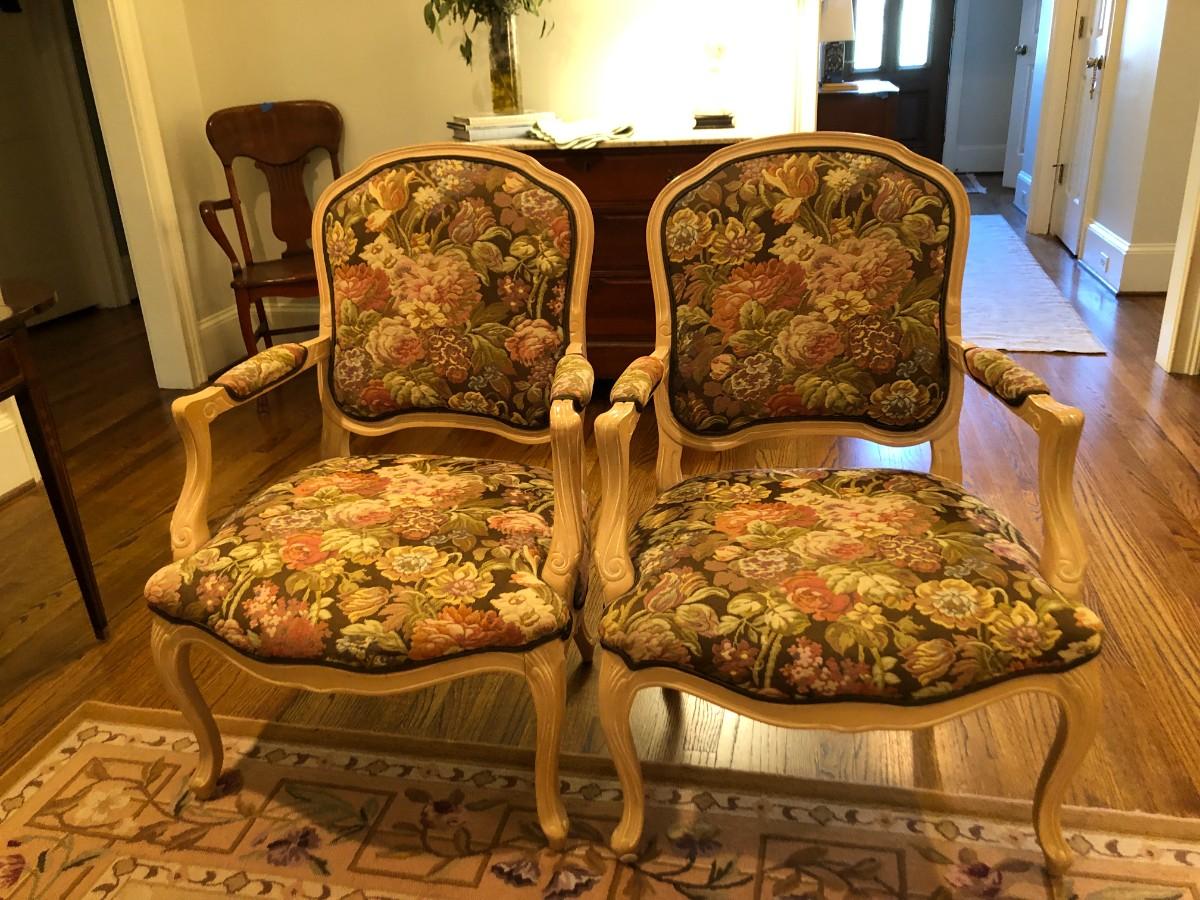 These chairs are in excellent condition; wood frame, arms & legs; floral tapestry upholstery. Each chair measures 26"W x 26"D x 36"H