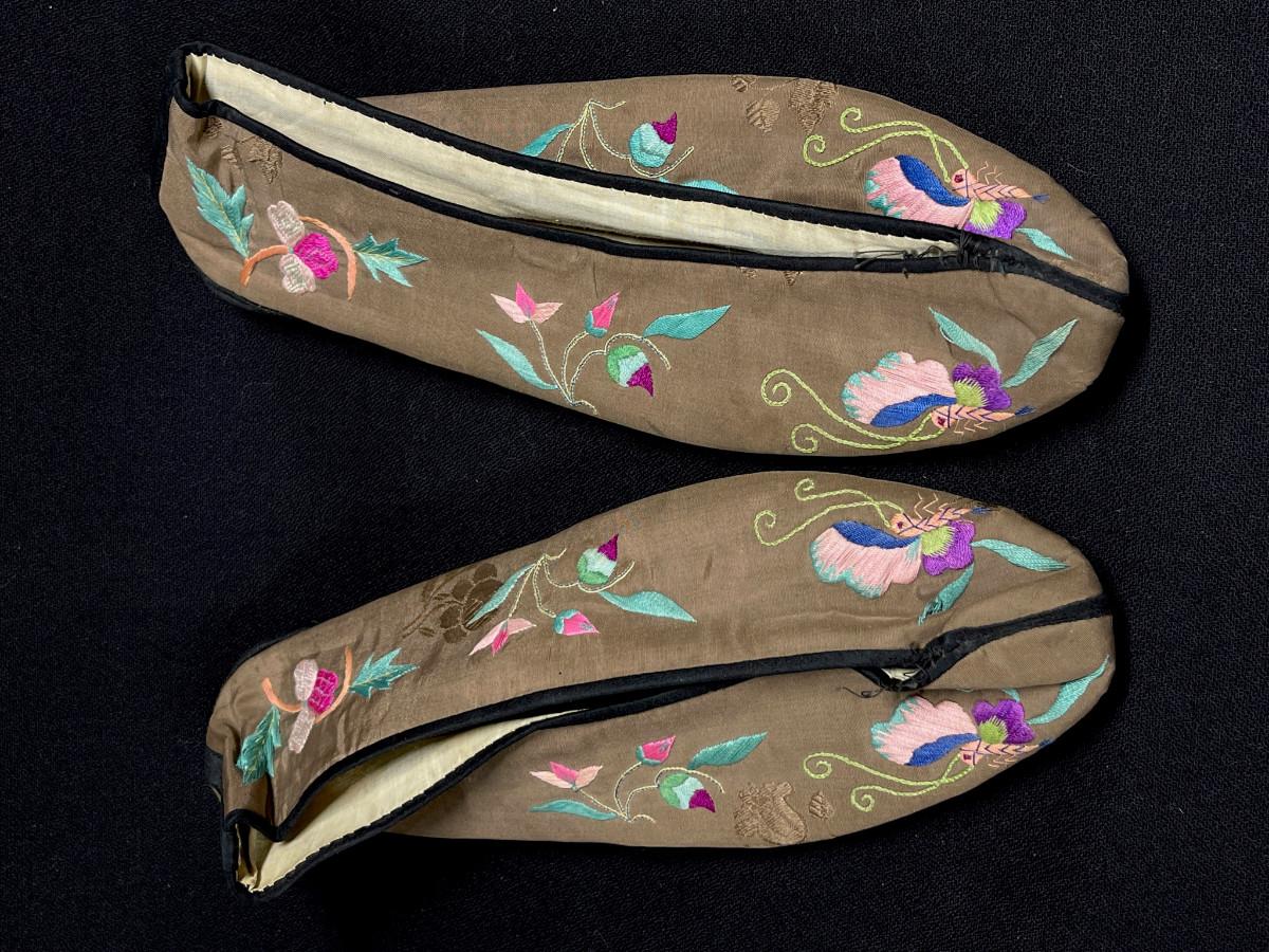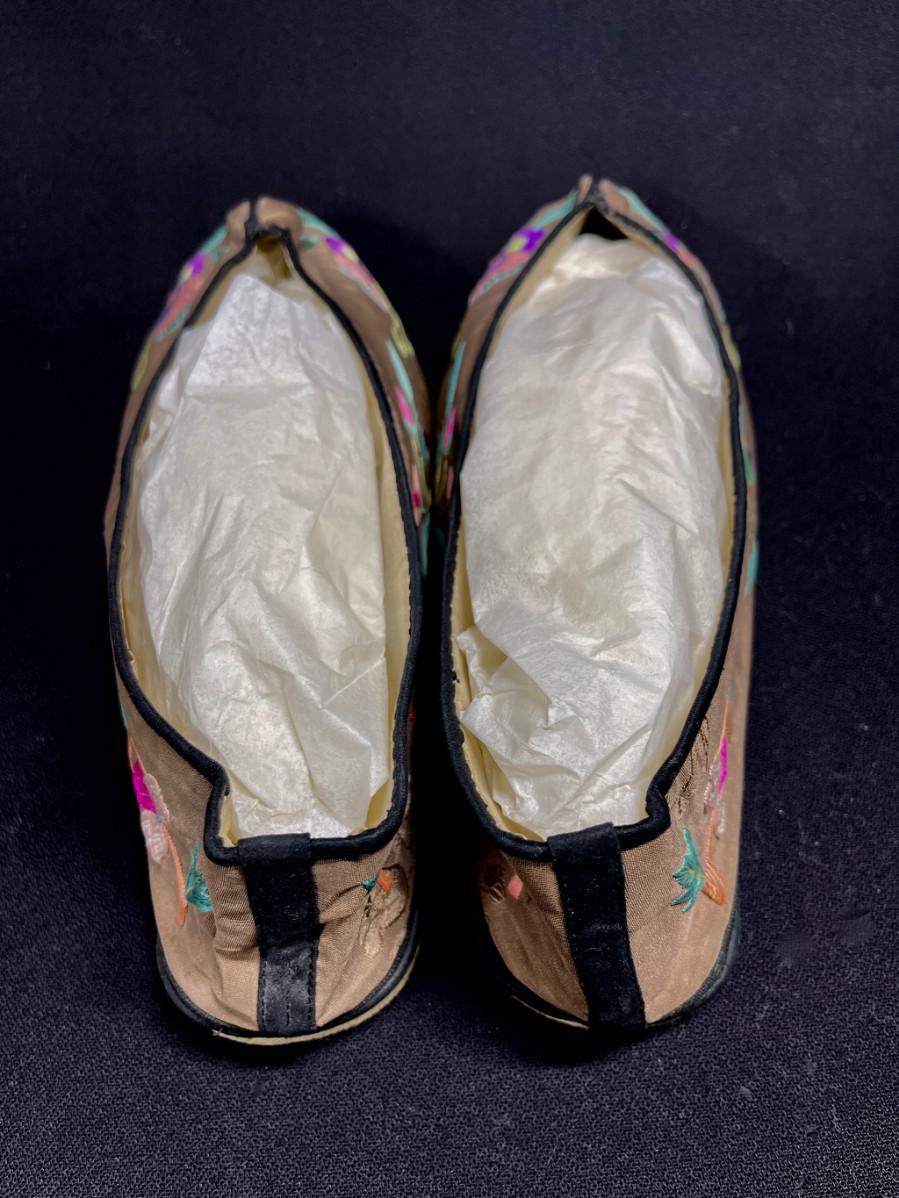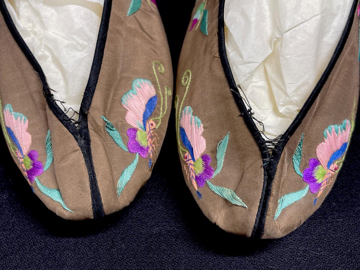 DESCRIPTION: This pair of ecru antique Chinese slippers are and constructed and embroidered with butterflies at the toe, and floral flourishes at the top center and heel with black piping and set onto hand stitched soles. Most photos show the slippers stuffed with tissue.