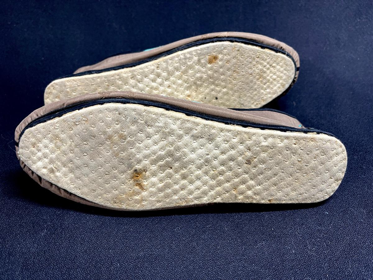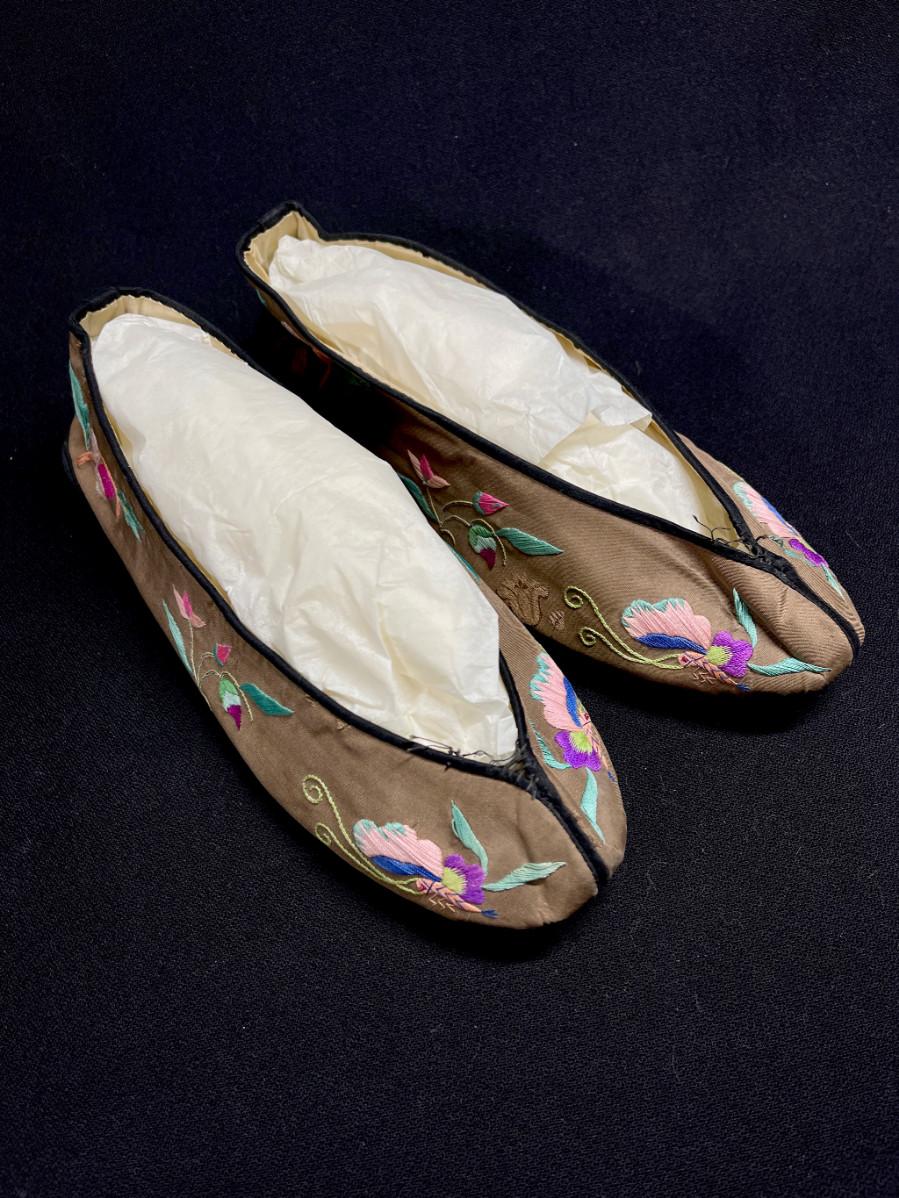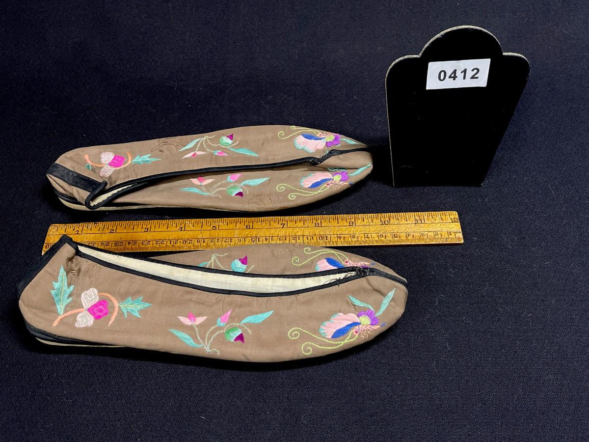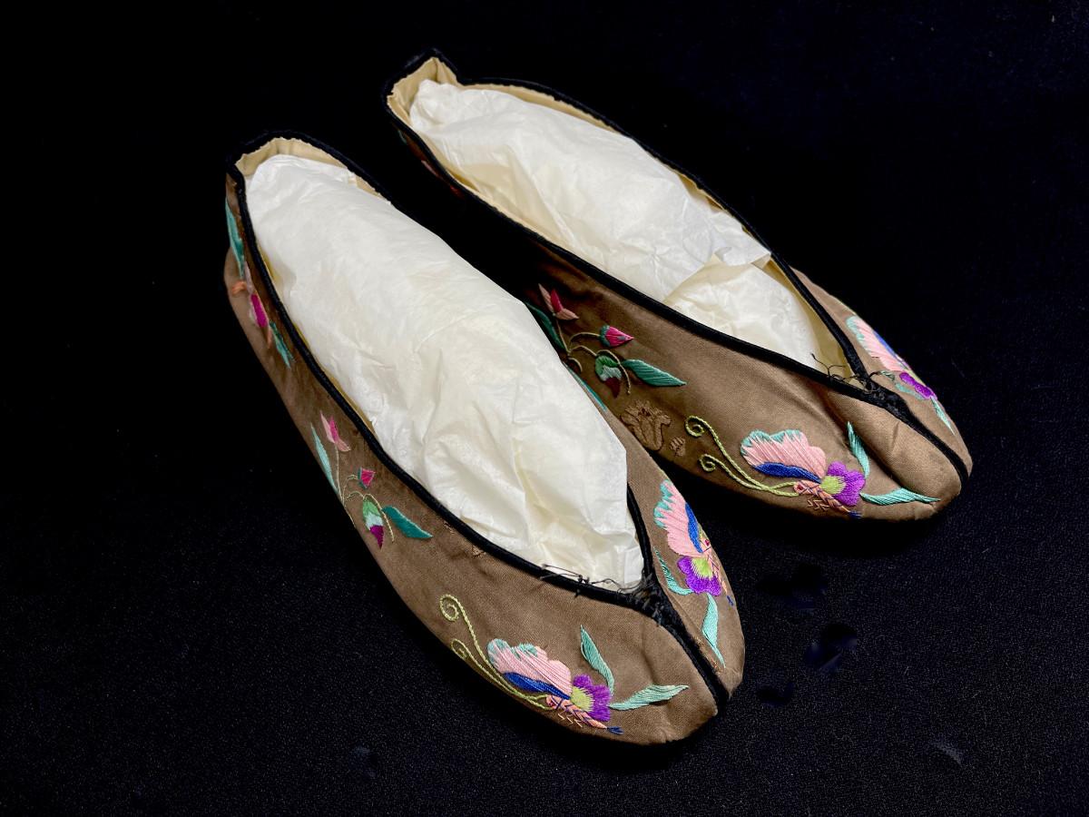 DESCRIPTION: This pair of ecru antique Chinese slippers are and constructed and embroidered with butterflies at the toe, and floral flourishes at the top center and heel with black piping and set onto hand stitched soles. Most photos show the slippers stuffed with tissue.
