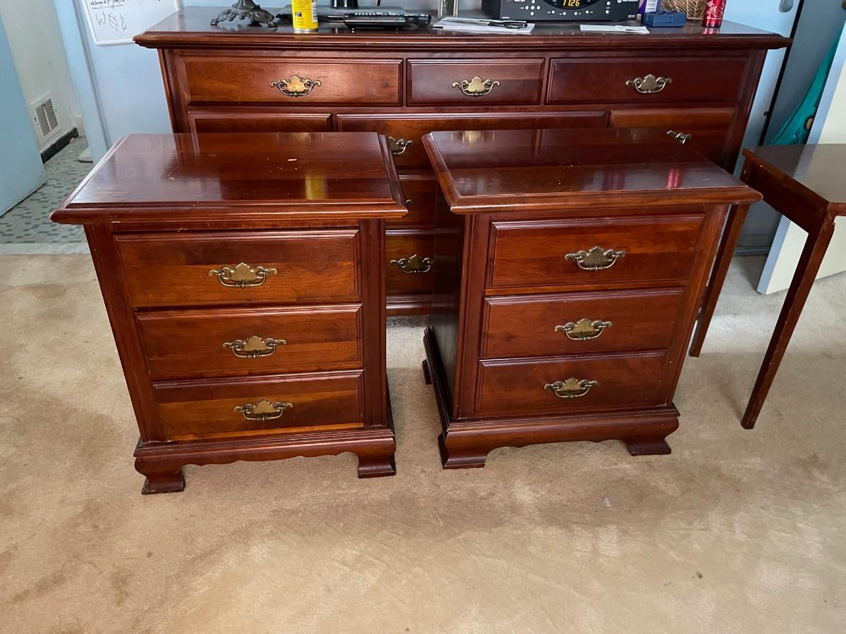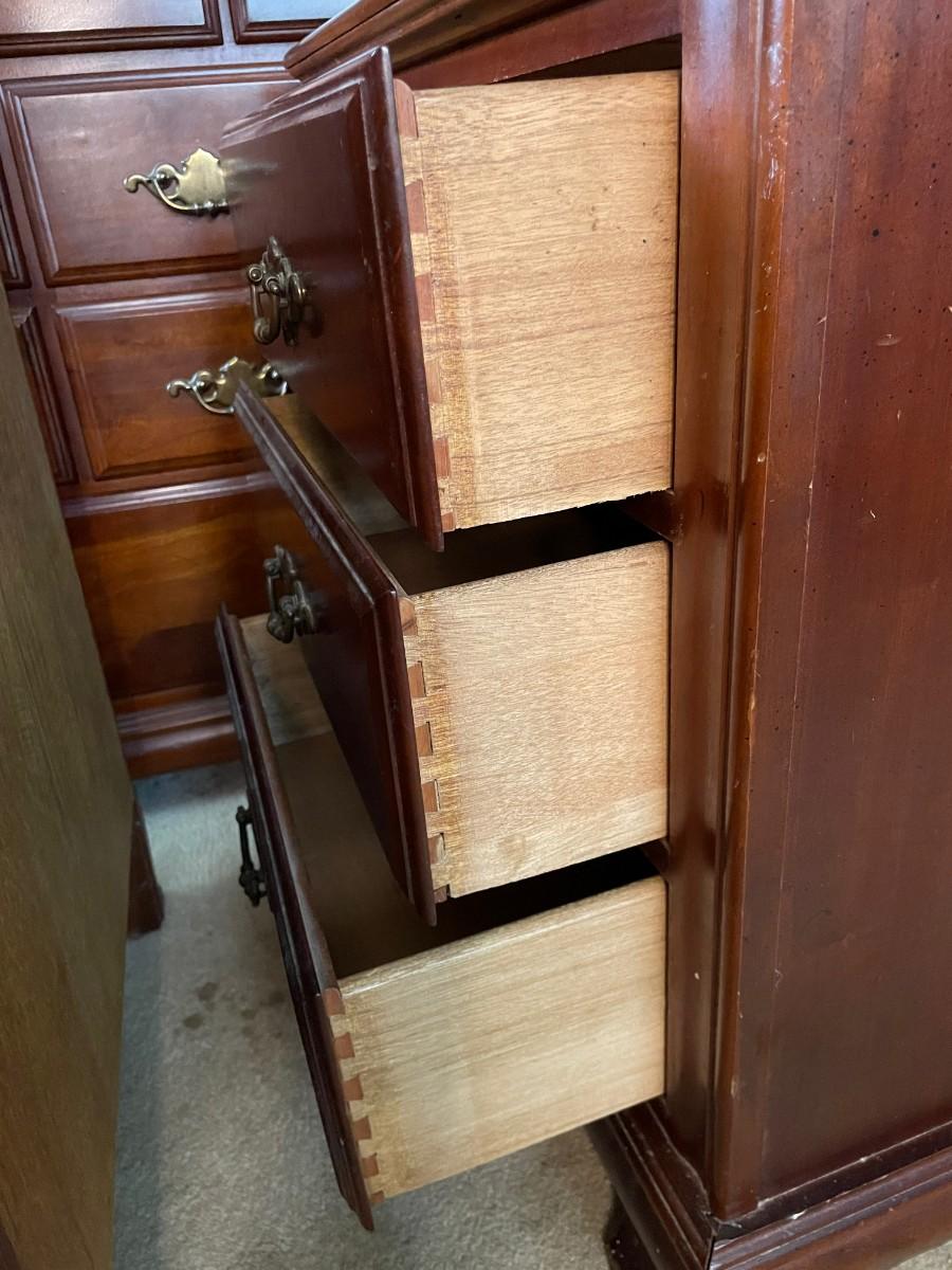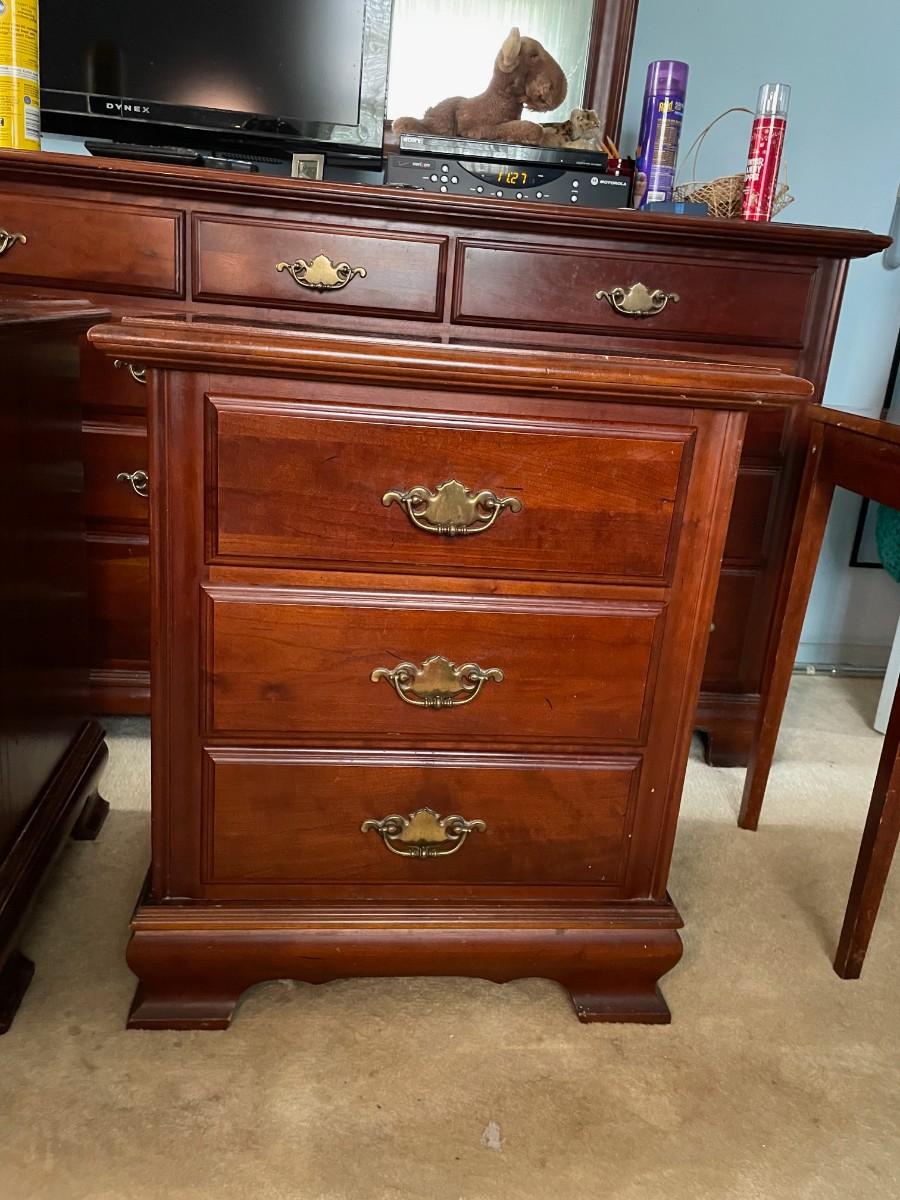 22 1/2 x 16 1/2 x 26 1/2(H). Sold wood. Some wearing. Drawers function just fine.
