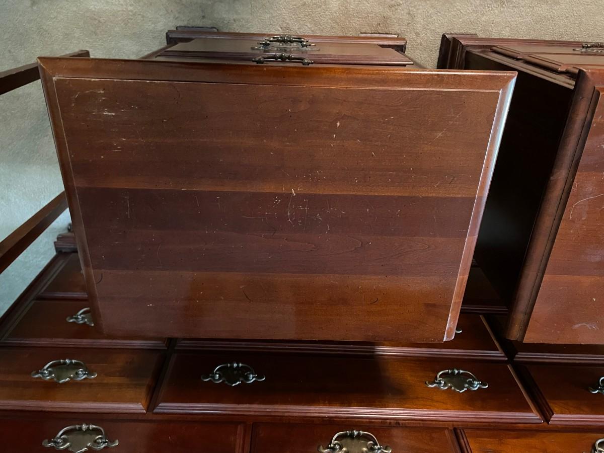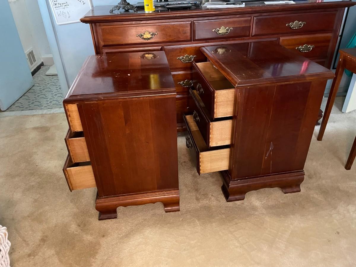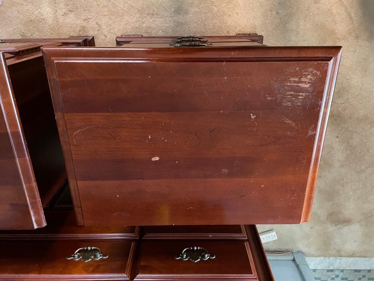 22 1/2 x 16 1/2 x 26 1/2(H). Sold wood. Some wearing. Drawers function just fine.