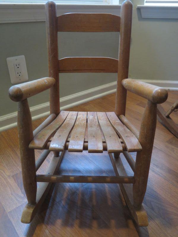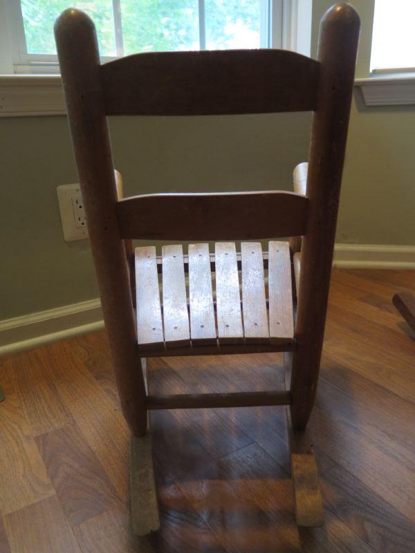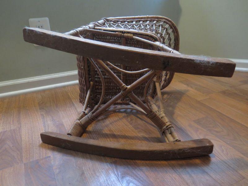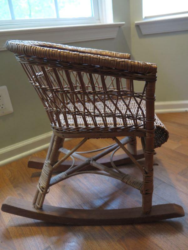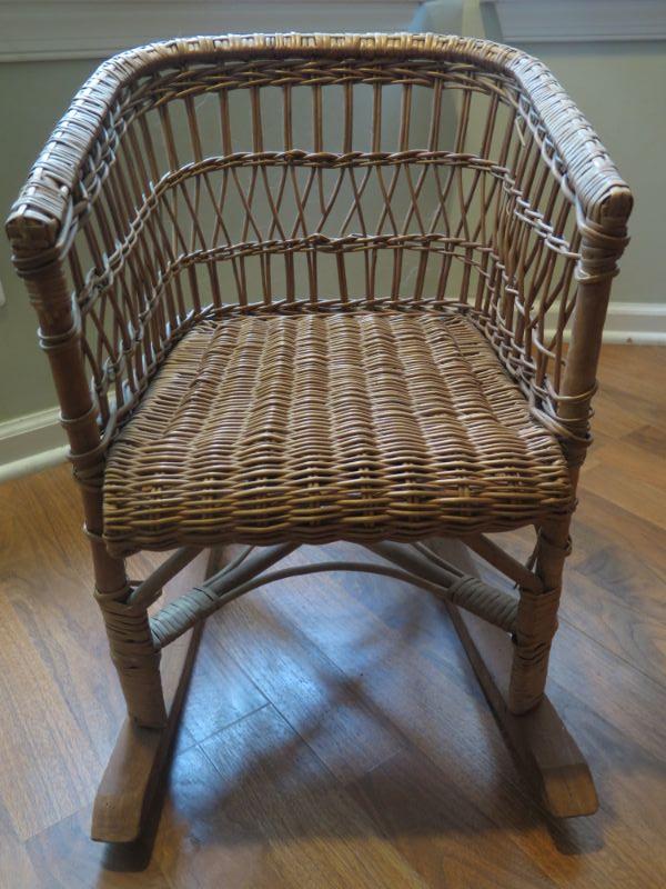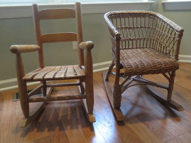 Wood slat and wicker children's rockers. **Please read Terms and Conditions before placing a bid. Pick up is Sunday, September 1, 2019 from 10am to 4pm in Williamstown. All sales are final. All sales are as is, where is. Please review all photos. Any props included in photos are not included in listing. All measurements are approximate. Comes from a home with cats.