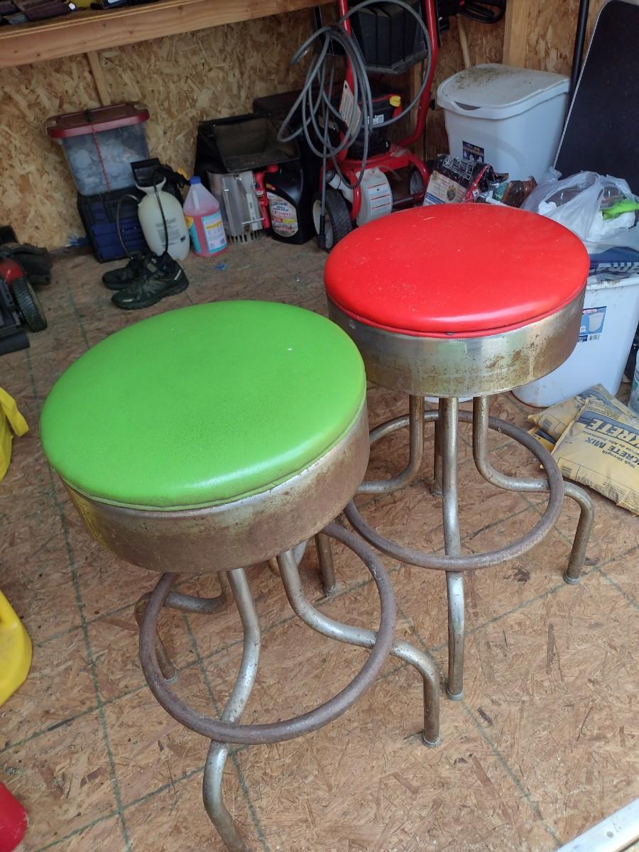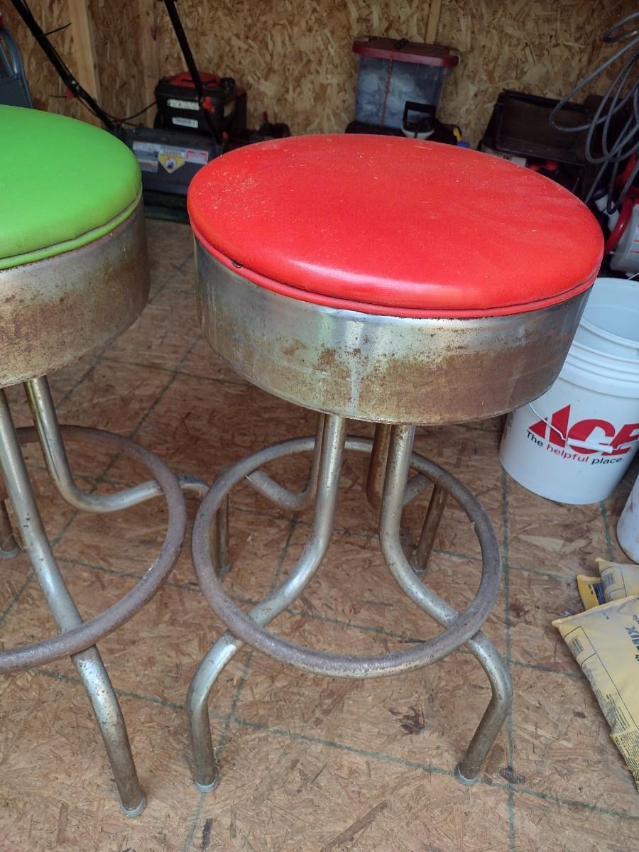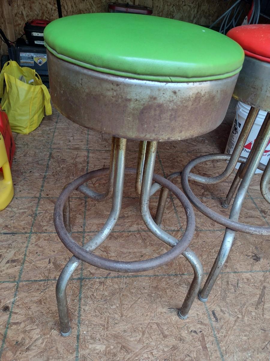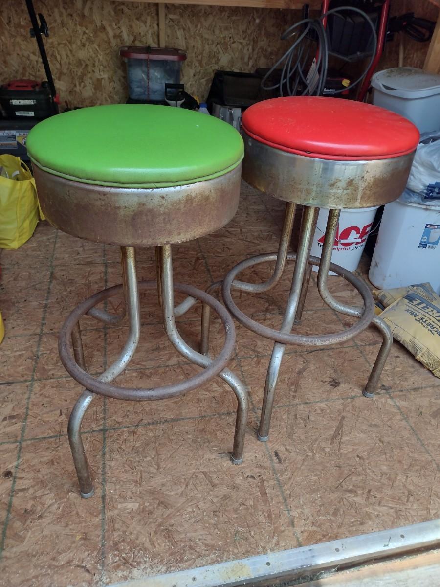 Pair of Chrome Frame Swivel Stools with Upholstered Seat. Will need to be polished